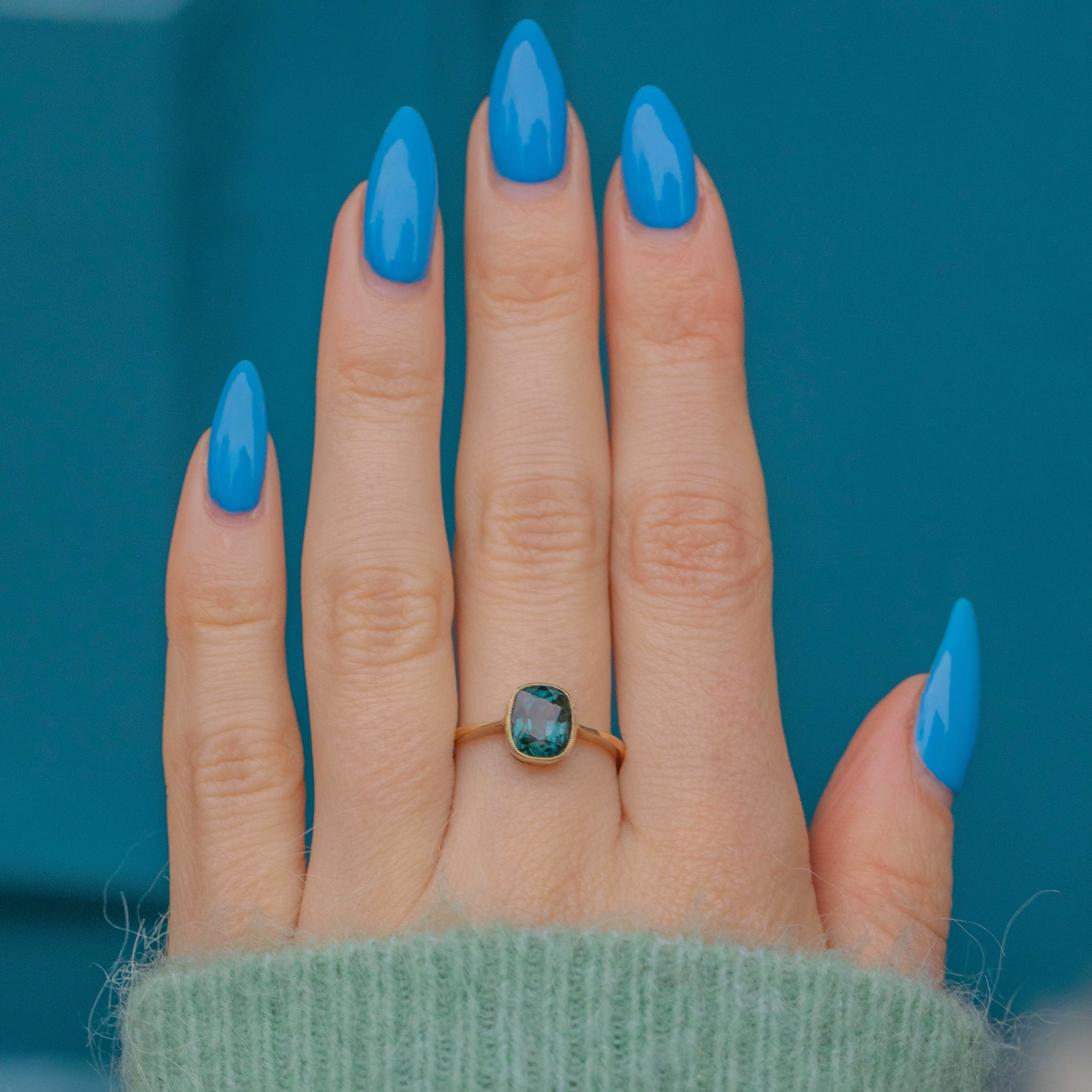 Her bezel set gemstone shimmers like a hidden lagoon, her dark teal hues shifting with every glance, capturing both light and intrigue. Set in elegant 18ct Gold, this timeless piece exudes an aura of romance and rarity, perfect for anyone enchanted by 0.90cts dark "London Blue" teal tones!