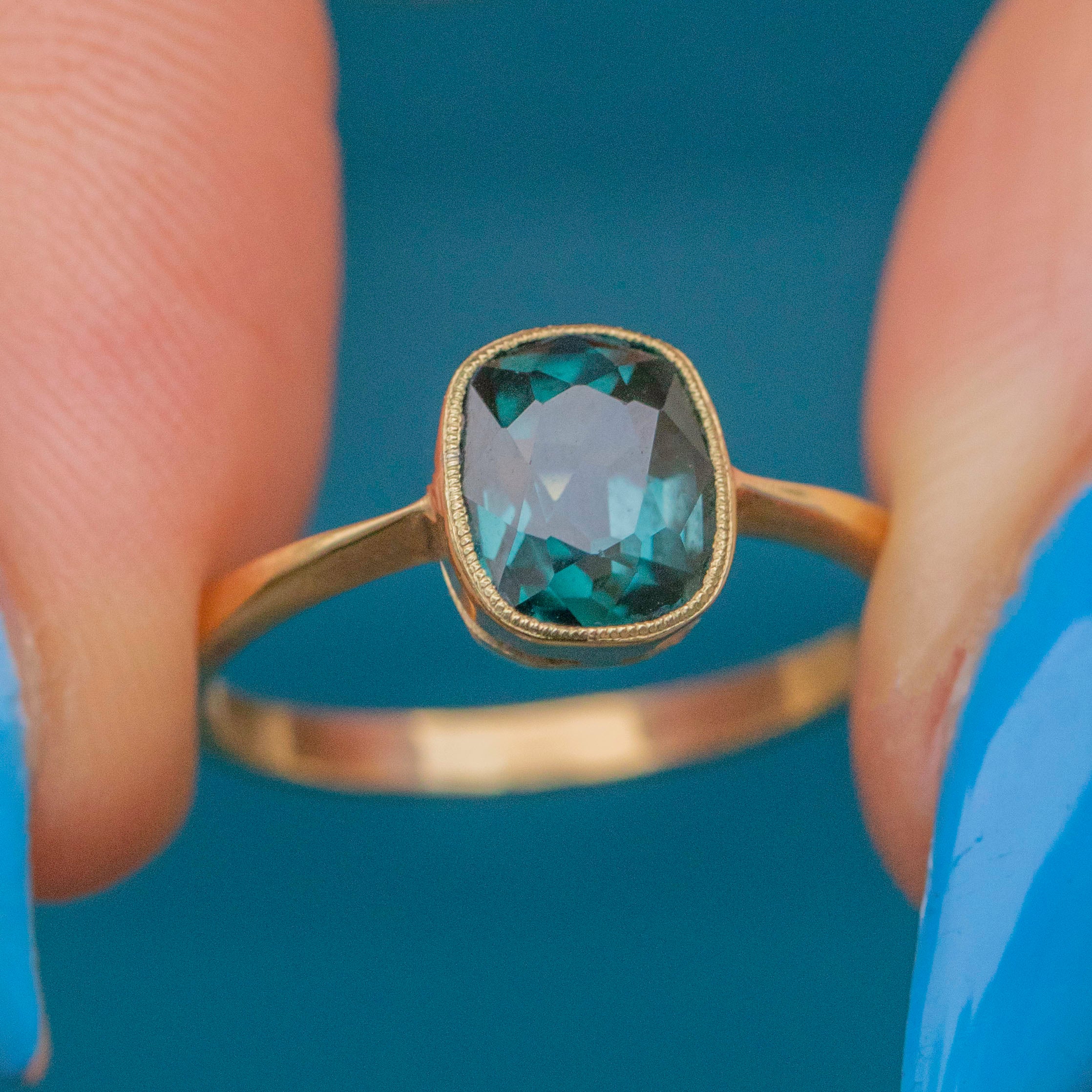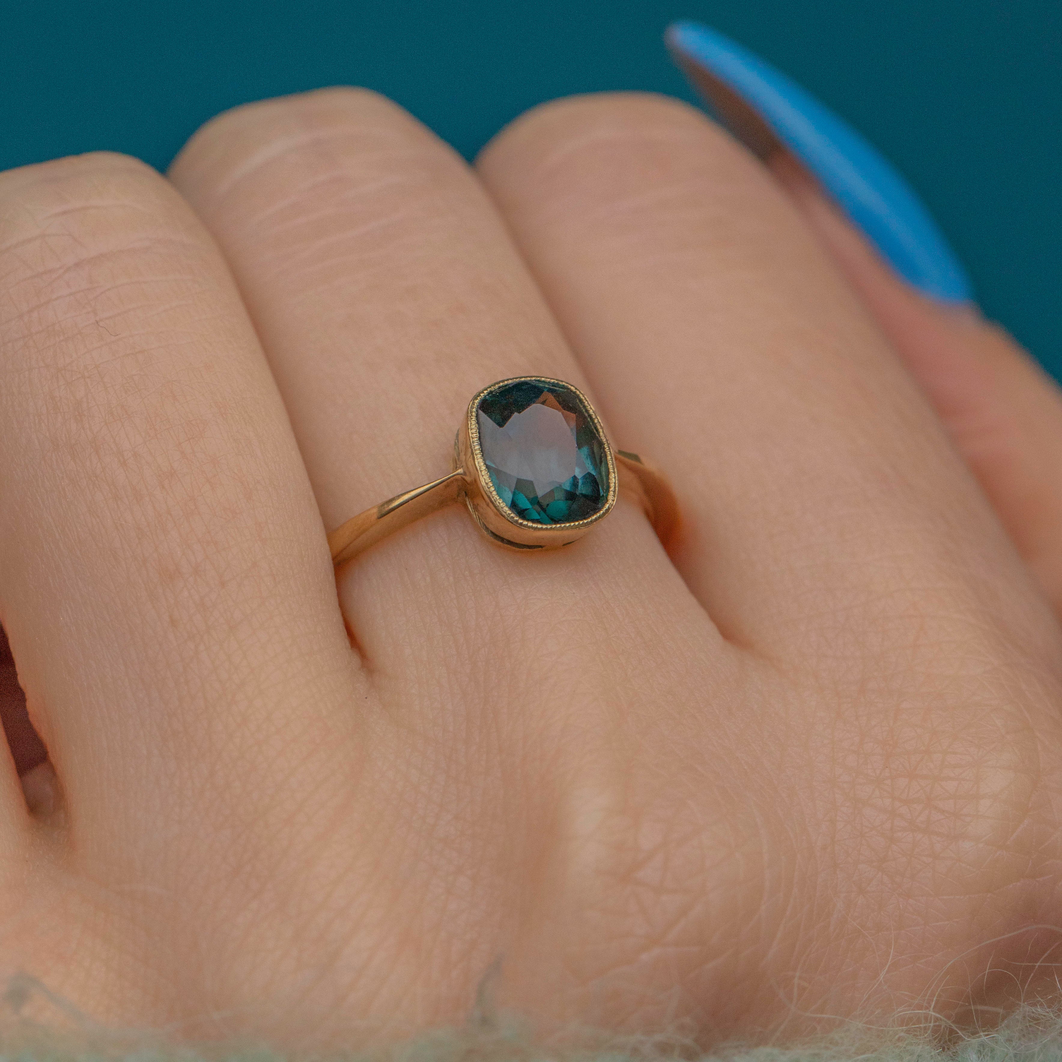 This exquisite antique 18ct Gold teal Topaz ring glows with a captivating, deep blue hue as rich as the twilight sky, evoking the mystery of ocean depths.