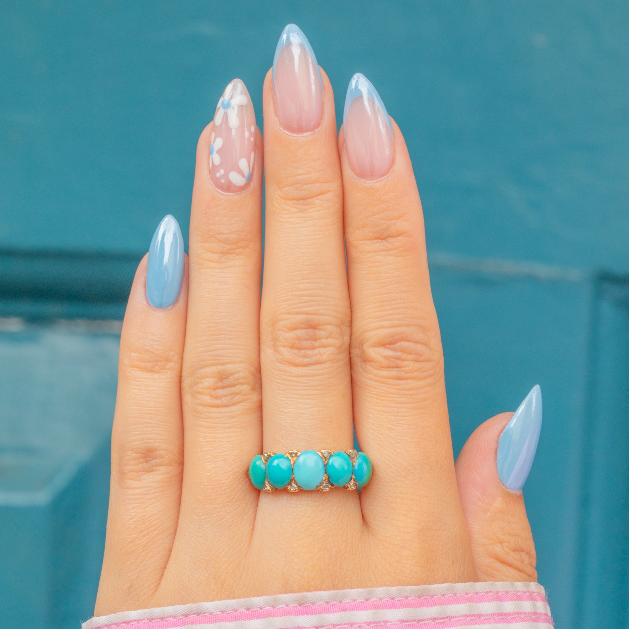 A striking Victorian Turquoise ring, with rose-cut Diamond spacers for added sparkle. A classic Victorian combination, this 18ct Gold ring provides the finger with great coverage due to its half-hoop design.