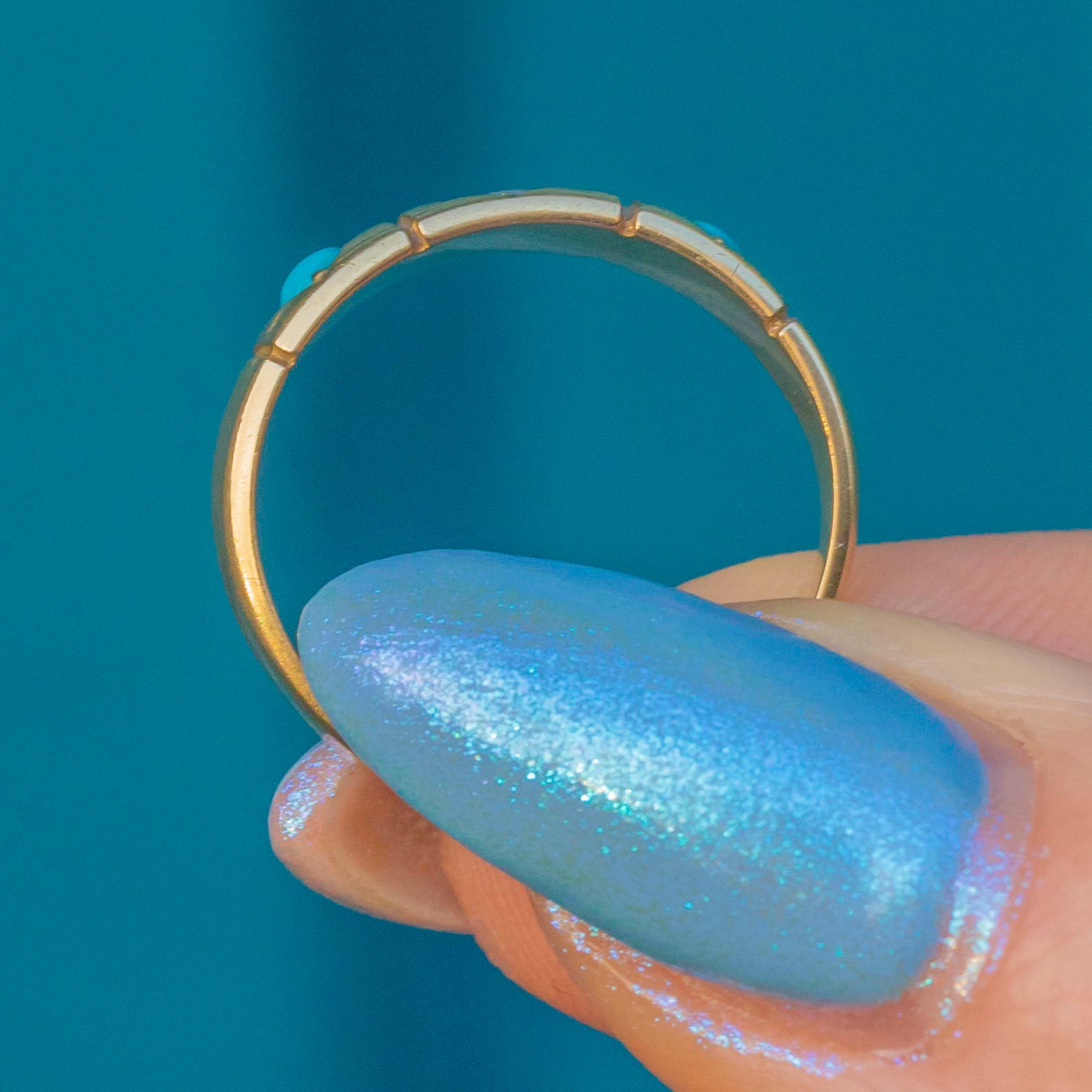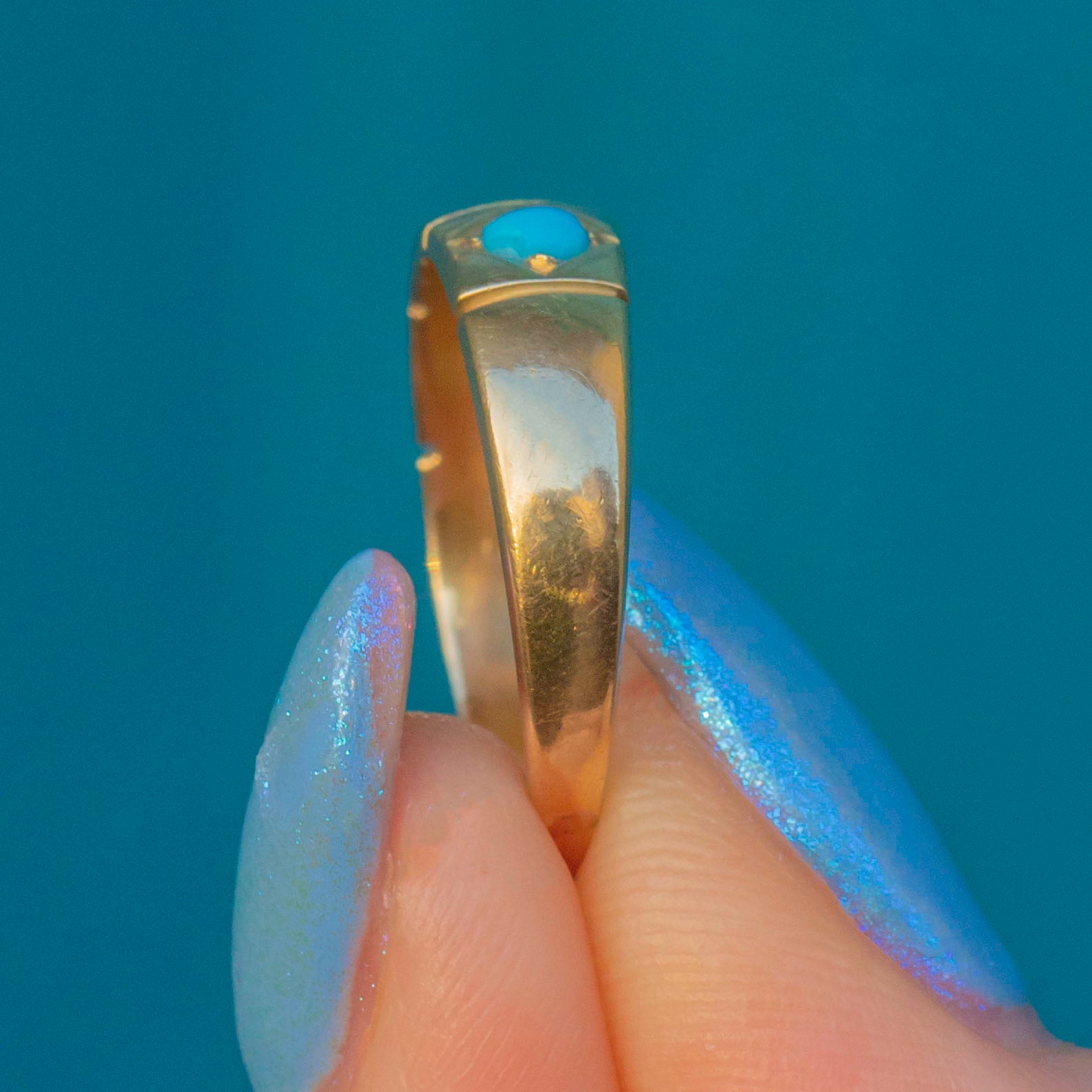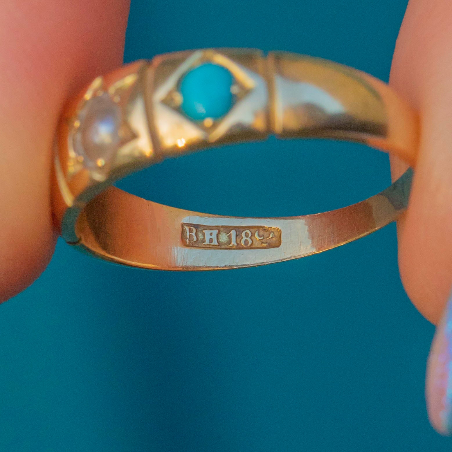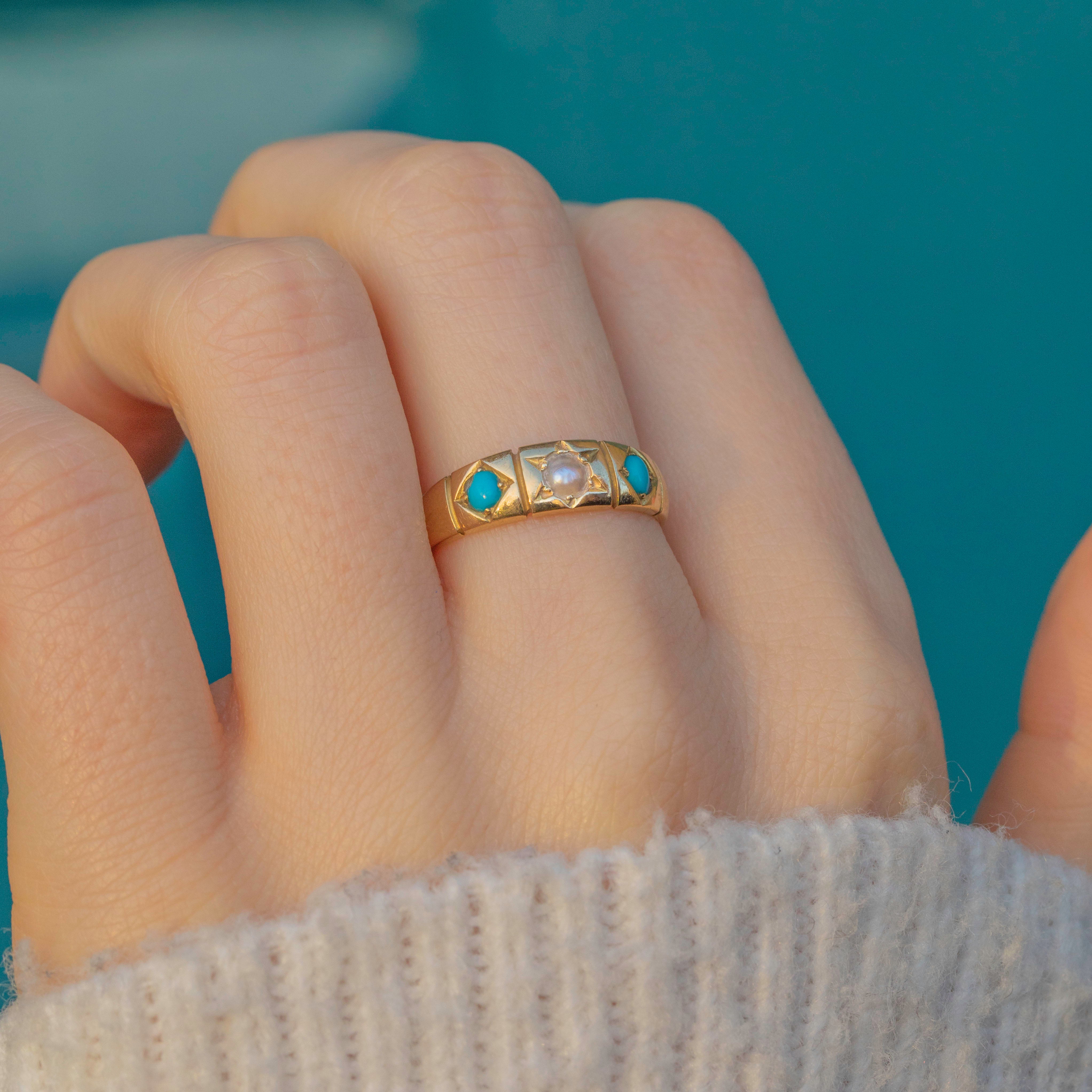 white Pearl, flaked by two peacock blue Turquoise stones, complemented by the rich 18ct Gold! This antique gypsy ring will soon become a firm favourite of yours!