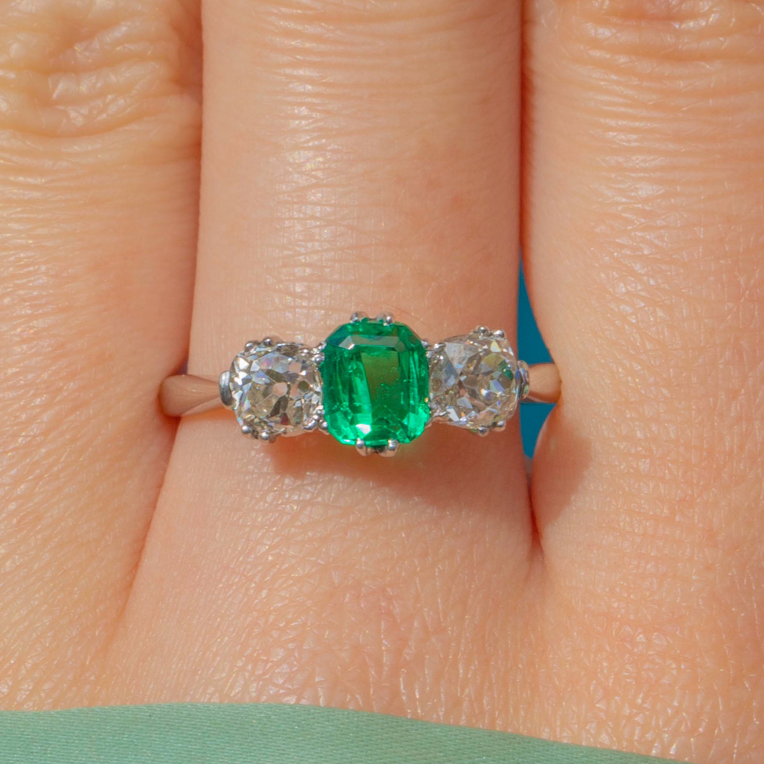 Antique 18ct White Gold Emerald Diamond Trilogy Ring, 0.80ct Old Mine Cut Diamonds