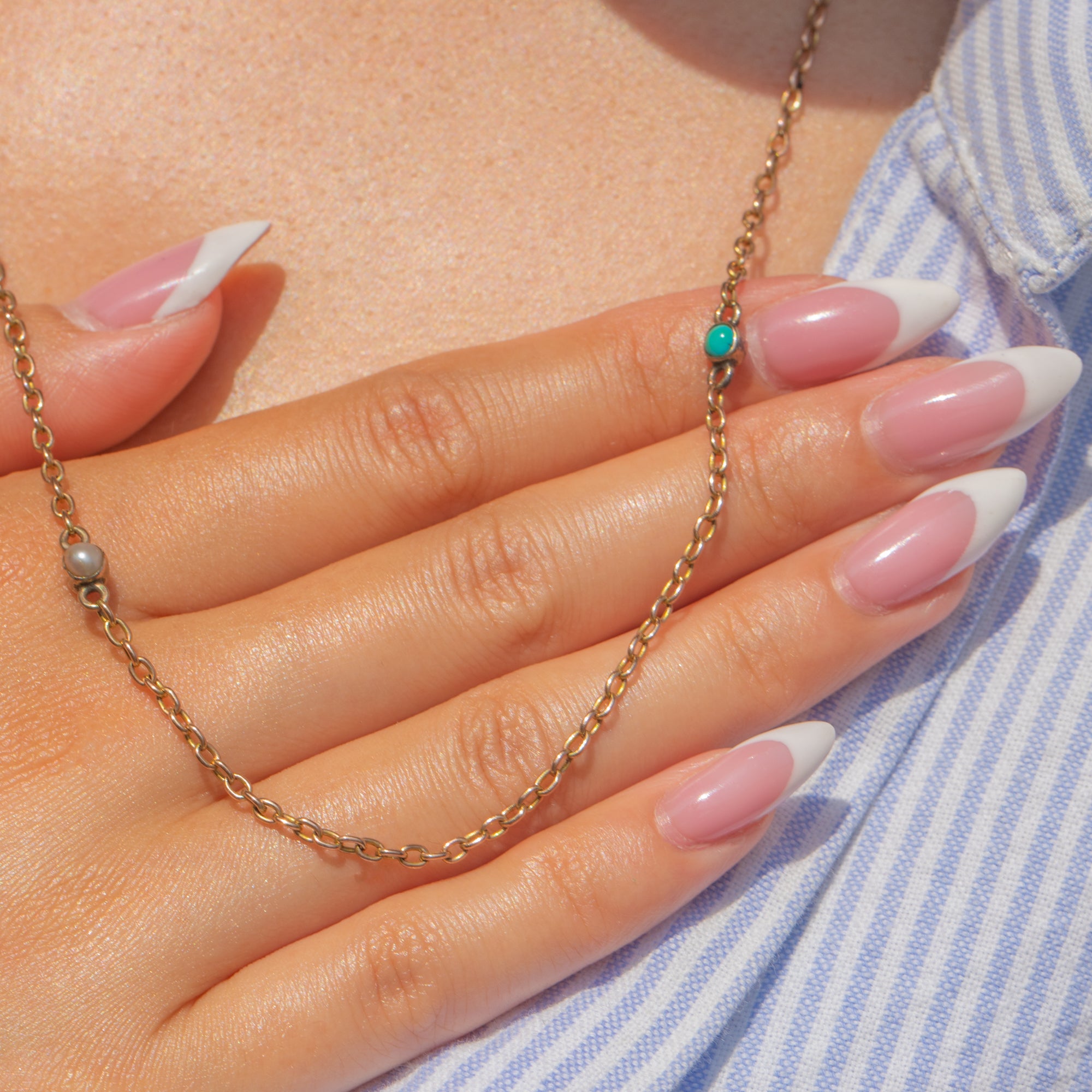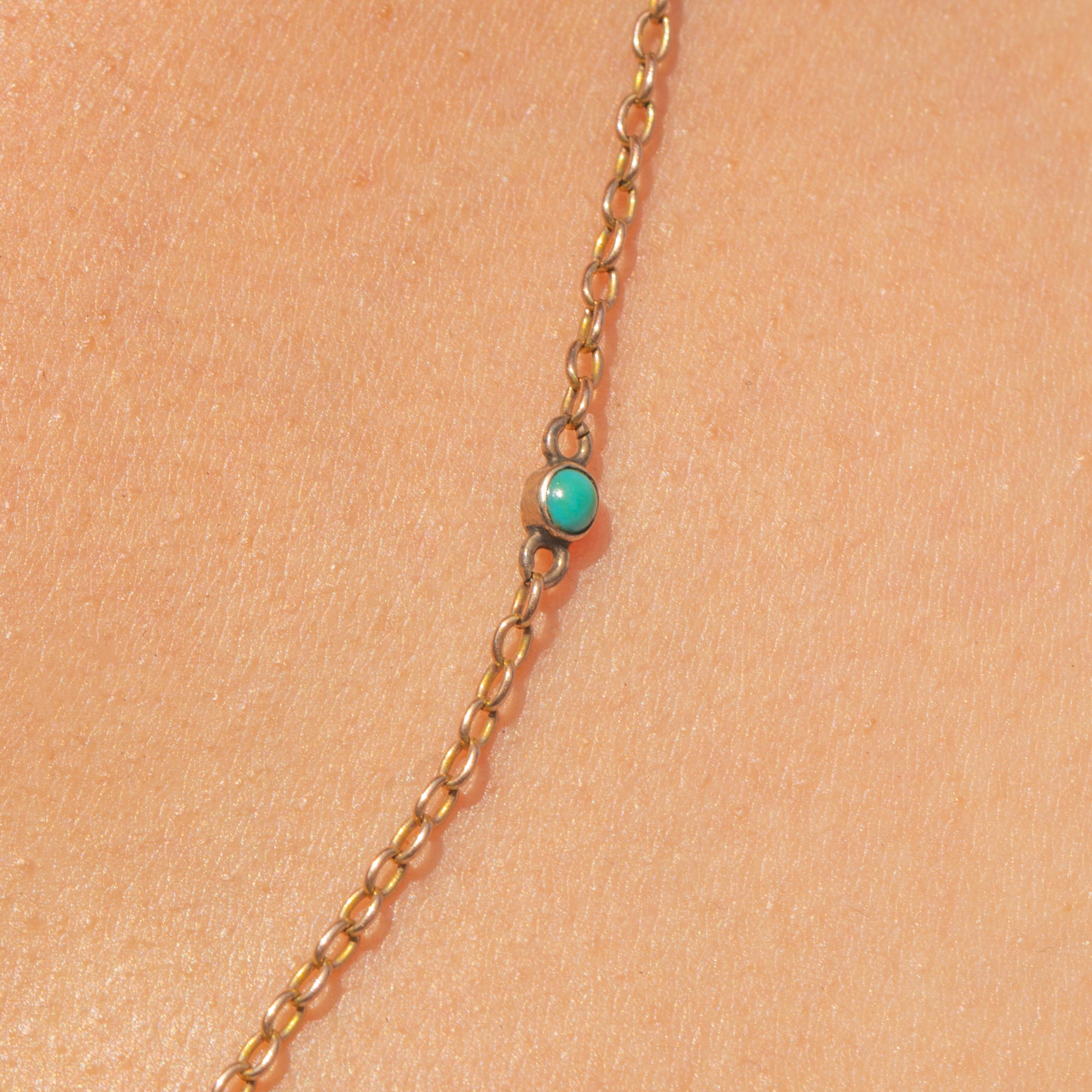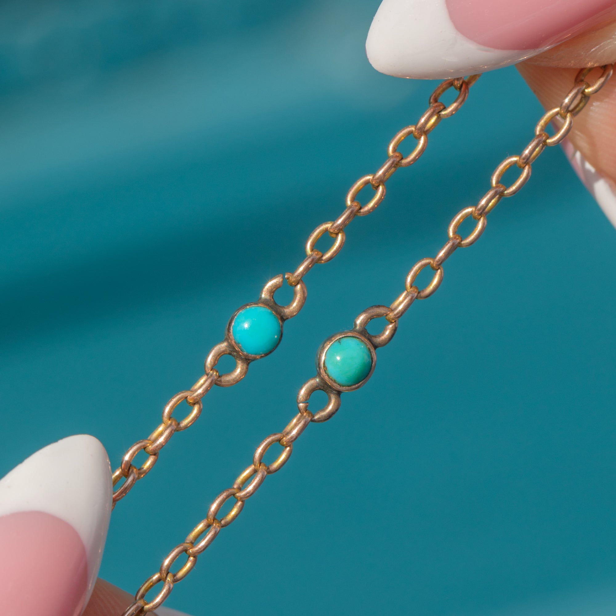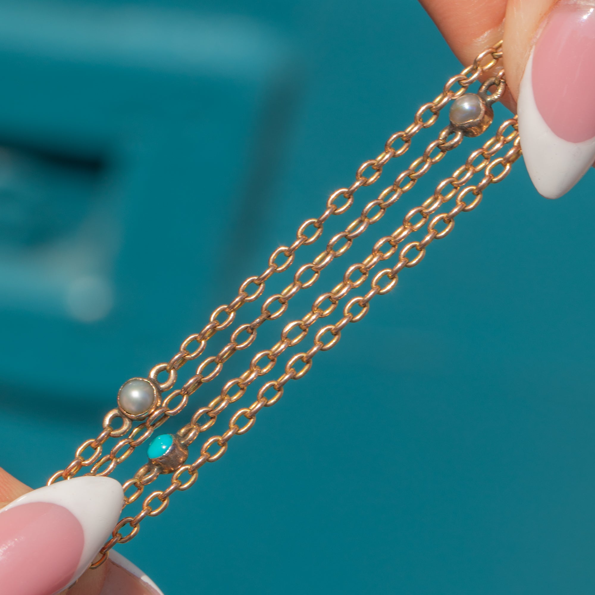 Antique 24" 9ct Gold Turquoise Pearl Terminals Chain Necklace