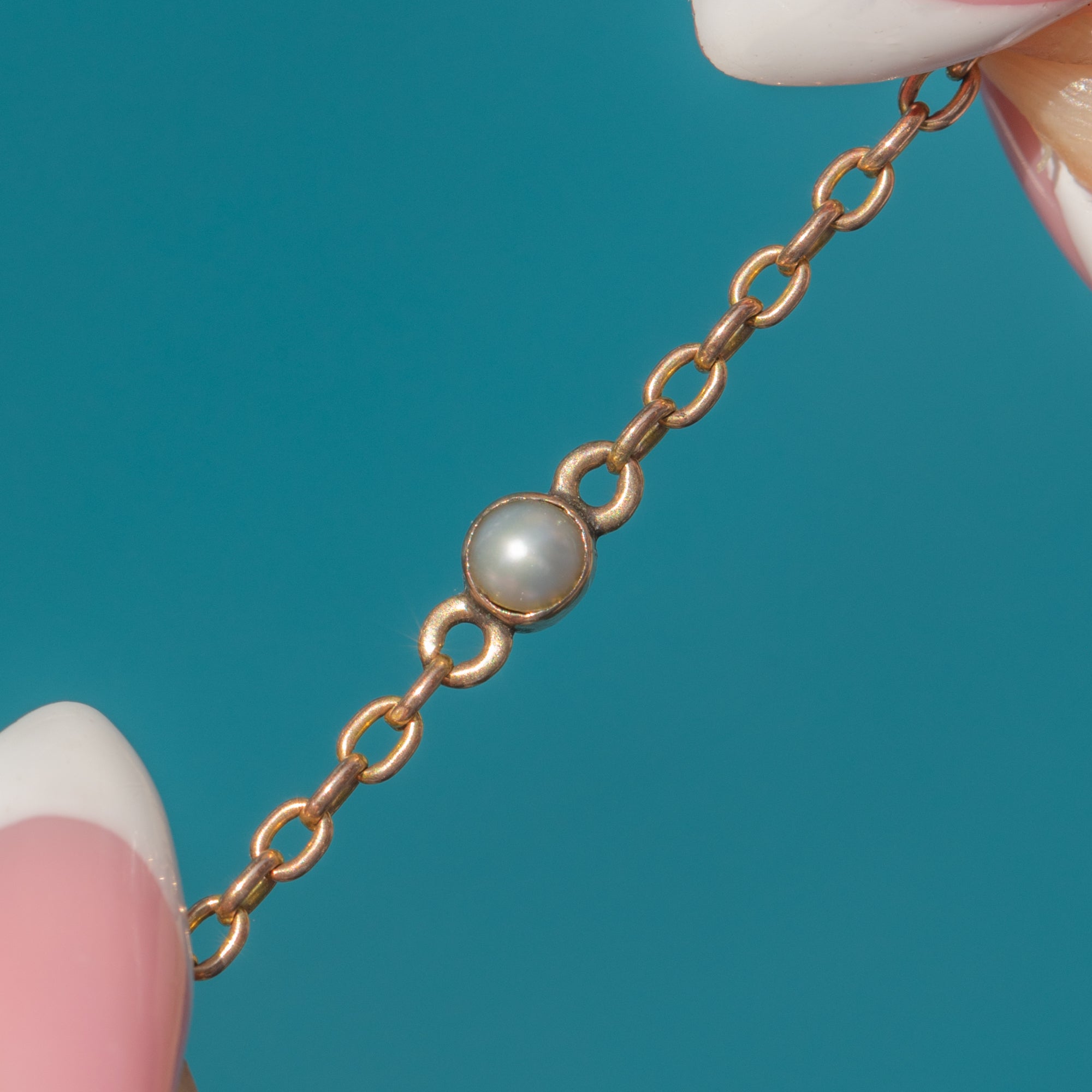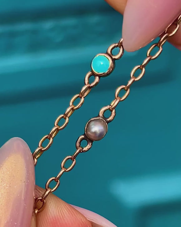 Crafted from rosy hued 9ct Gold, this antique chain necklace is dotted with alternating Turquoise and Pearls which provide a lovely pop of colour and iridescence.