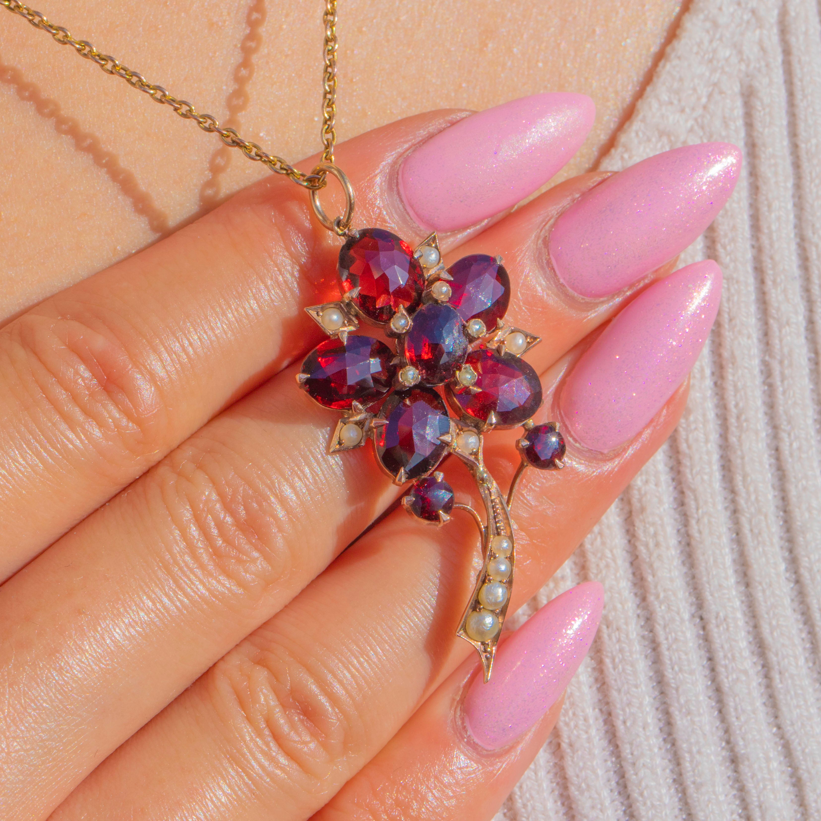 A quintessential Victorian beauty, this pendant unfurls as a floral spray of deep wine-red Garnets set in warm 8ct Gold, tapering to a graceful foliate stem kissed with creamy Seed Pearls. The articulated, hand‑assembled construction lends a subtle, elegant movement, while the rich tones of the Garnets glow against the buttery Gold.