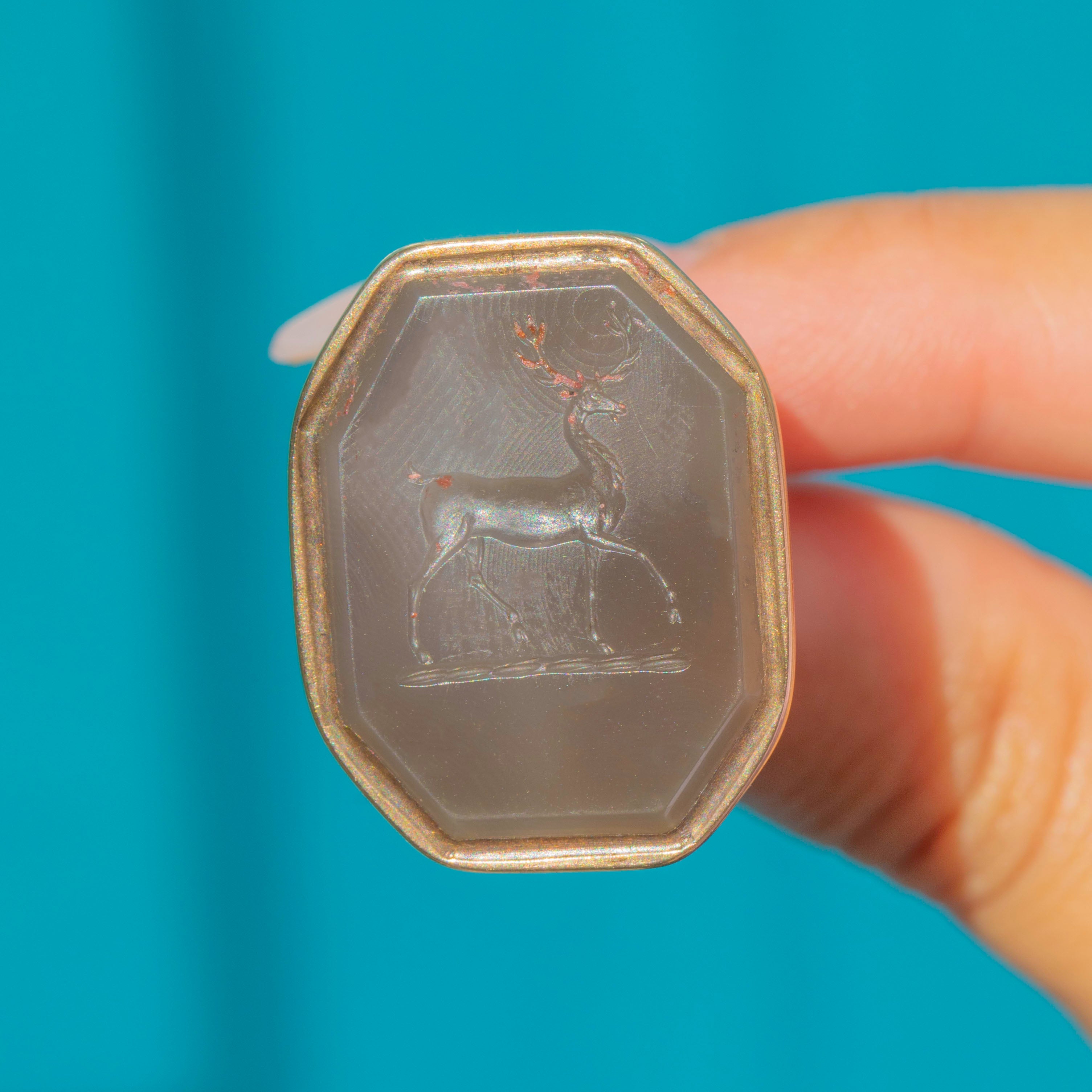 This impressive Victorian fob pendant is crafted in solid 9ct Gold and set with a striking Agate intaglio. The finely carved design depicts a stag in profile, beautifully detailed and defined, making this an outstanding example of 19th-century craftsmanship.