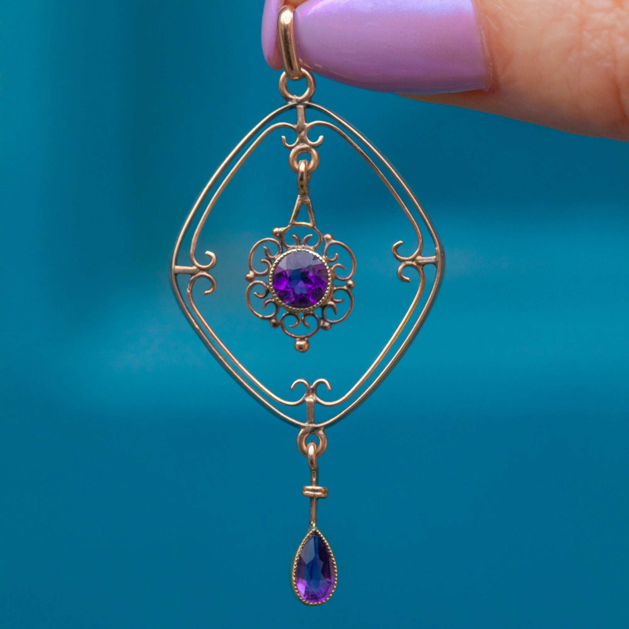 VERY GOOD-EXCELLENT. This antique 9ct Gold Amethyst drop pendant is in wonderful condition. The Amethysts have a wonderful radiance and are securely set. There are some minor signs of wear to the Gold commensurate with age, however this is difficult to spot when wearing. With a robust bale, you can wear her with confidence!