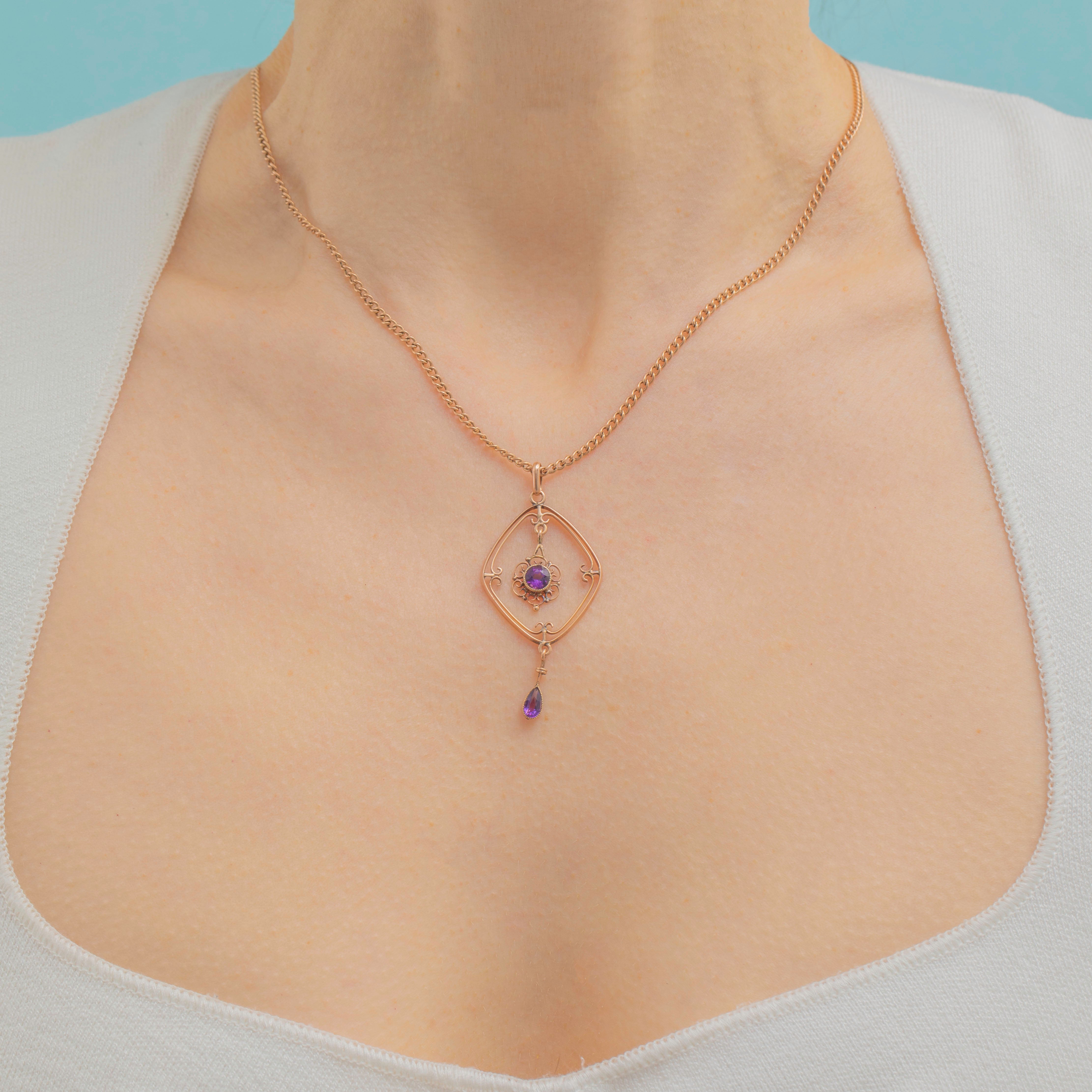 Elevate your collection with this antique 9ct Gold Amethyst drop pendant! The striking design of this Edwardian pendant has been crafted from luscious 9ct Gold and in the heart sits a striking Amethyst sitting within a dainty openwork floral setting.