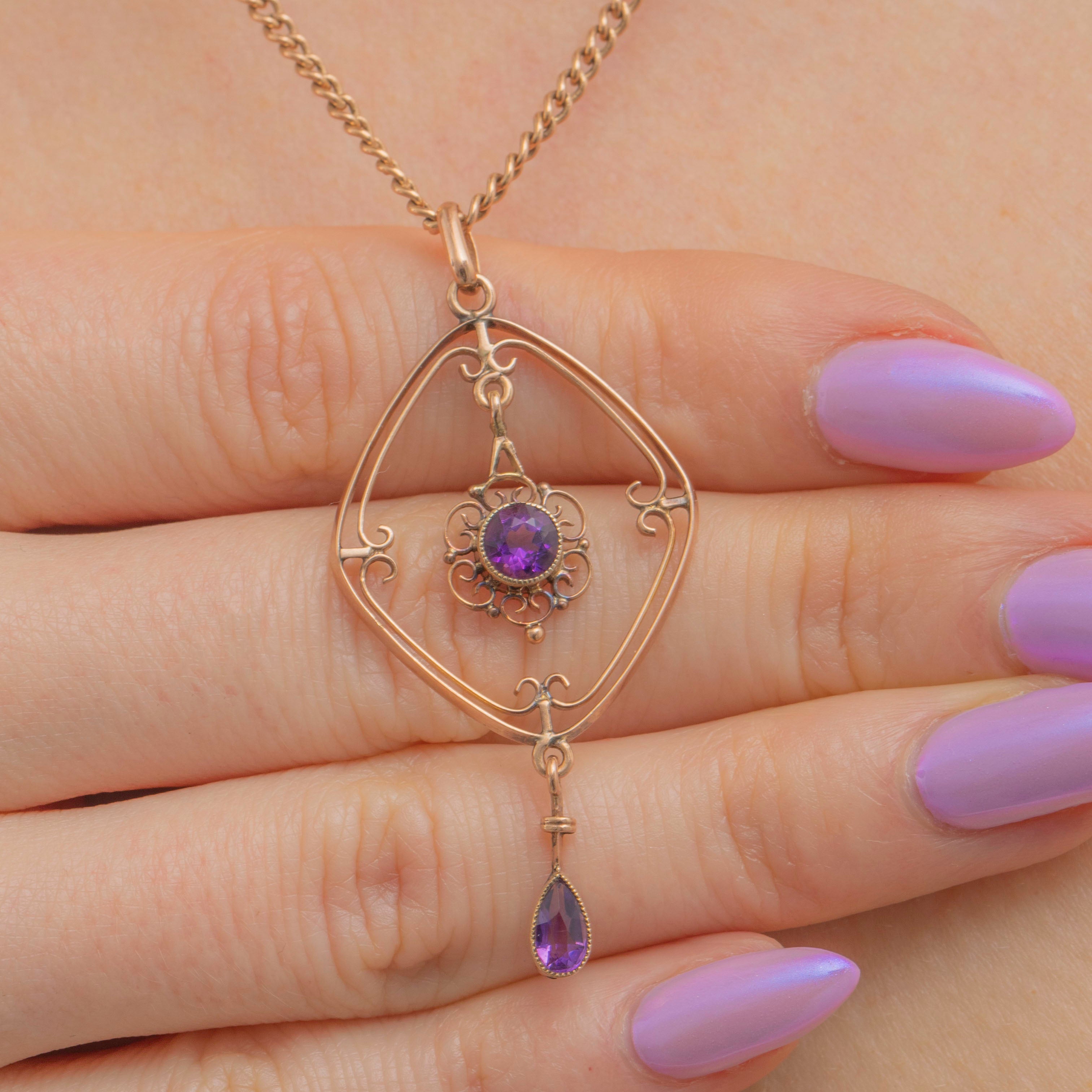 Pretty Antique Edwardian 9ct Gold Amethyst Drop Pendant