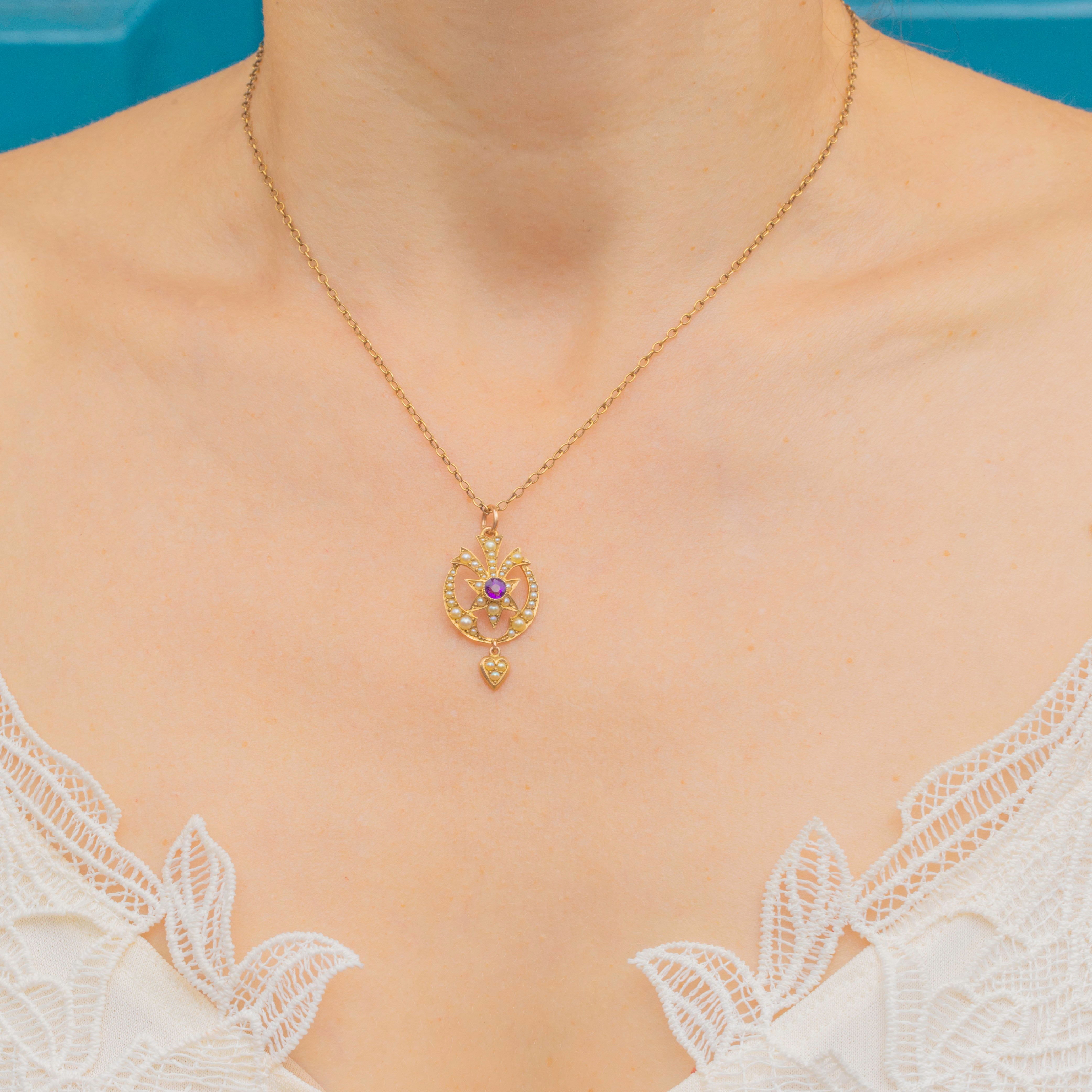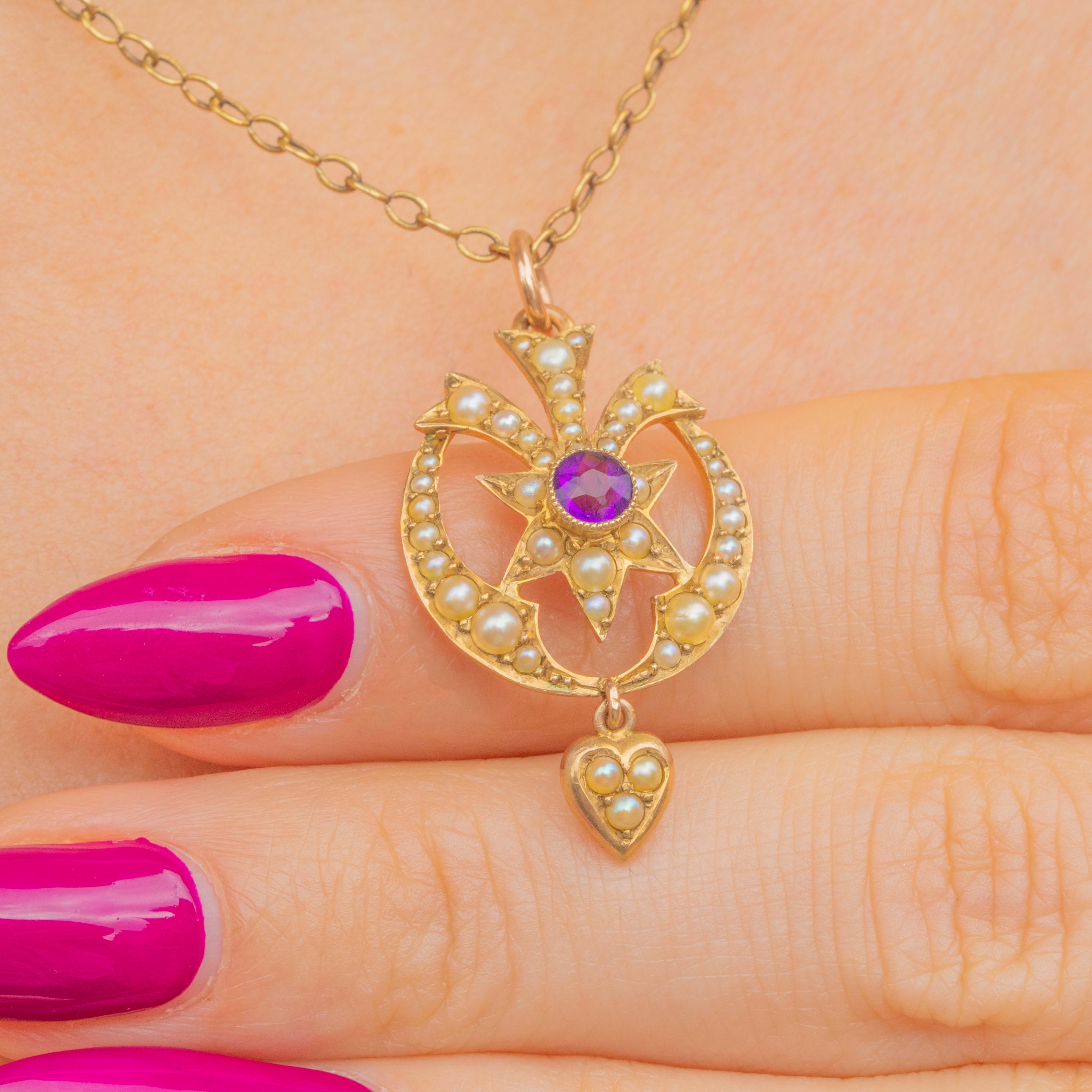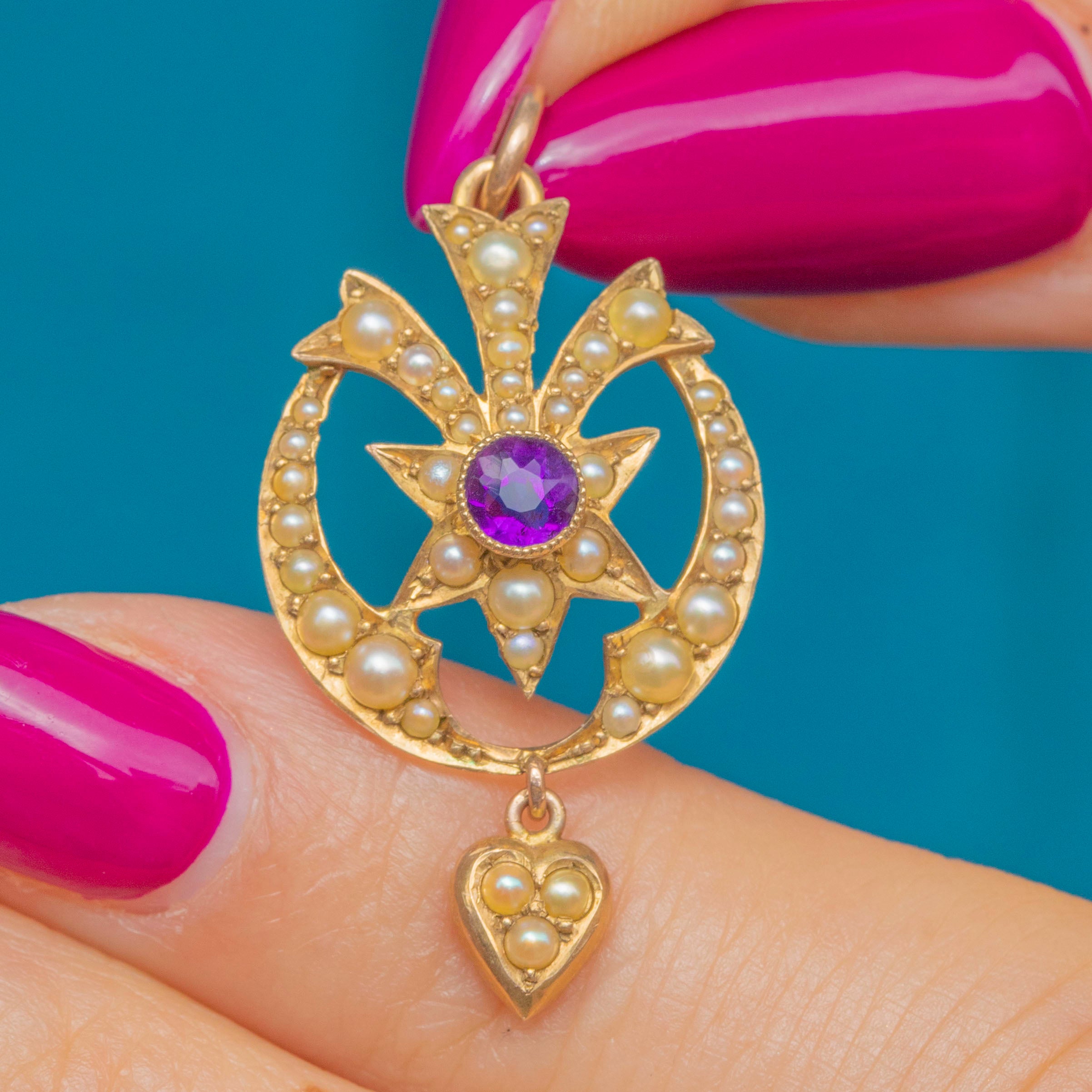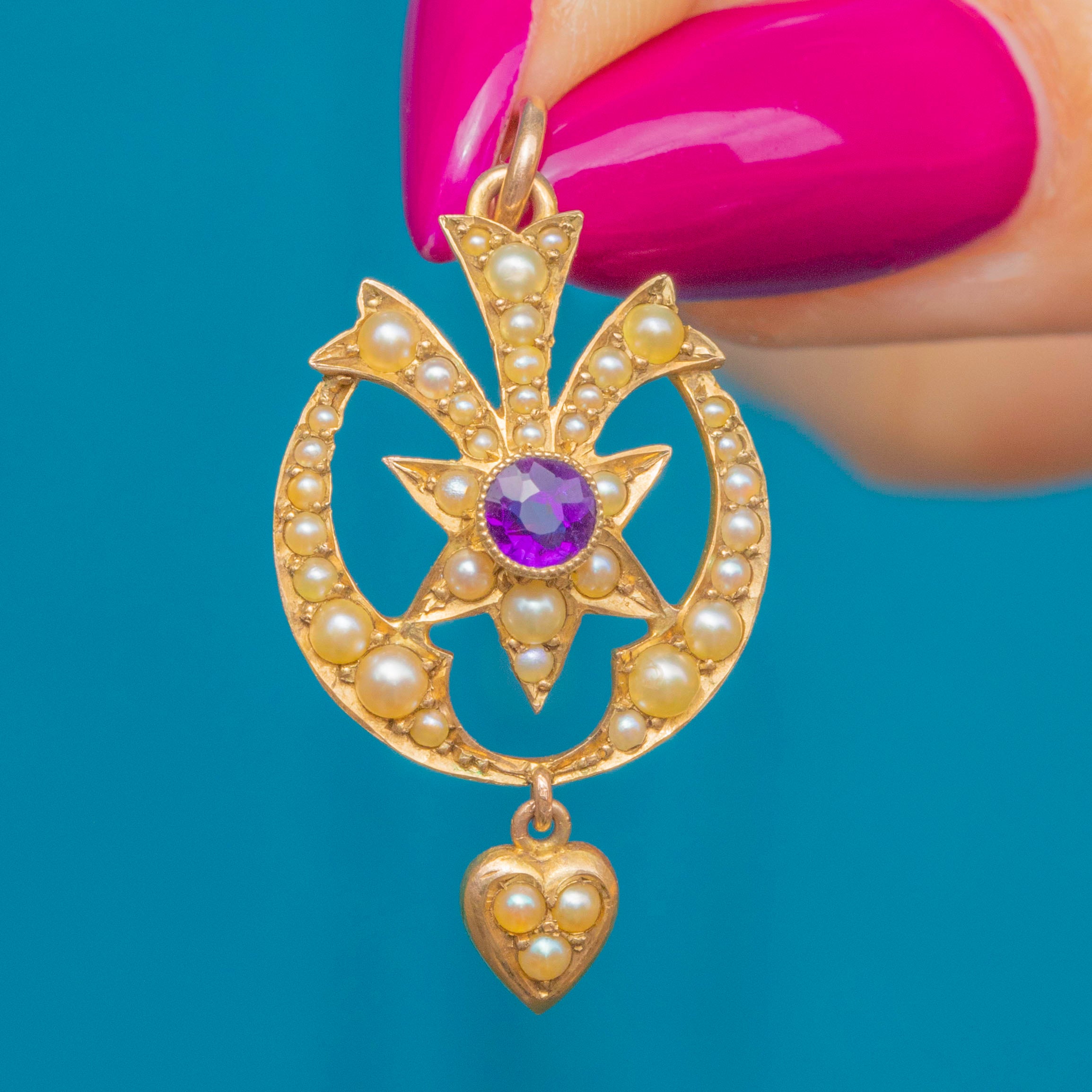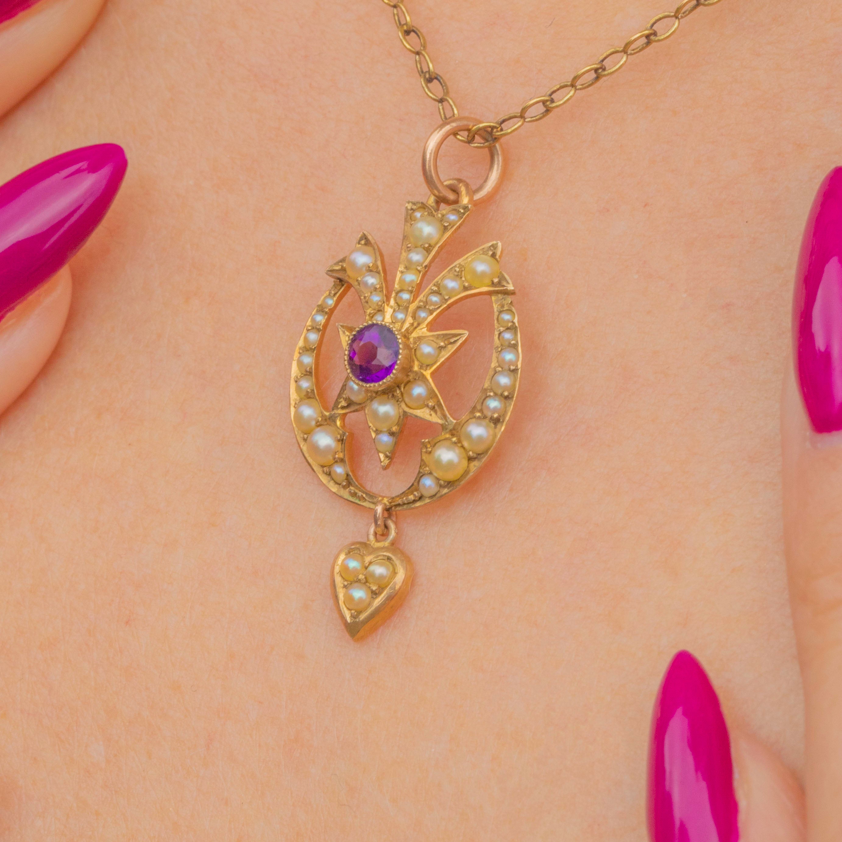 Bursting with exquisite details and resplendent gems, this antique pendant embodies Victorian craftsmanship! A shooting star inlaid with a royal purple Amethyst takes centre stage, framed by curved lines and suspending a cute heart drop, crafted from glossy 9ct Gold.