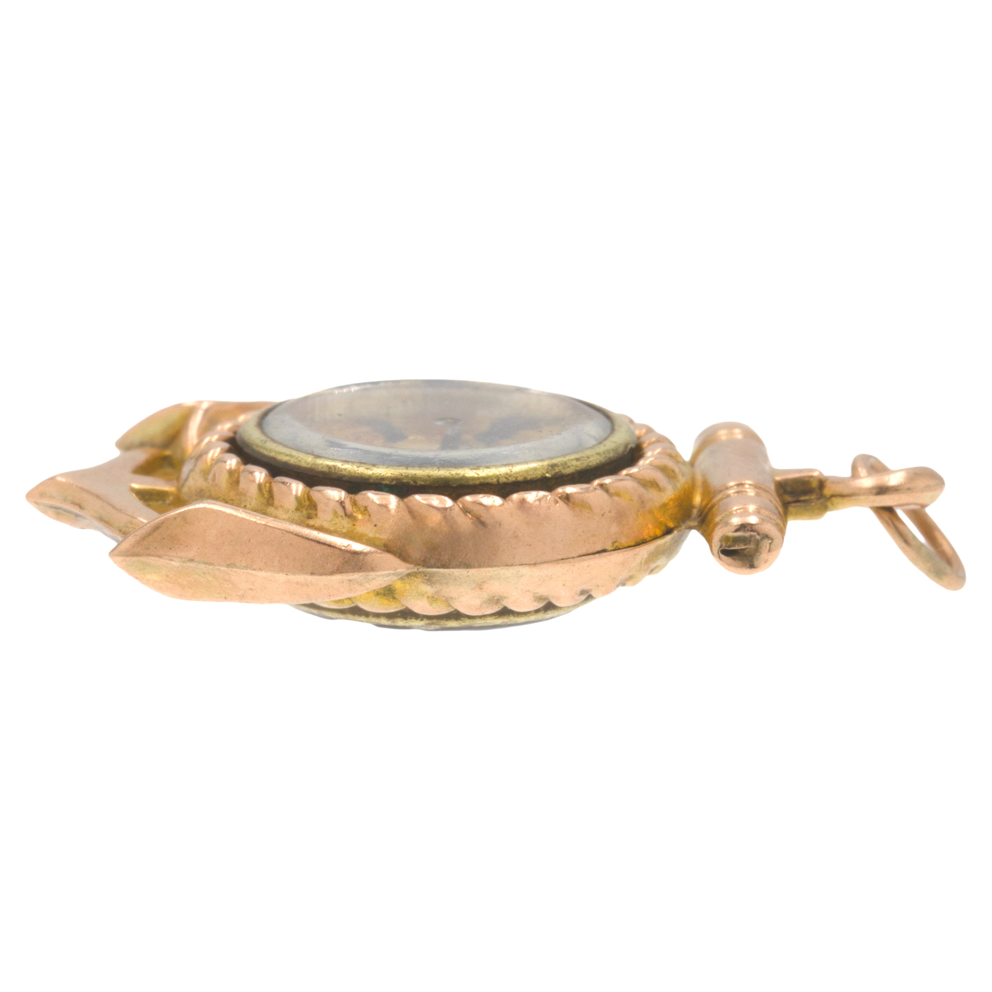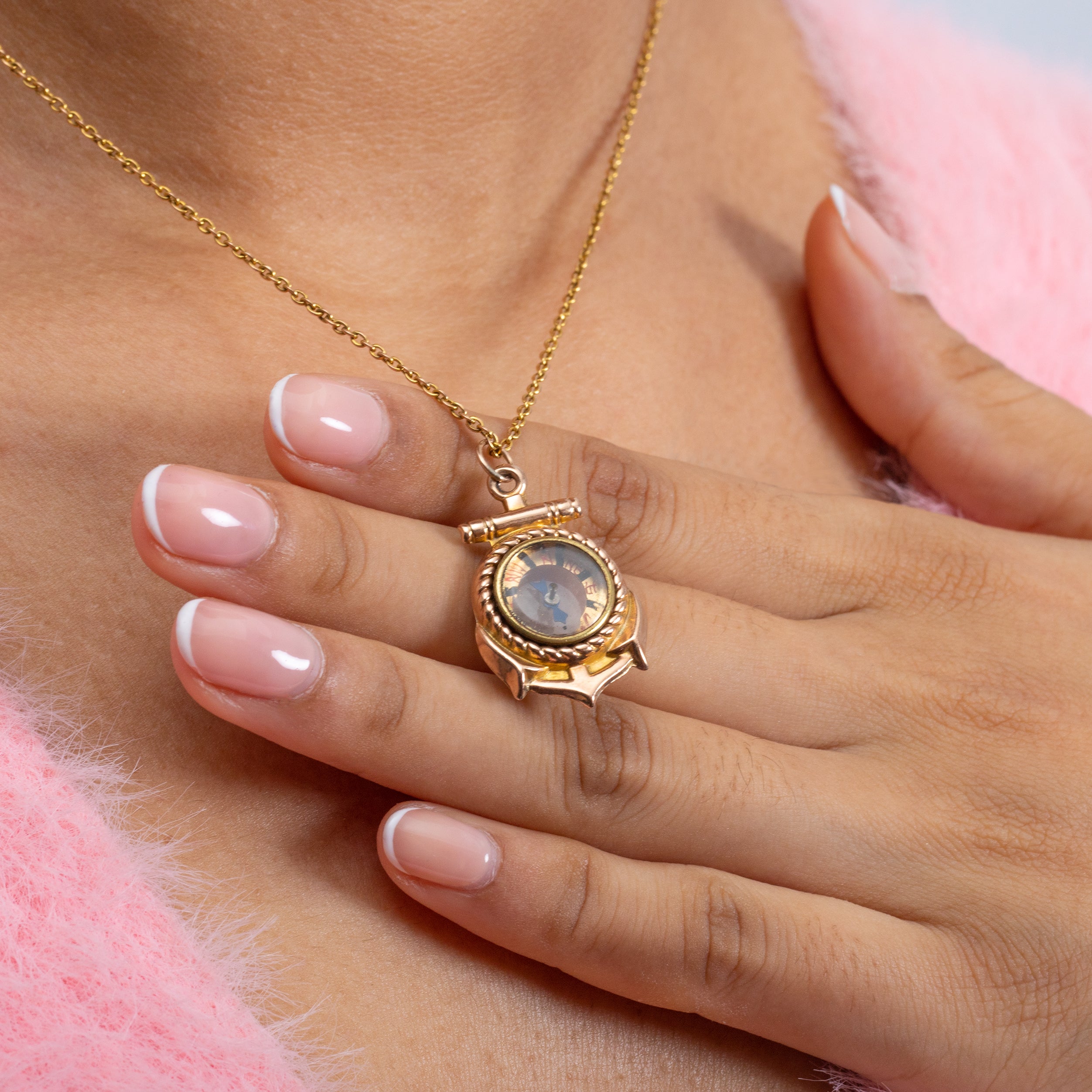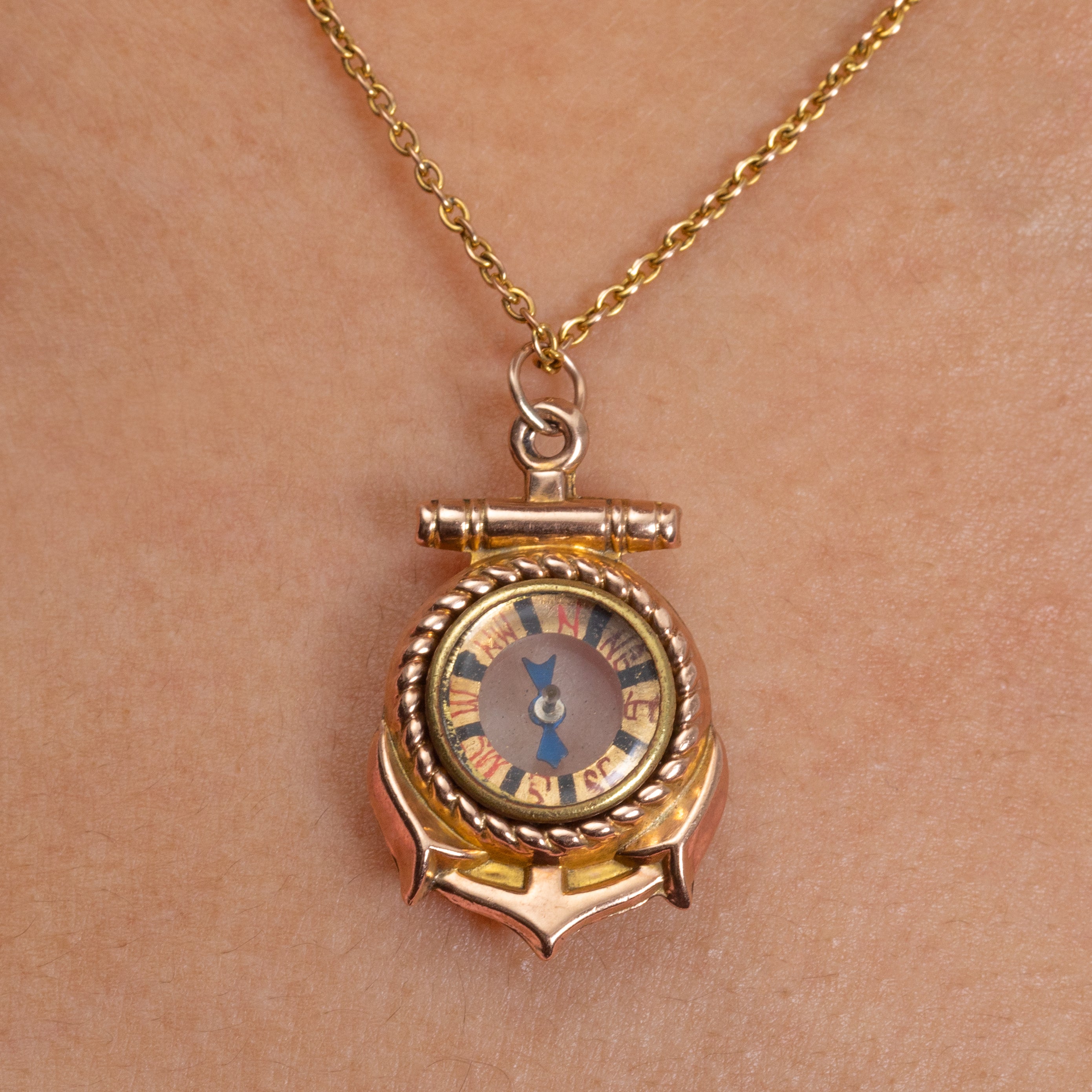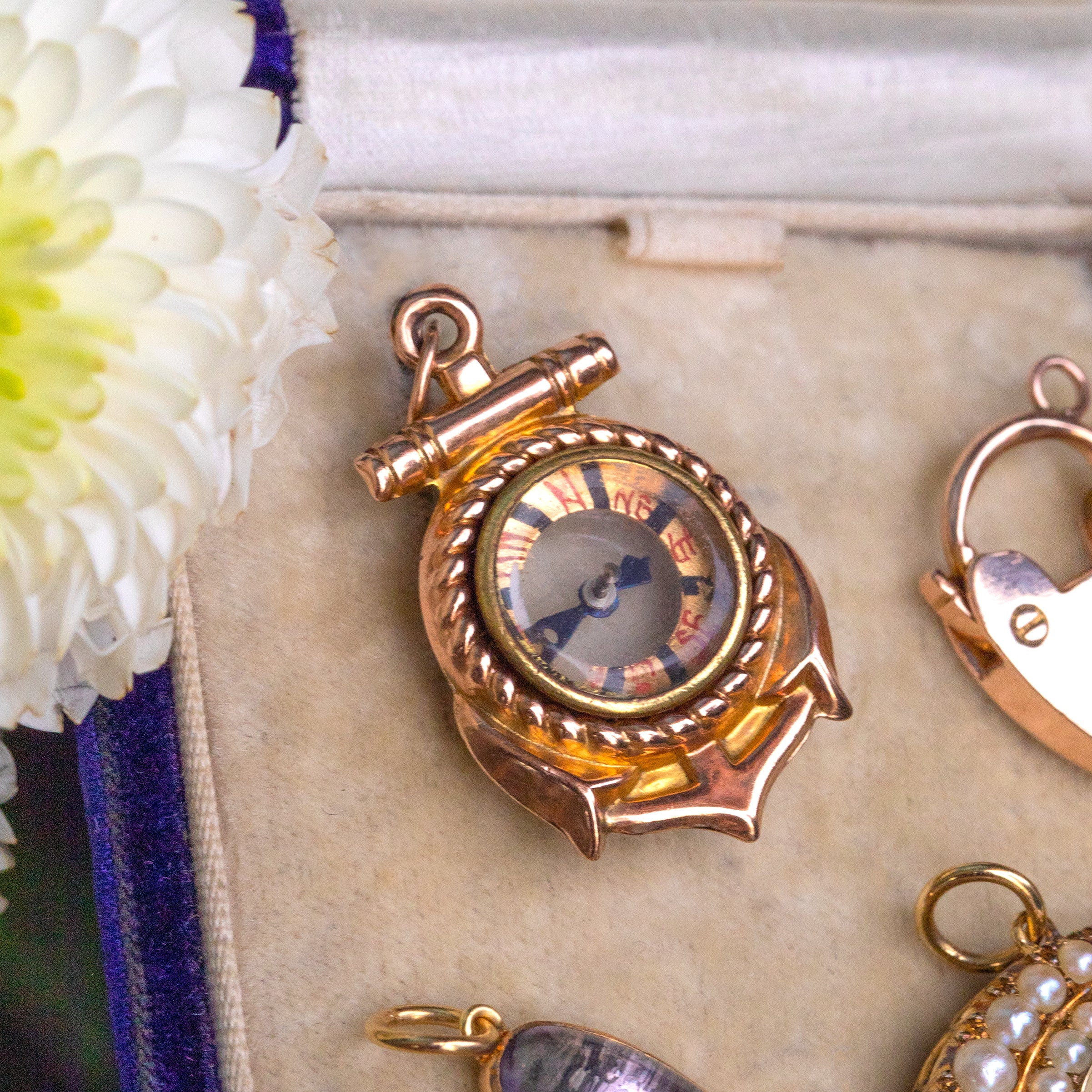 Bring a touch of nautical charm to your repertoire with this delightful antique 9ct Gold anchor compass pendant! Crafted entirely from buttery 9ct Gold, this Victorian pendant has been formed into a striking anchor and is complete with a compass centrepiece haloed by a decorative rope border.
