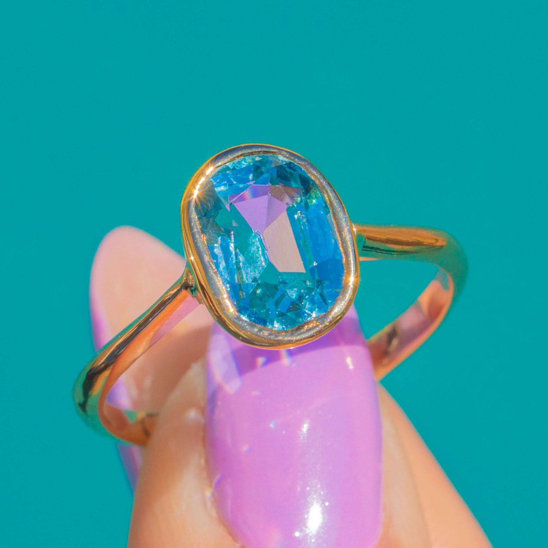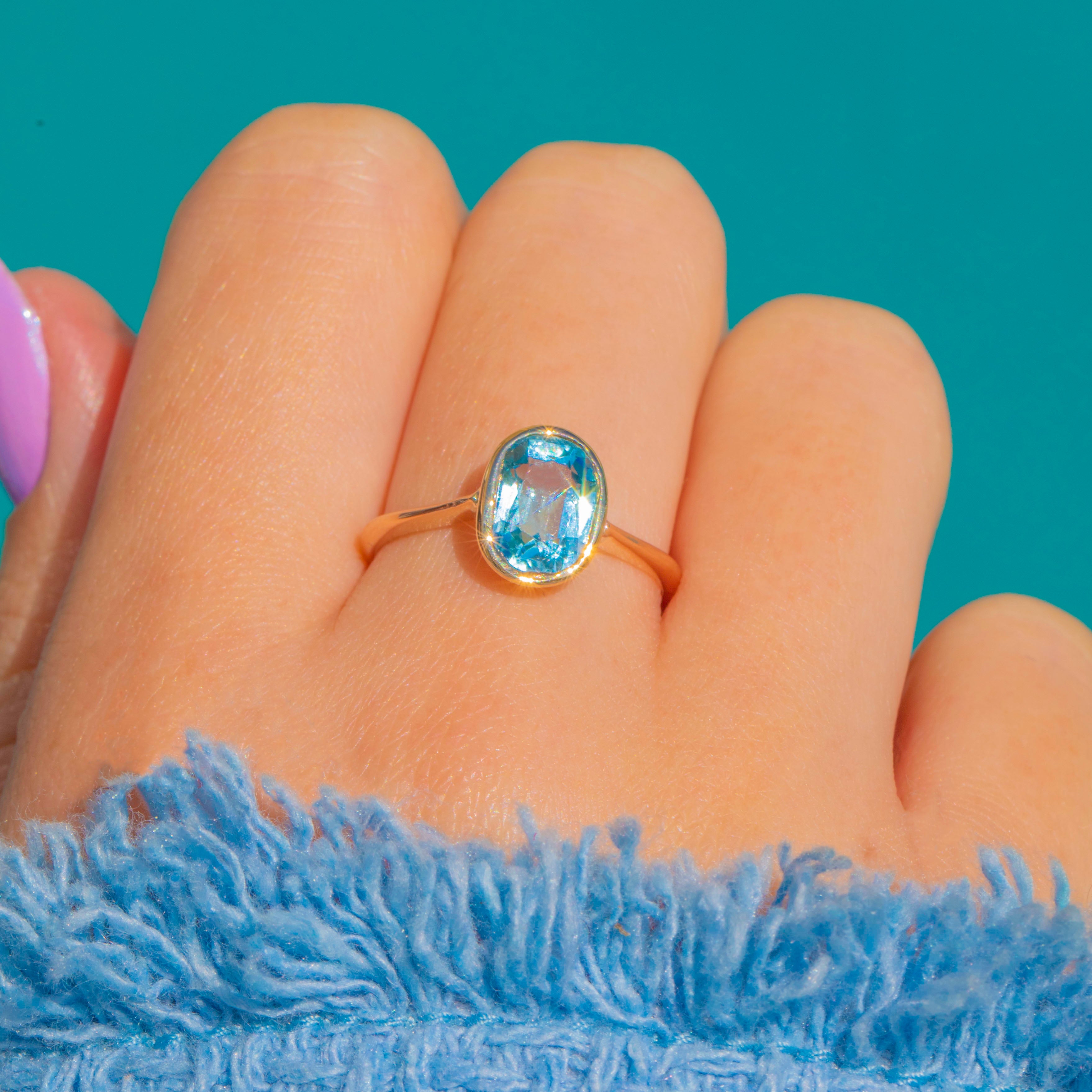A luminous Edwardian Aquamarine solitaire, this refined ring pairs a cool 1.10ct Aquamarine with buttery 9ct Gold. The oval gem is embraced by a sleek rub-over bezel, creating a smooth, modern line that feels wonderfully secure and effortlessly elegant.