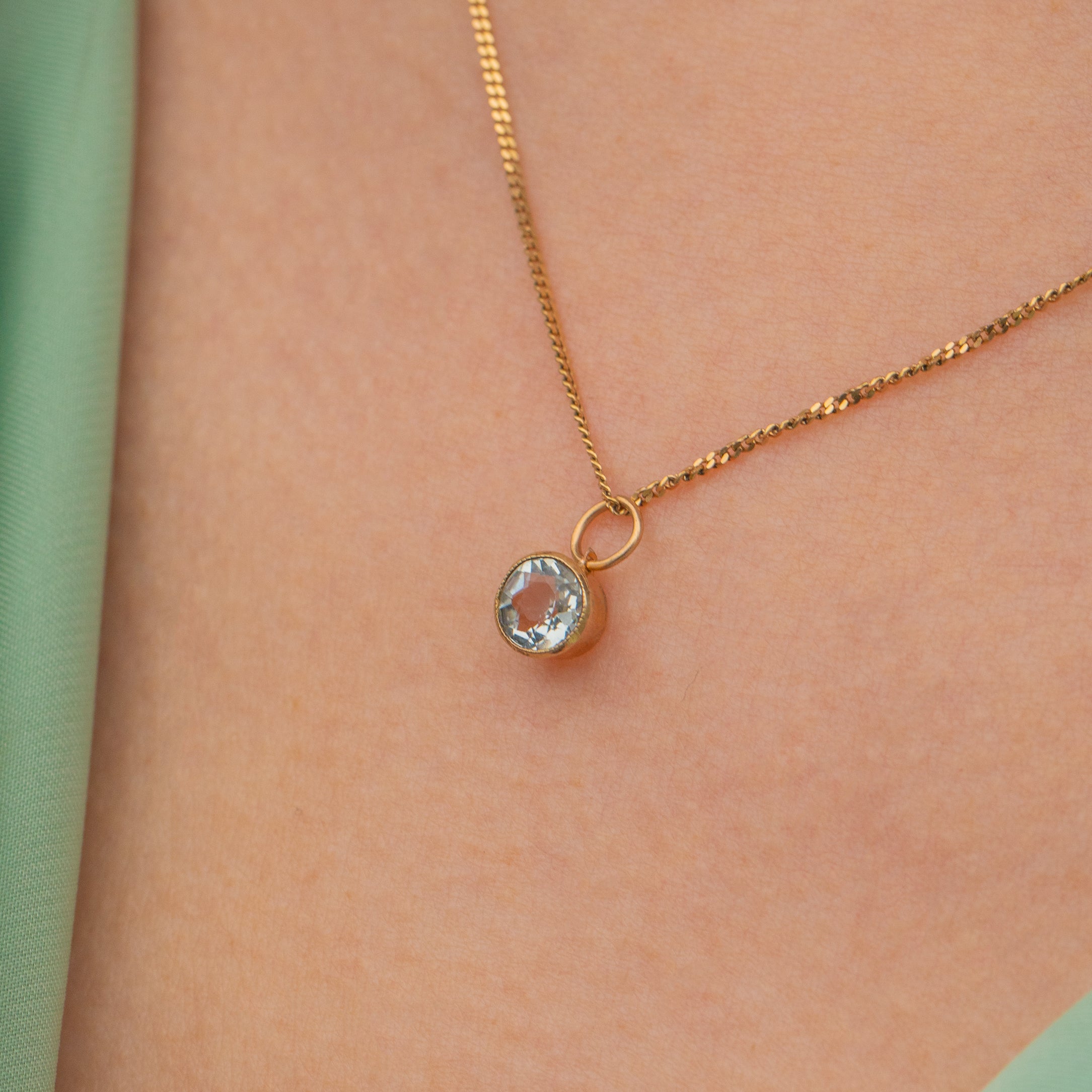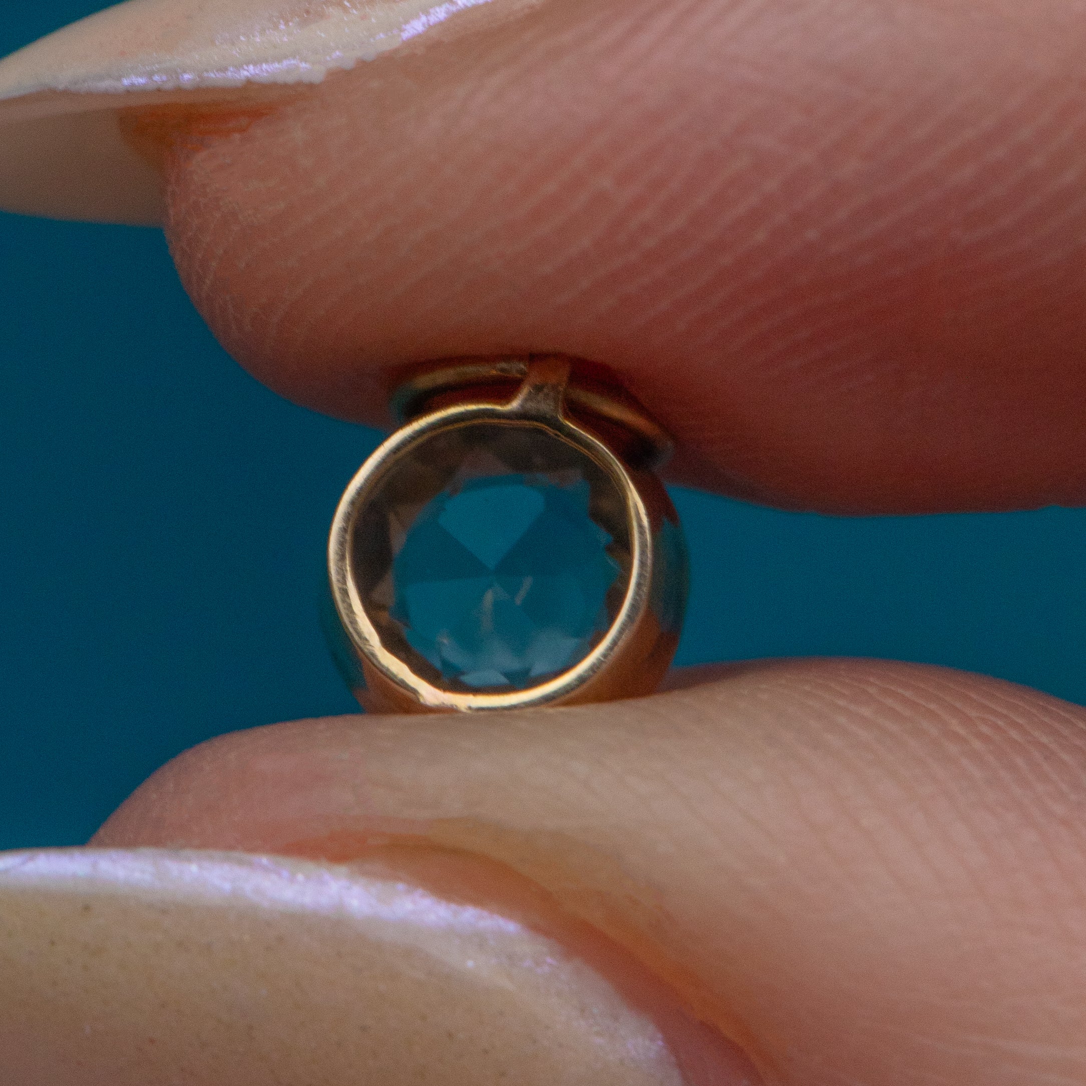 This antique 9ct Gold Aquamarine charm is adorable! Akin to a frozen droplet, this faceted Aquamarine radiates icy-blue hues as she catches the light. She is set within a buttery yellow Gold bezel, its warmth complimenting the cool tones of the Aquamarine.