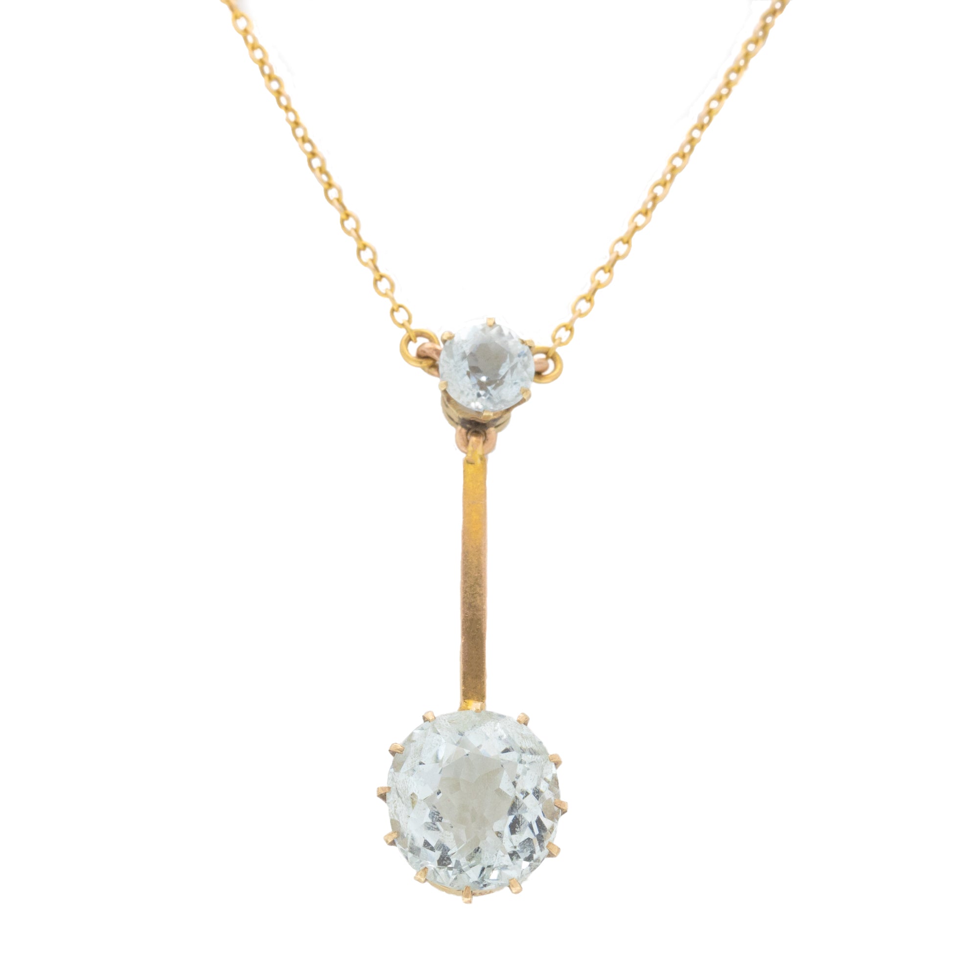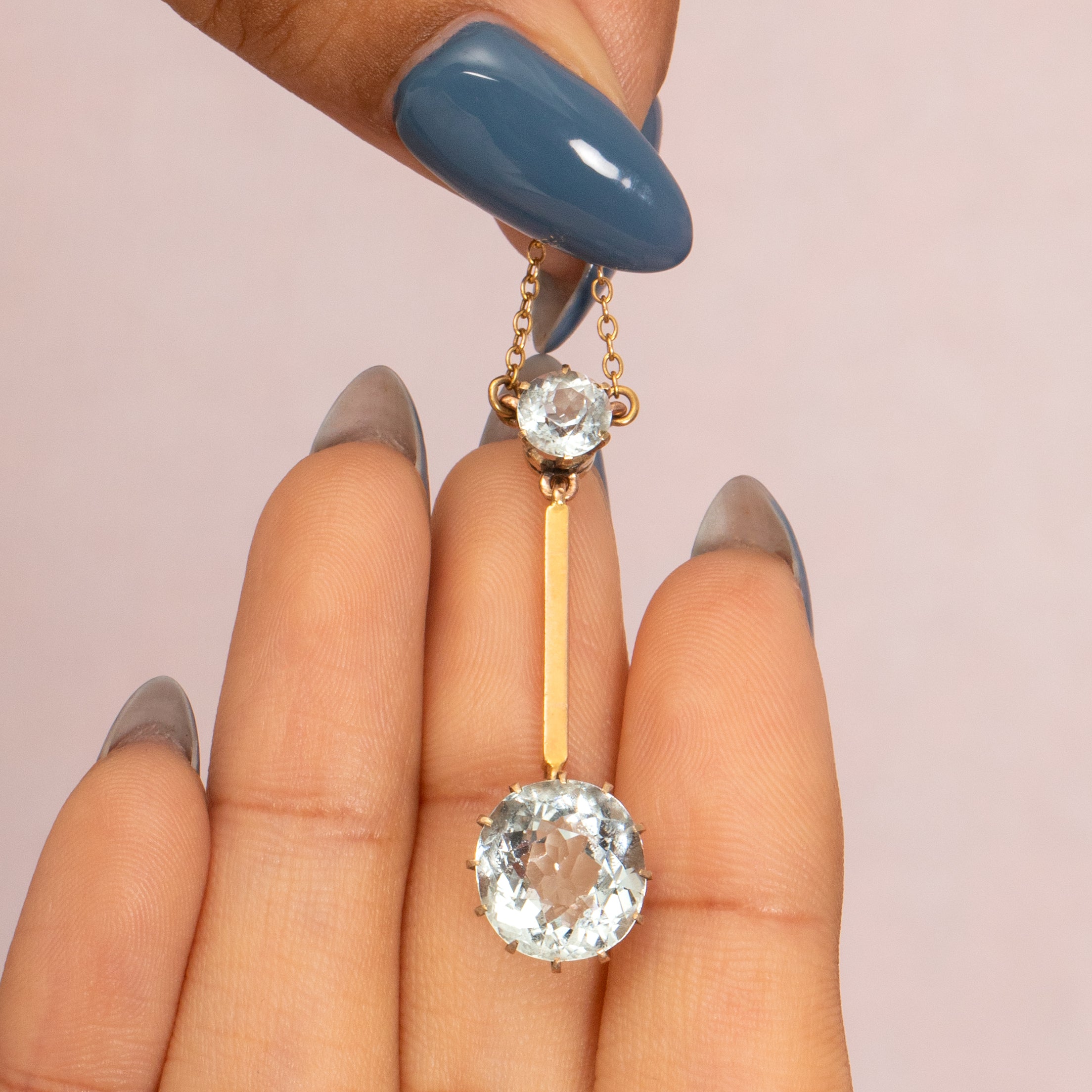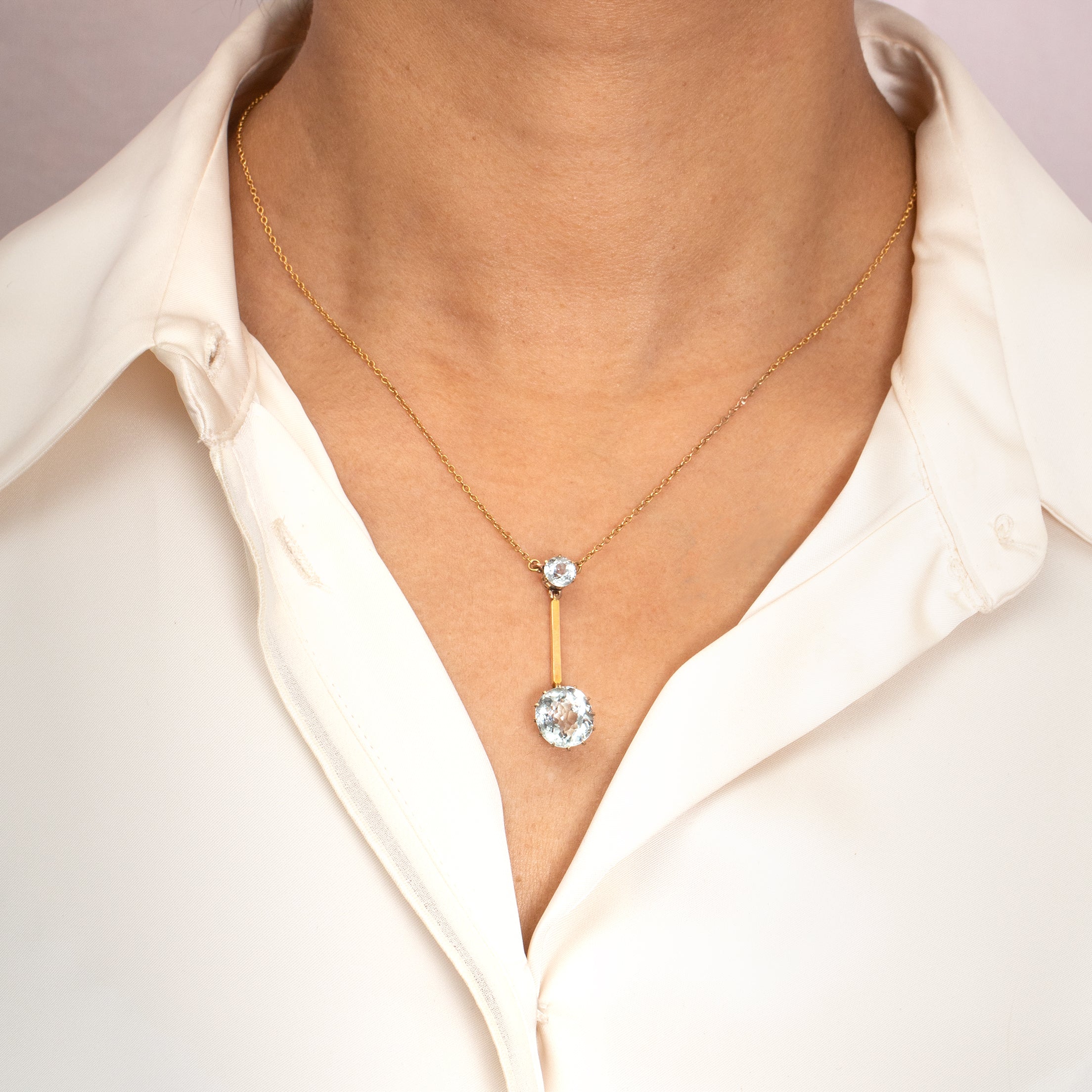VERY GOOD. This antique 9ct Gold Aquamarine drop necklace is offered in very good condition. Both Aquamarines are held securely within their 9ct Gold setting, with each claw present. The bottom Aquamarine has some very small fleabites to some facets, but these are only noticeable under close inspection. The Gold is buttery with only some minor discolouration throughout, commensurate with age. The links are all securely connected and the bolt ring is in perfect working condition allowing you to wear this antique Aquamarine necklace with absolute confidence!