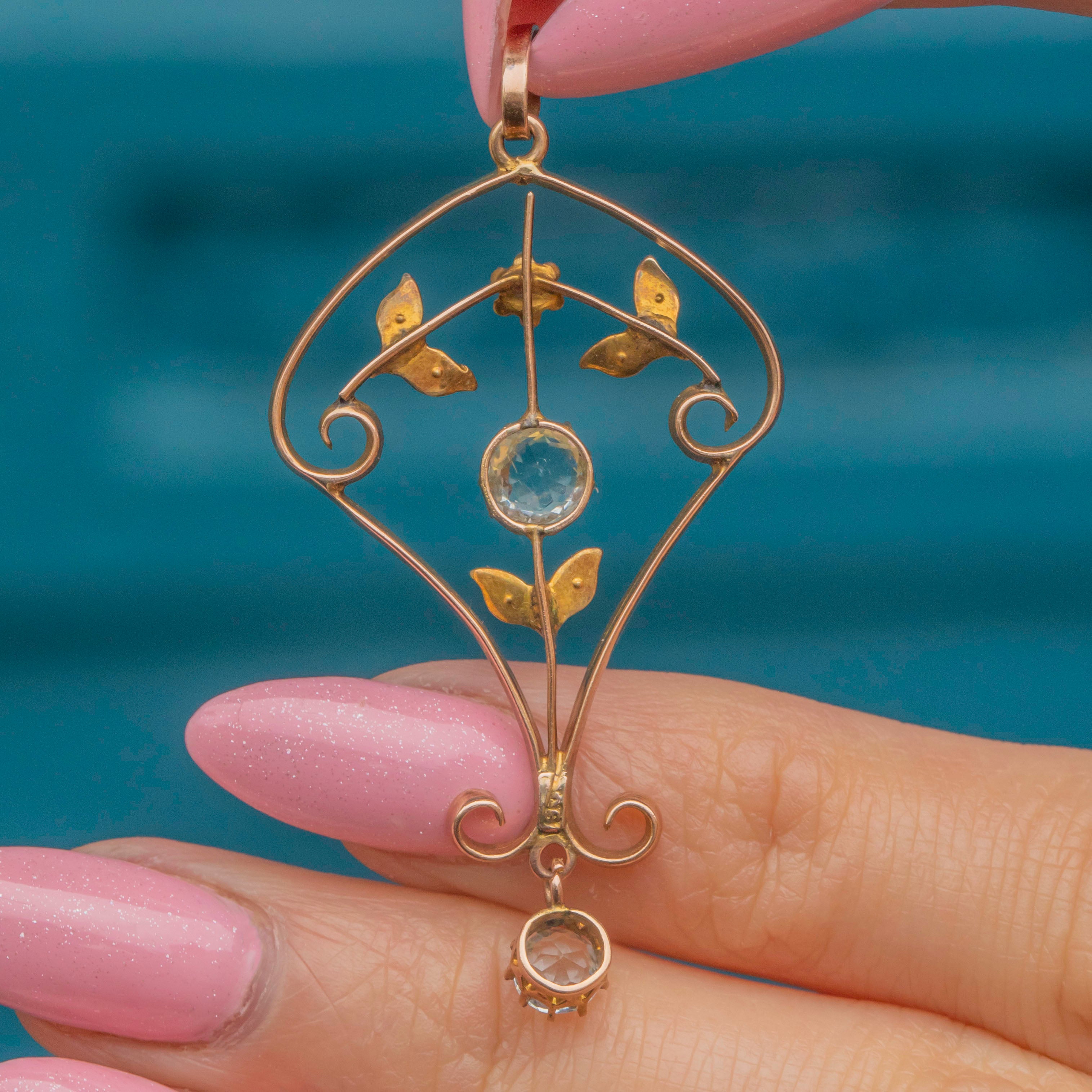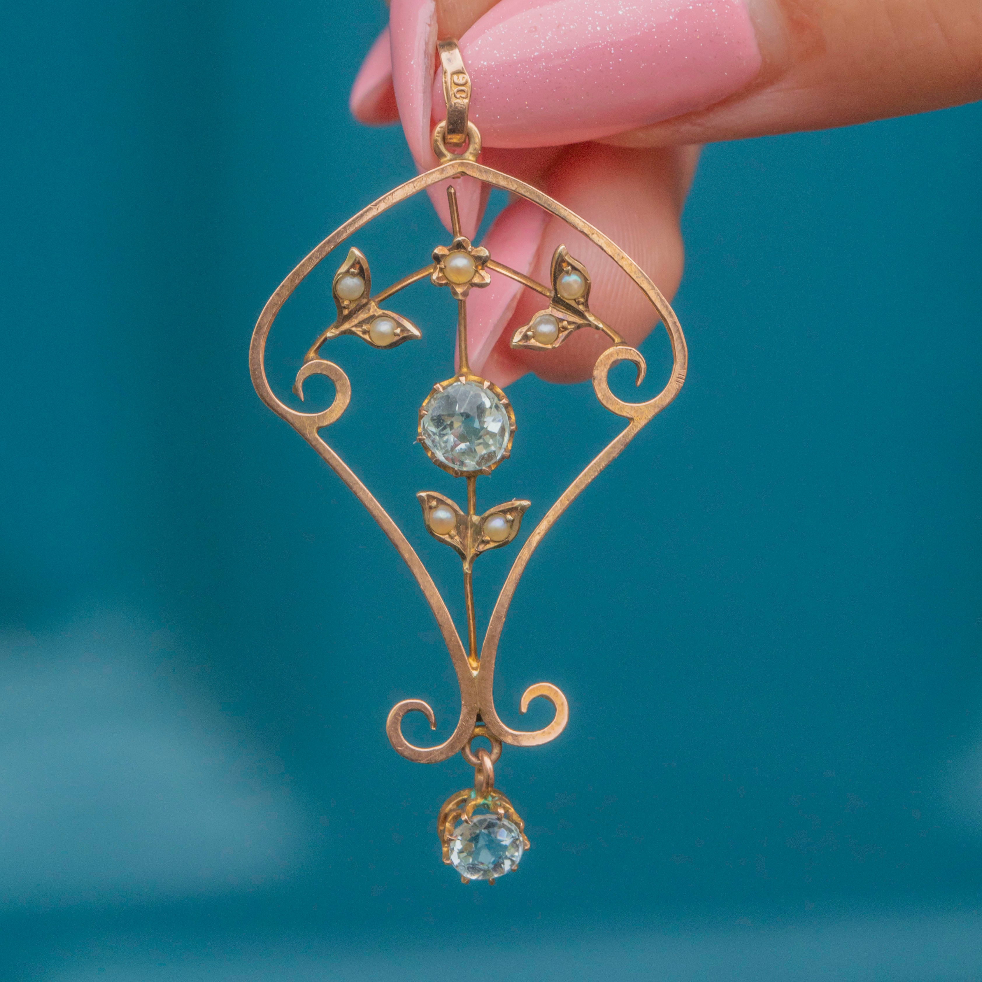 This antique 9ct Gold Aquamarine Pearl lavalier pendant is a gorgreous treasure from the Edwardian era! The pendant boasts two icy blue Aquamarines and dainty Seed Pearls set within foliate details, within a curvaceous 9ct Gold frame.