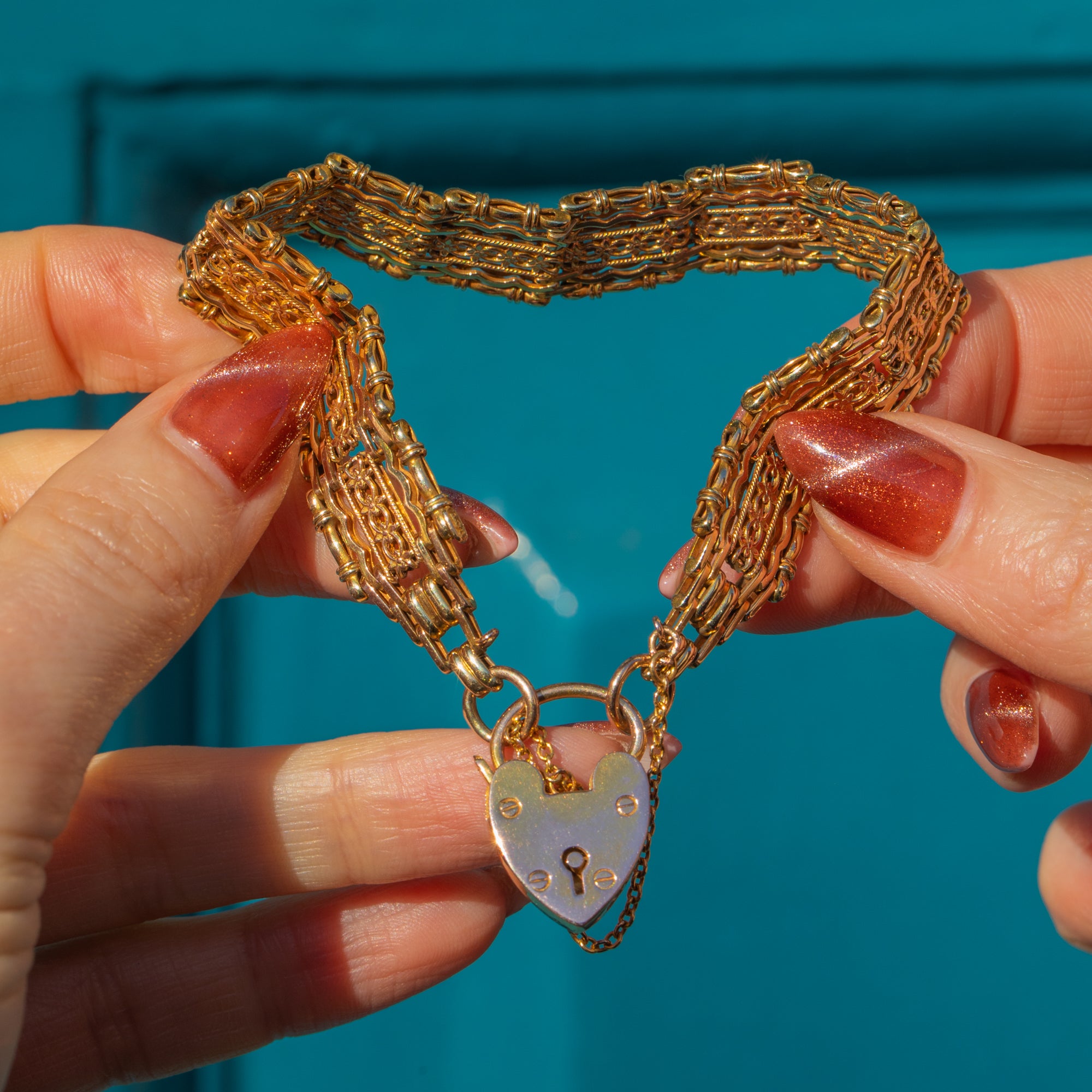 Antique 9ct Gold Bamboo Gate Bracelet with Heart Padlock