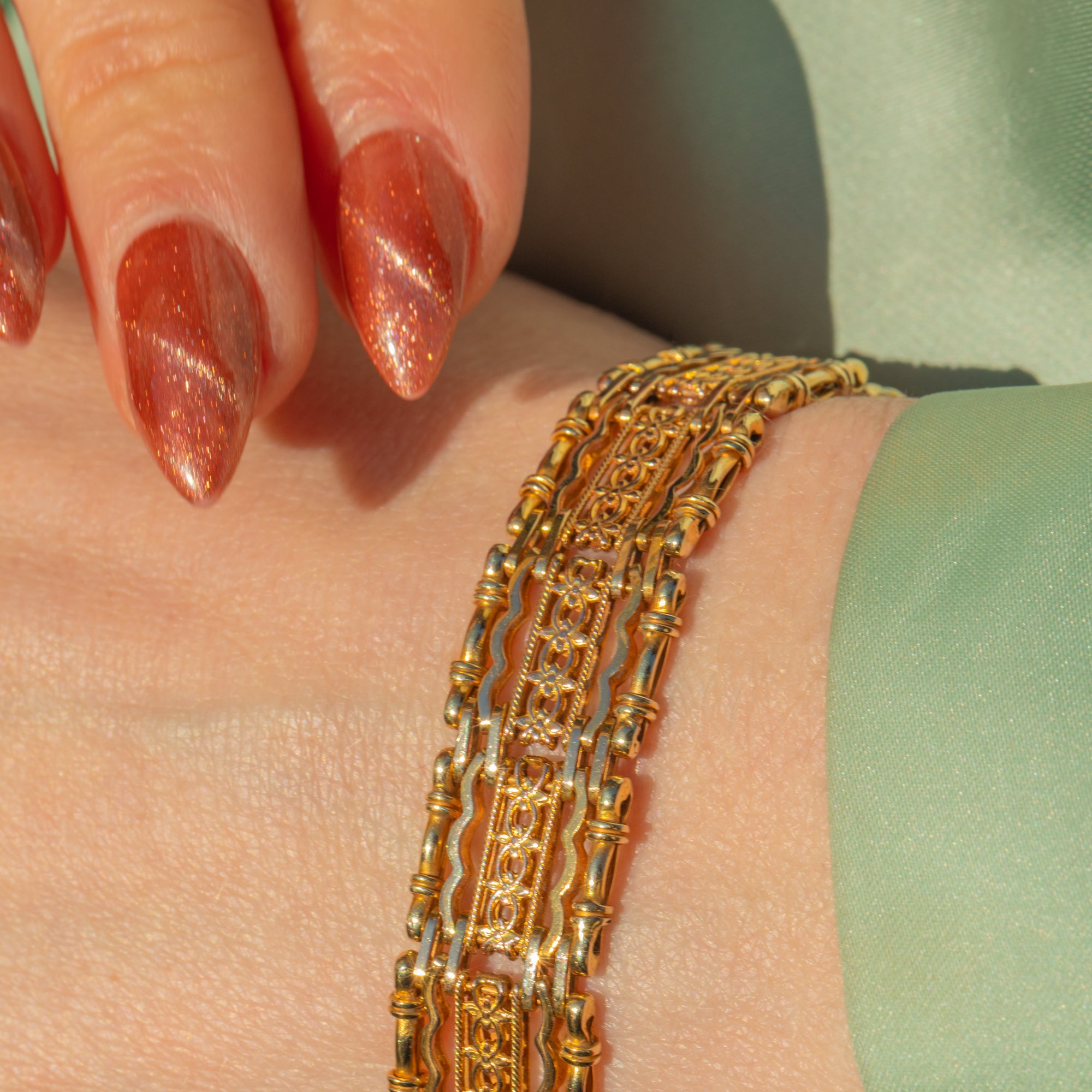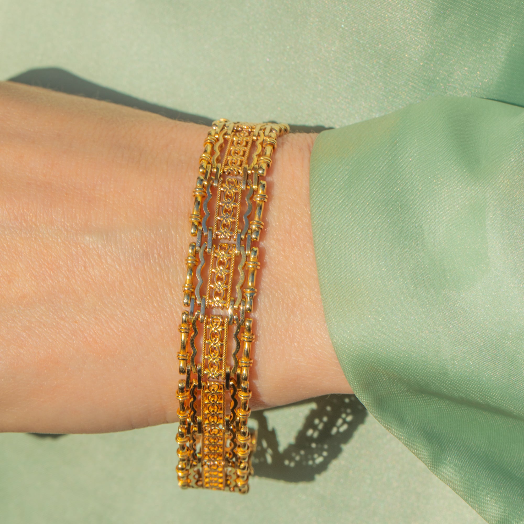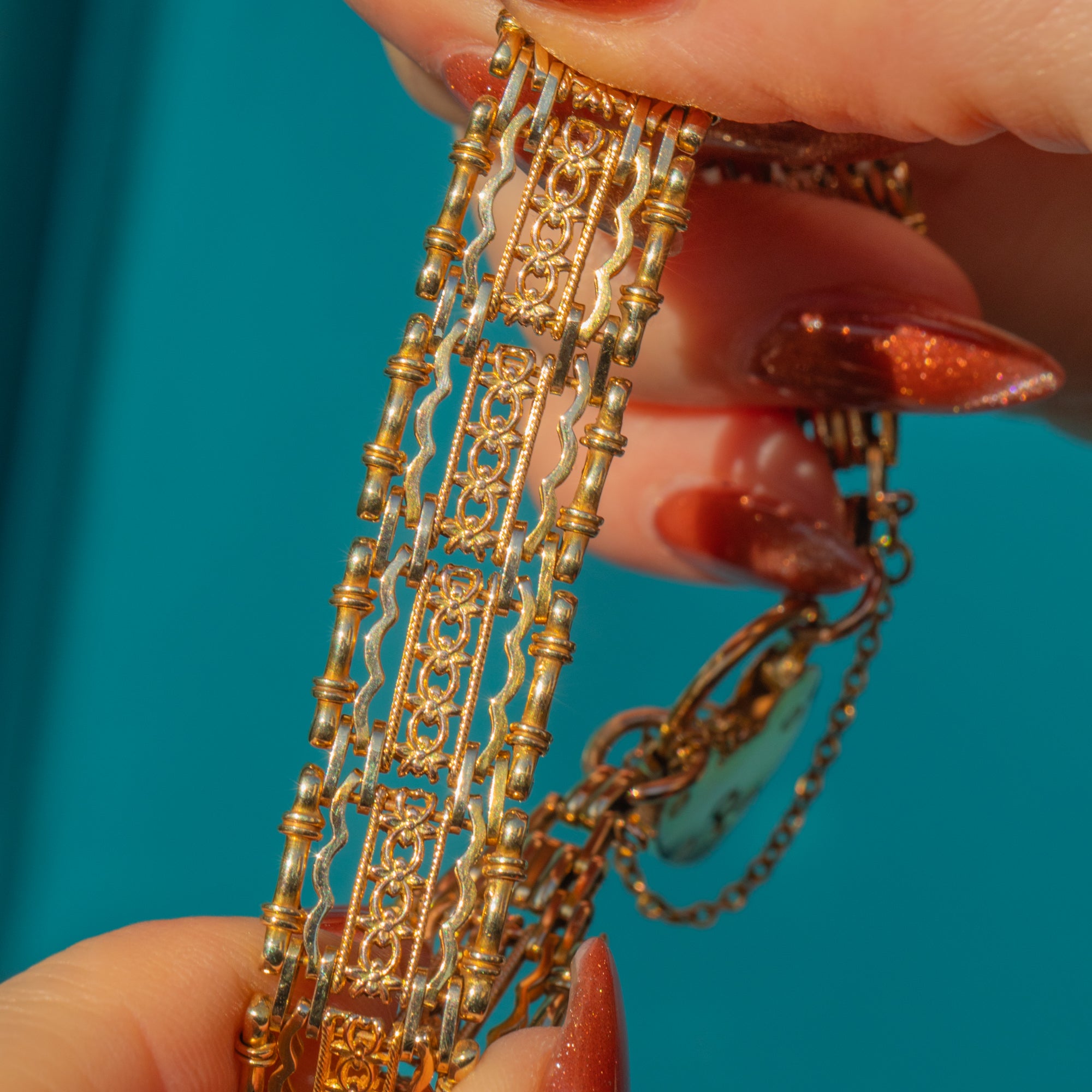 EXCELLENT. This antique 9ct Gold bamboo gate bracelet is in excellent condition. All of the links have been beautifully crafted and provide a gentle movement. The safety chain is working perfectly but can be removed if you'd prefer! The padlock allows you to close this bracelet and wear it confidently. This Victorian Gold gate bracelet will bring luxury to any attire!