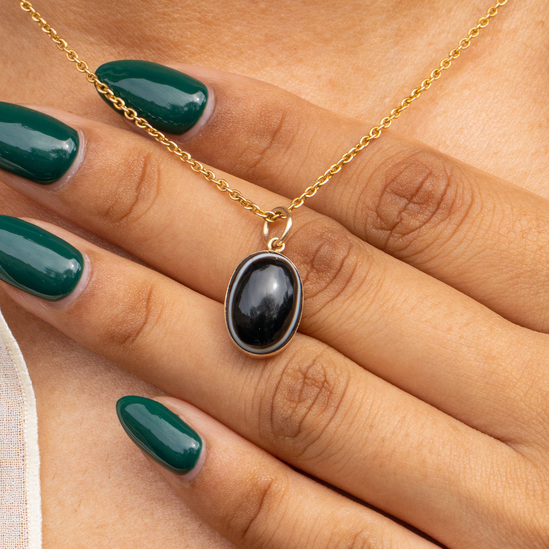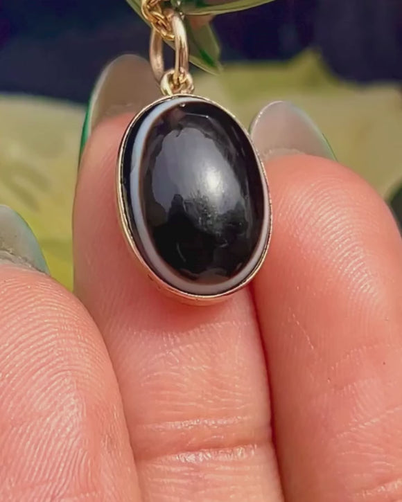 Prepare to lose yourself in this 9ct Gold banded Agate pendant! An inky Agate with a thin white band haloing her circumference is complemented by a 9ct Gold bezel radiating around her edges, creating a mesmerising piece.