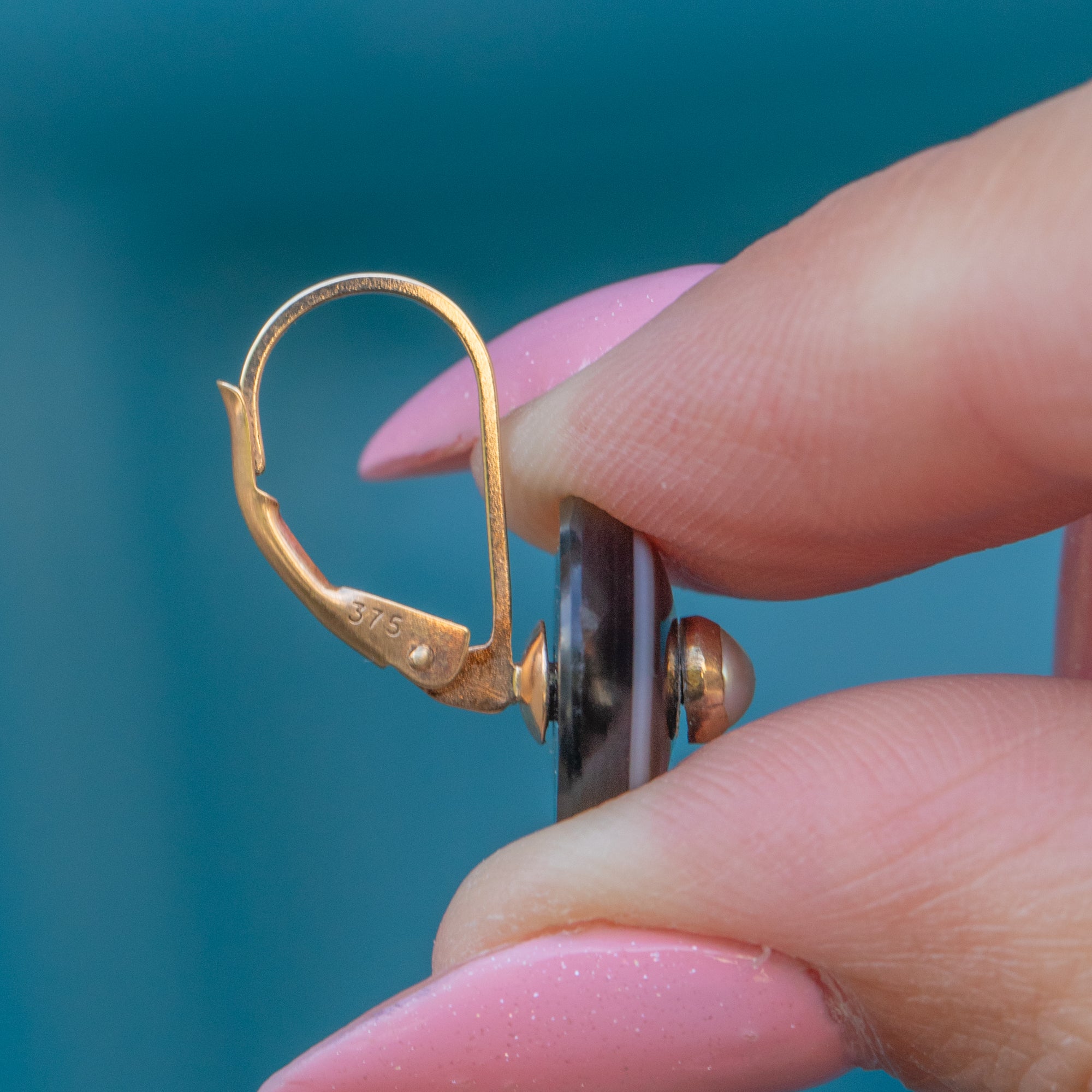 VERY GOOD-EXCELLENT: These antique 9ct Gold Banded Agate Pearl earrings are in lovely condition. The Agates are perfectly smooth and the Pearls are securely affixed. There is some mild surface wear to the Pearl settings, but the Pearls are secure and show no wear to their nacre. With robust lever-backs, you can confidently wear these Victorian earrings!