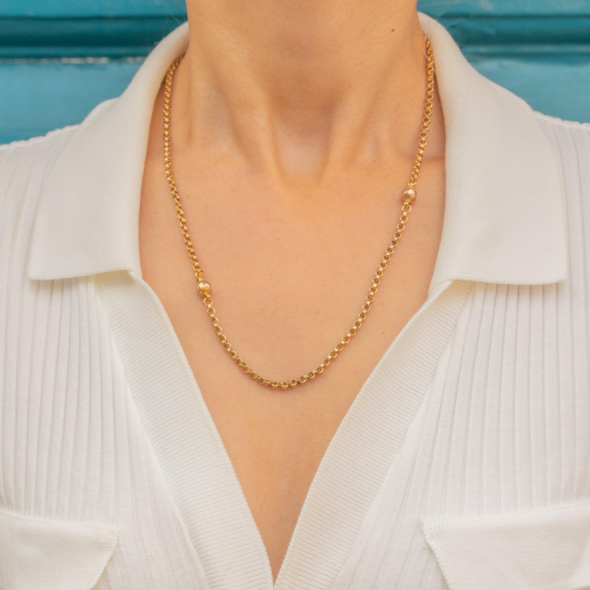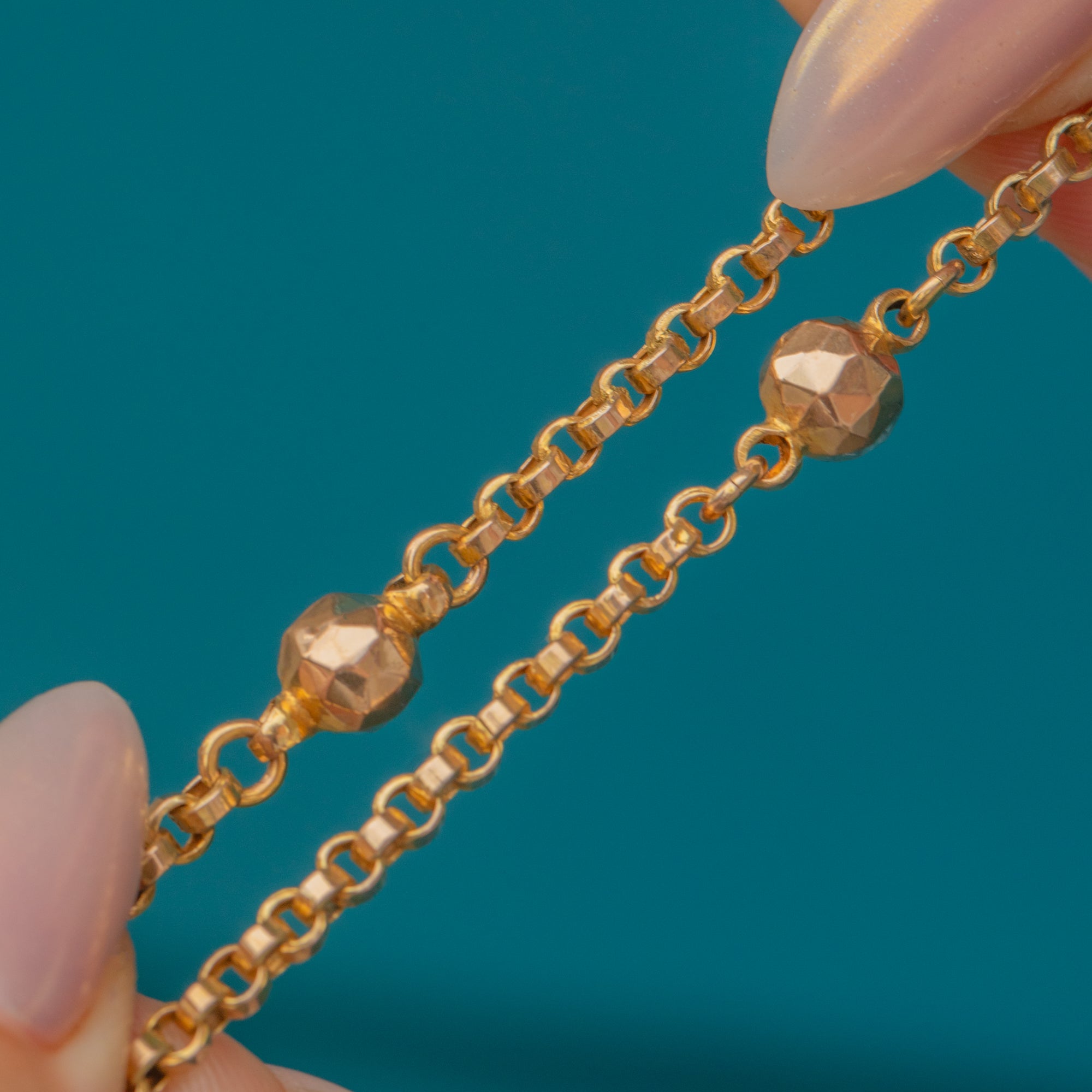The faceted beads catch the light beautifully, adding subtle shimmer along the length of the chain. Finished with a secure 9ct Gold bolt-ring clasp, this chain is both stylish and practical, embodying the craftsmanship of fine antique jewellery.