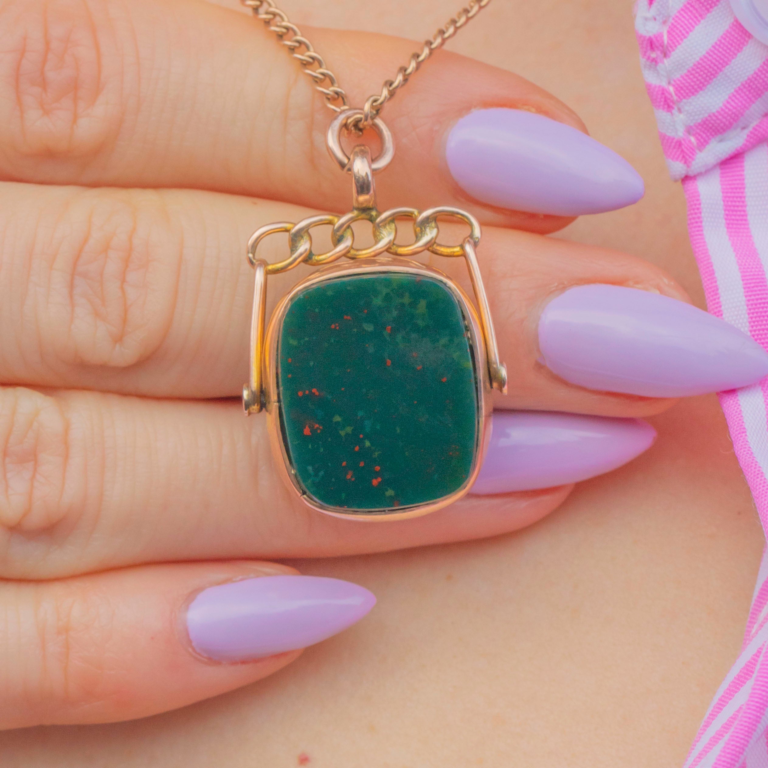 This is a charming antique 9ct Gold Bloodstone Carnelian swivel fob pendant! Highly sought after in the world of antique jewellery, this piece is inlaid with a smooth cut of deep wine red Carnelian and a softly speckled forest green Bloodstone.