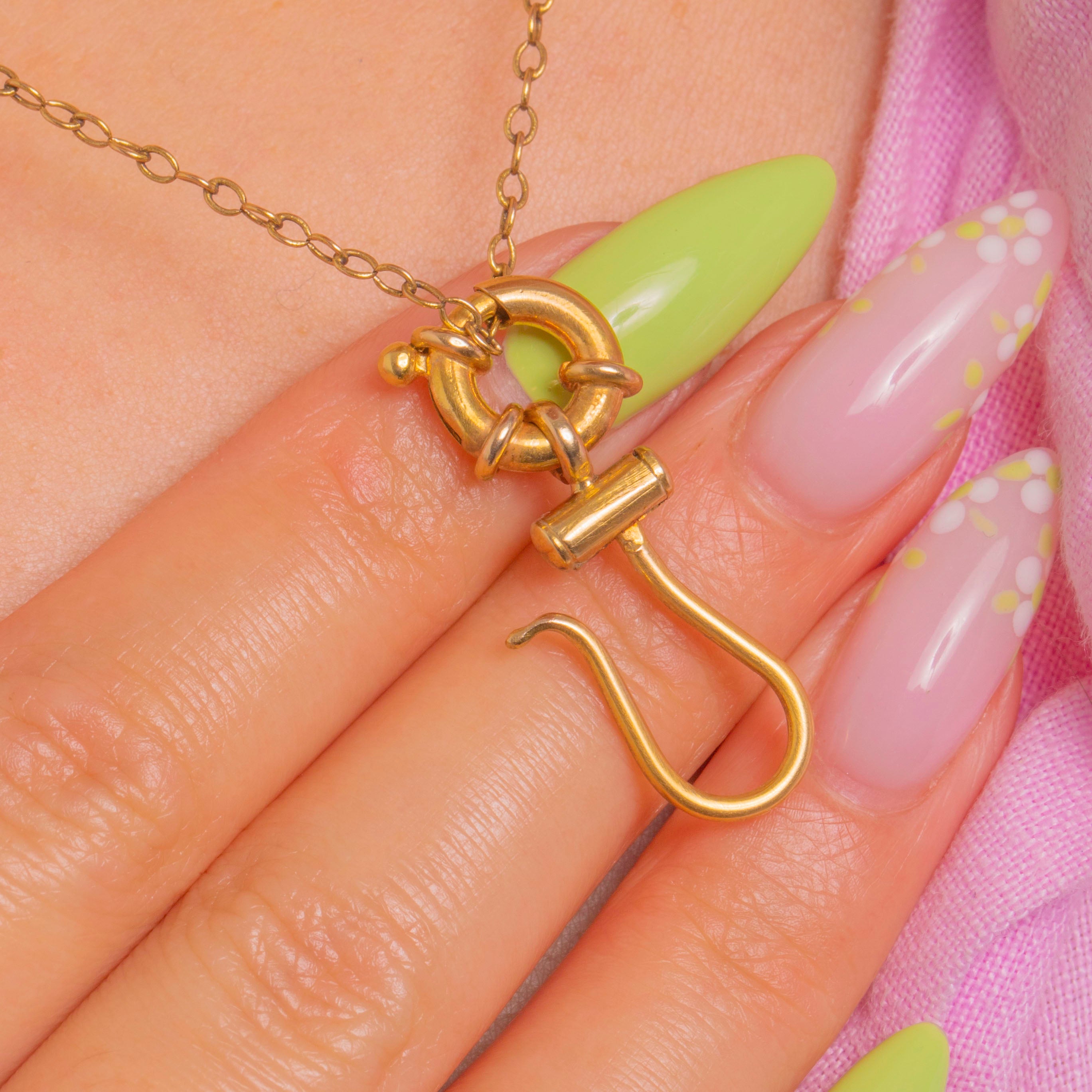 A sculptural Victorian 9ct Gold bolt-ring and hook with satisfyingly chunky contours and clean, utilitarian lines. The articulated drop brings together a circular bolt ring detailed with three wrapped loops, a smooth tubular barrel, and an S‑shaped hook, creating a tactile, minimalist silhouette in warm Gold.