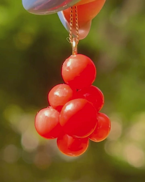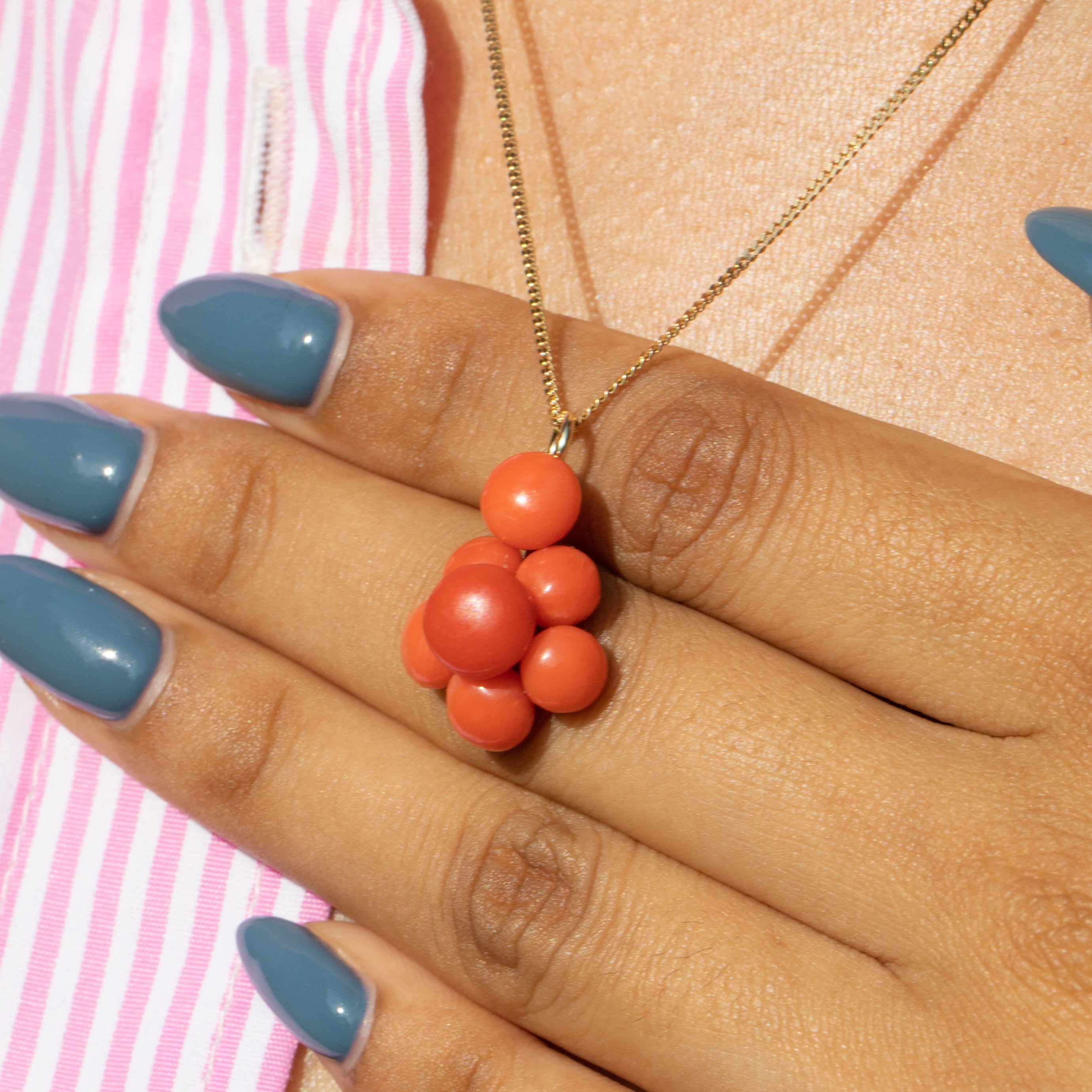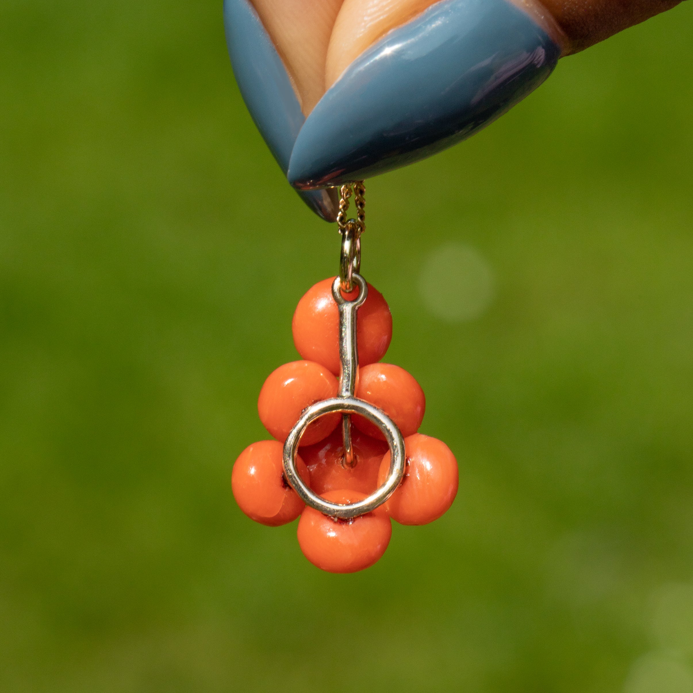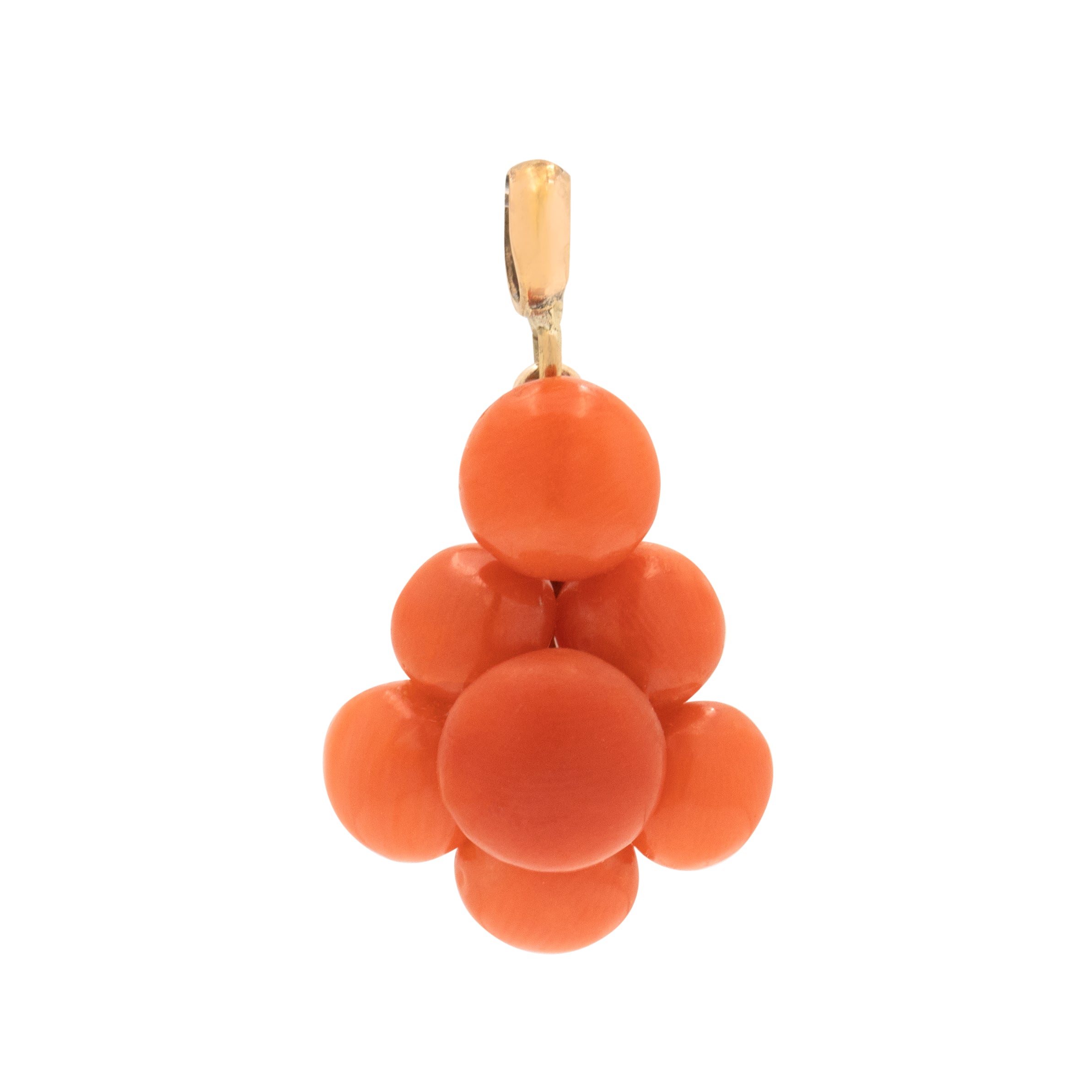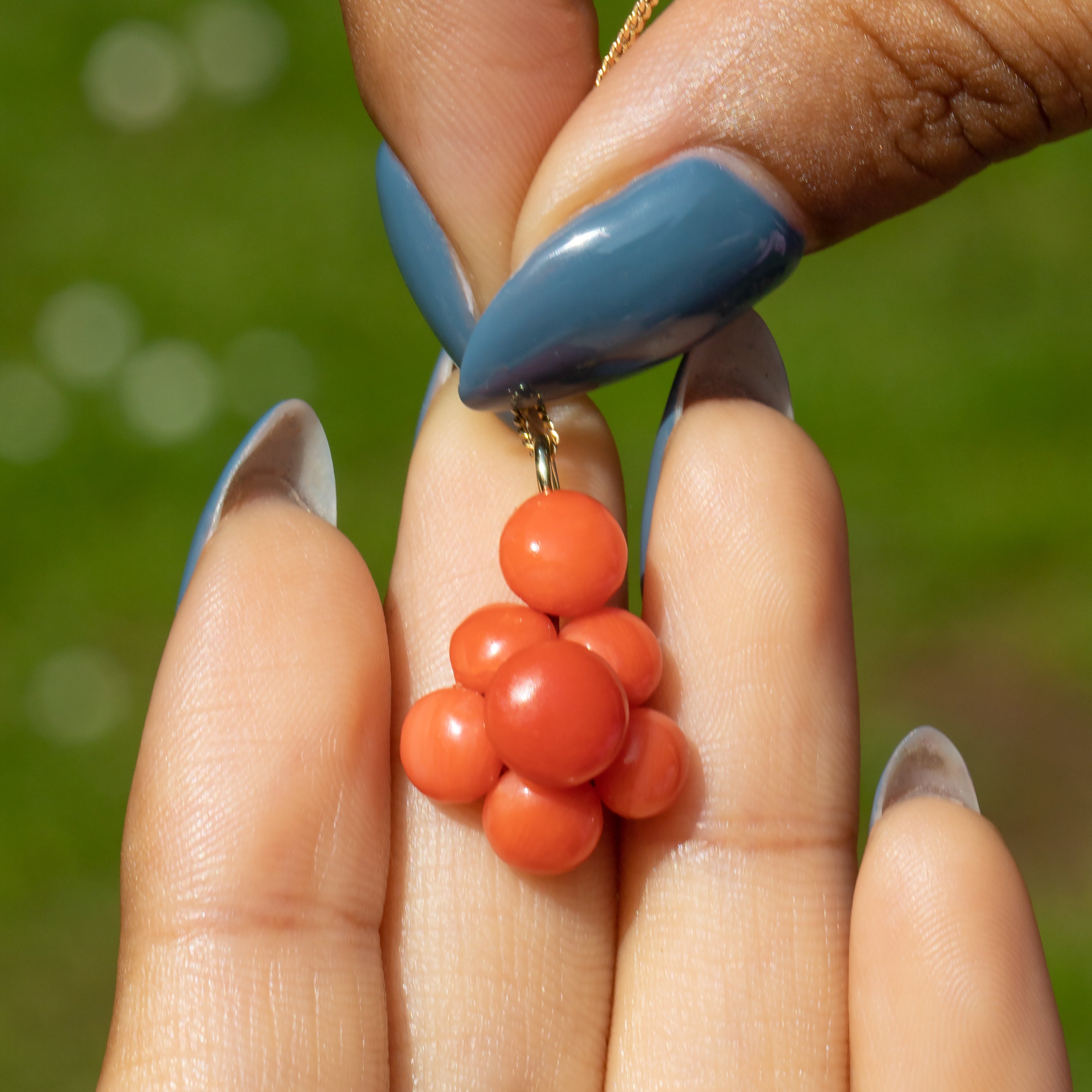 This antique 9ct Gold Coral cluster pendant is a bundle of joy! Her form is akin to bunch of grapes, layered with smooth Coral cabochons flaunting juicy grapefruit hues.