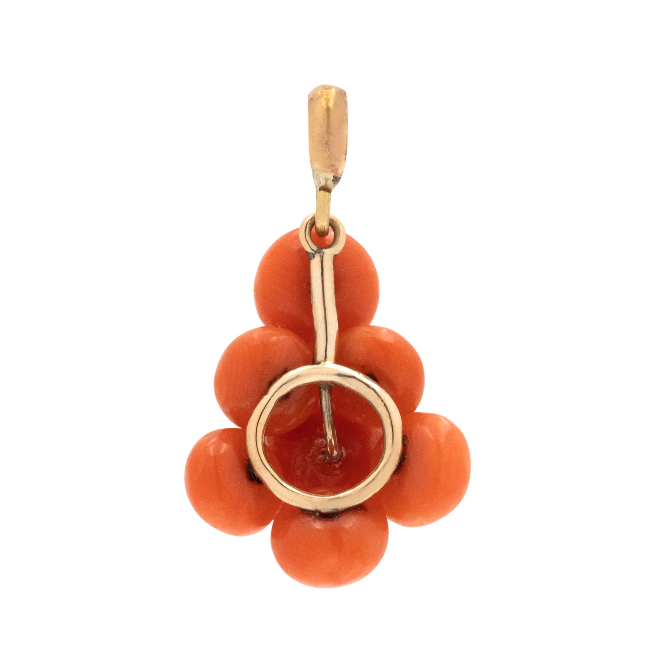 VERY GOOD-EXCELLENT. This antique 9ct Gold Coral cluster pendant is in fab condition. The Coral gems are all secured to one another and are free from chips or scuffs. There is some remanence of glue between each Coral but this can only be seen under close inspection. With a 9ct Gold jump-ring to finish, all she needs now is a Gold chain to suspend her from!