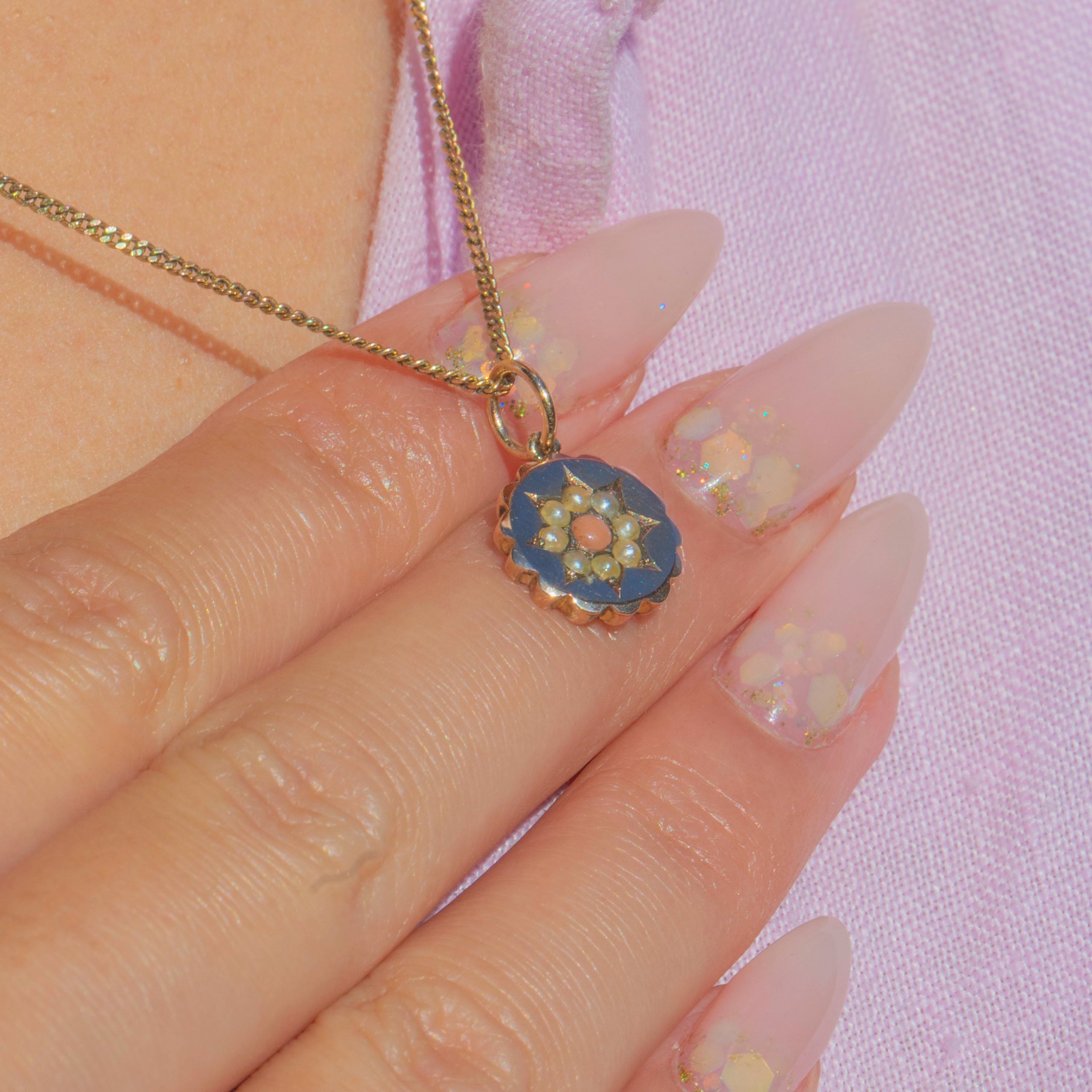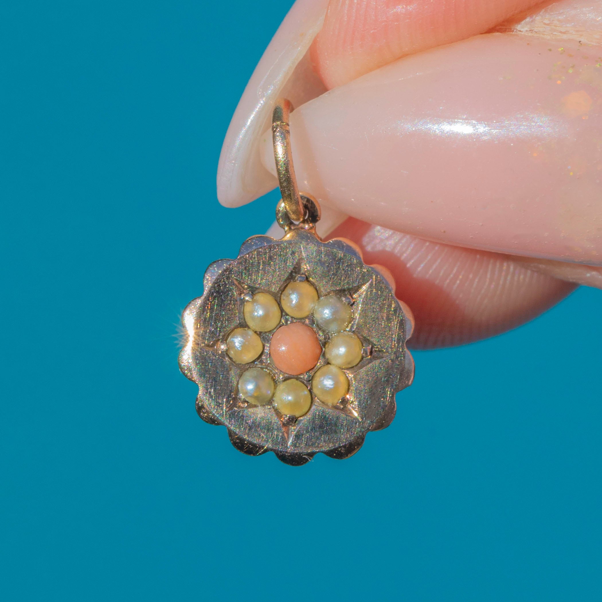 Circa 1870, this sweet antique charm is crafted in 9ct Gold, set with a delicate arrangement of Pearls surrounding a single coral cabochon centre. The design forms a charming flower motif, a style much loved in the Victorian era.
