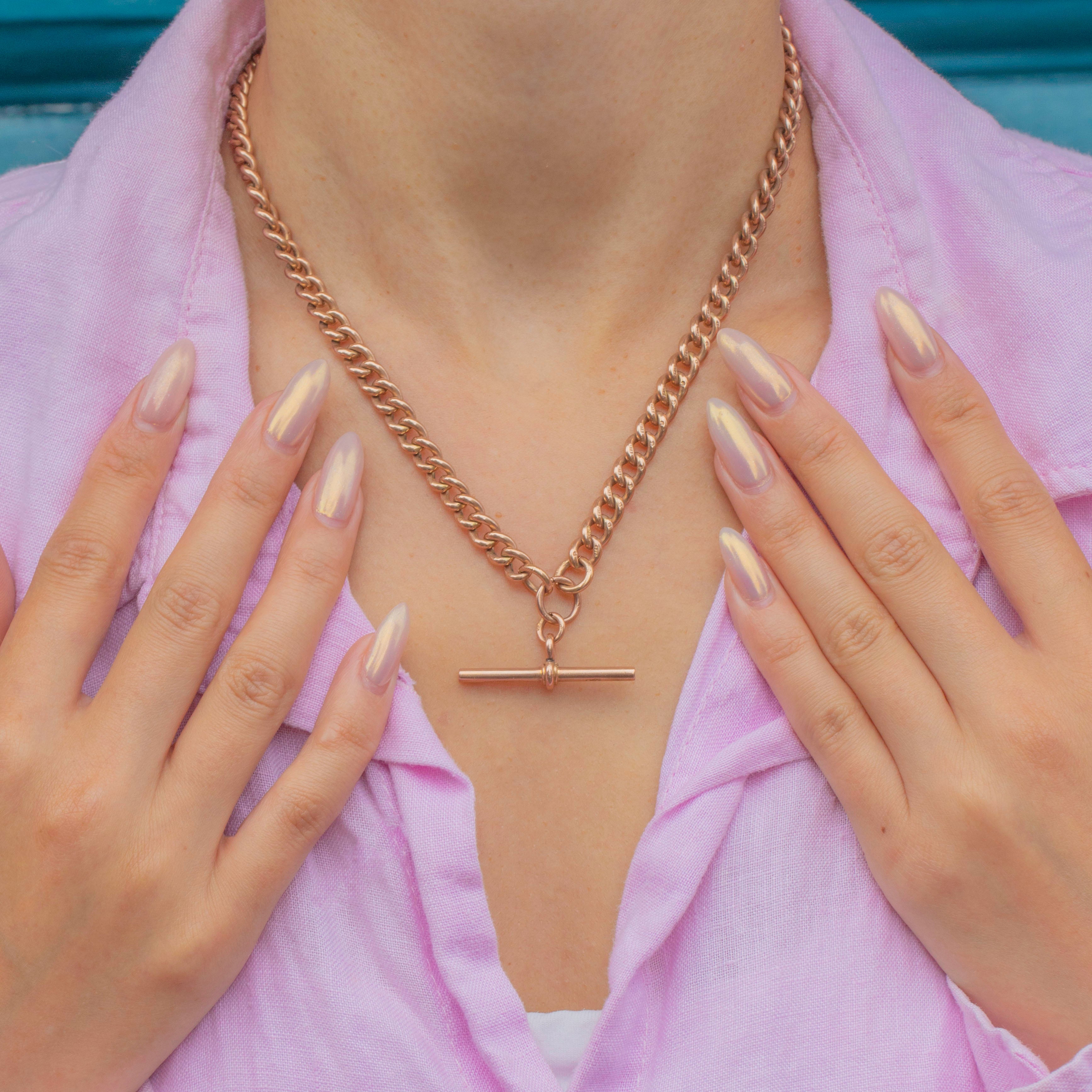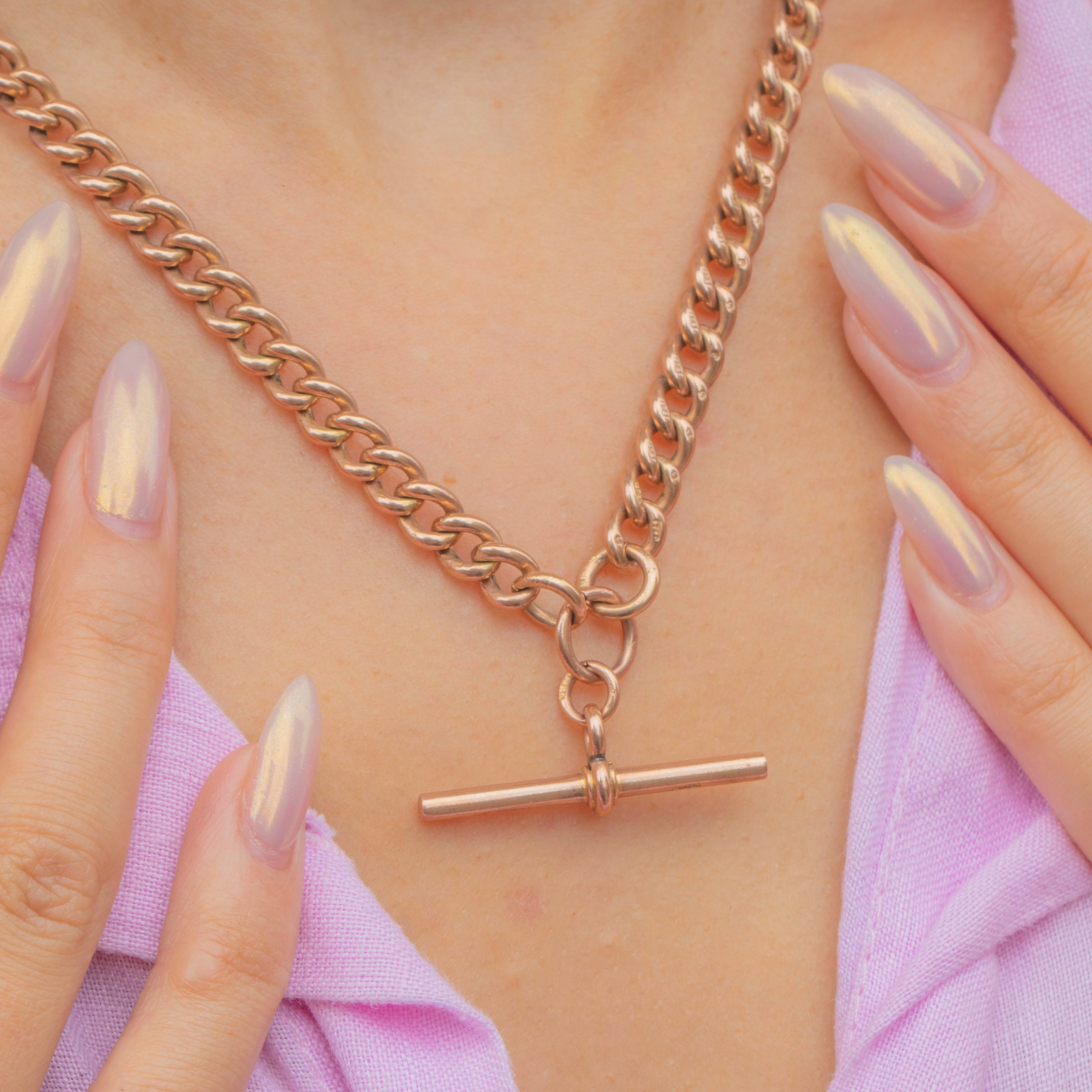This impressive antique Albert chain is crafted in solid 9ct Gold, featuring classic curb links and weighing a substantial 41.6g. The chain is fitted with both a dog-clip and bolt ring, complete with a traditional T-bar drop, all stamped with the maker’s mark and Gold standard.
