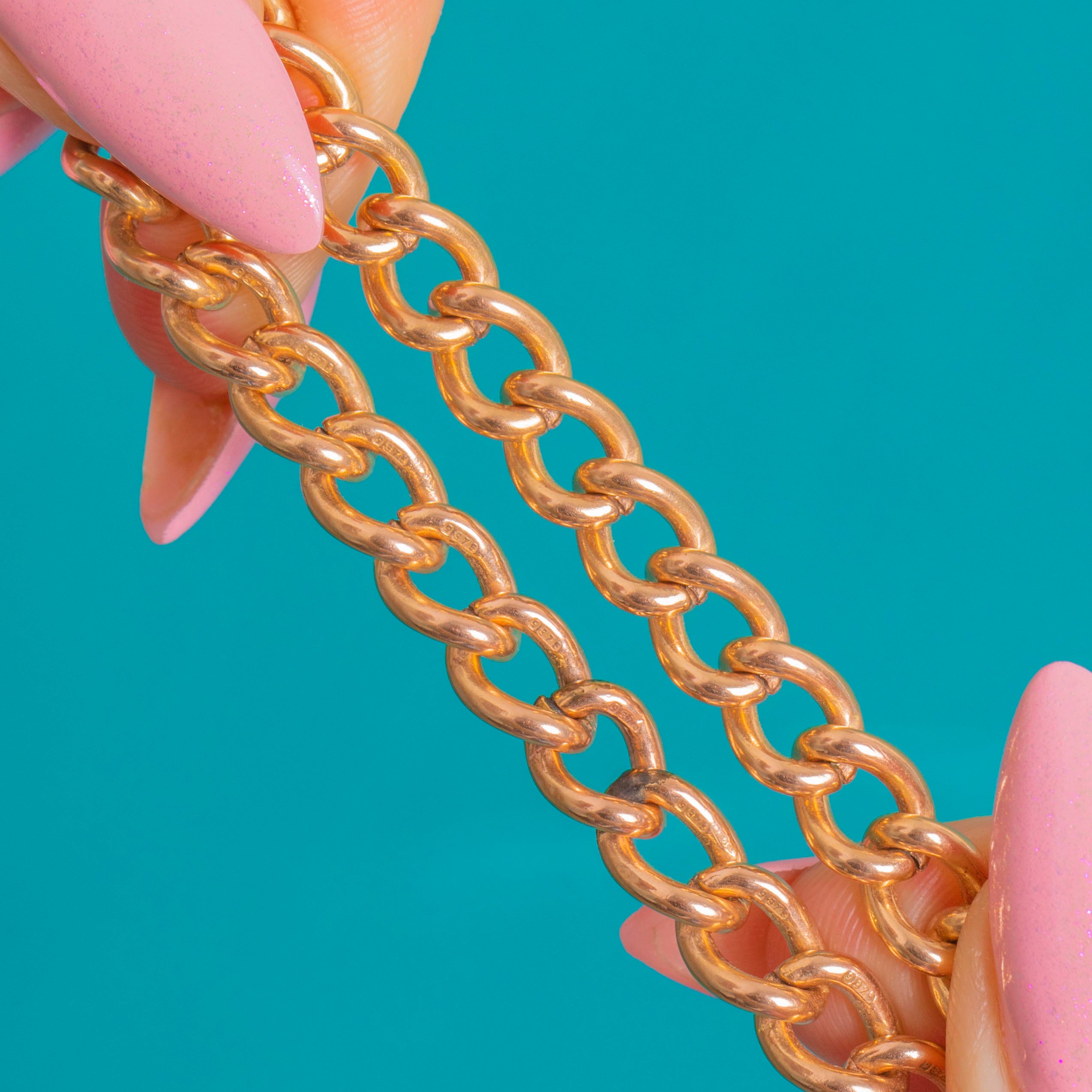 EXCELLENT: Light surface hairlines and a gentle patina consistent with age, with crisp engravings and clear hallmarks to the padlock. The curb links are in very good order with no noticeable thinning or visible repairs, and the padlock hinge and clasp operate securely. Overall, this piece has been well cared for and is ready to wear.