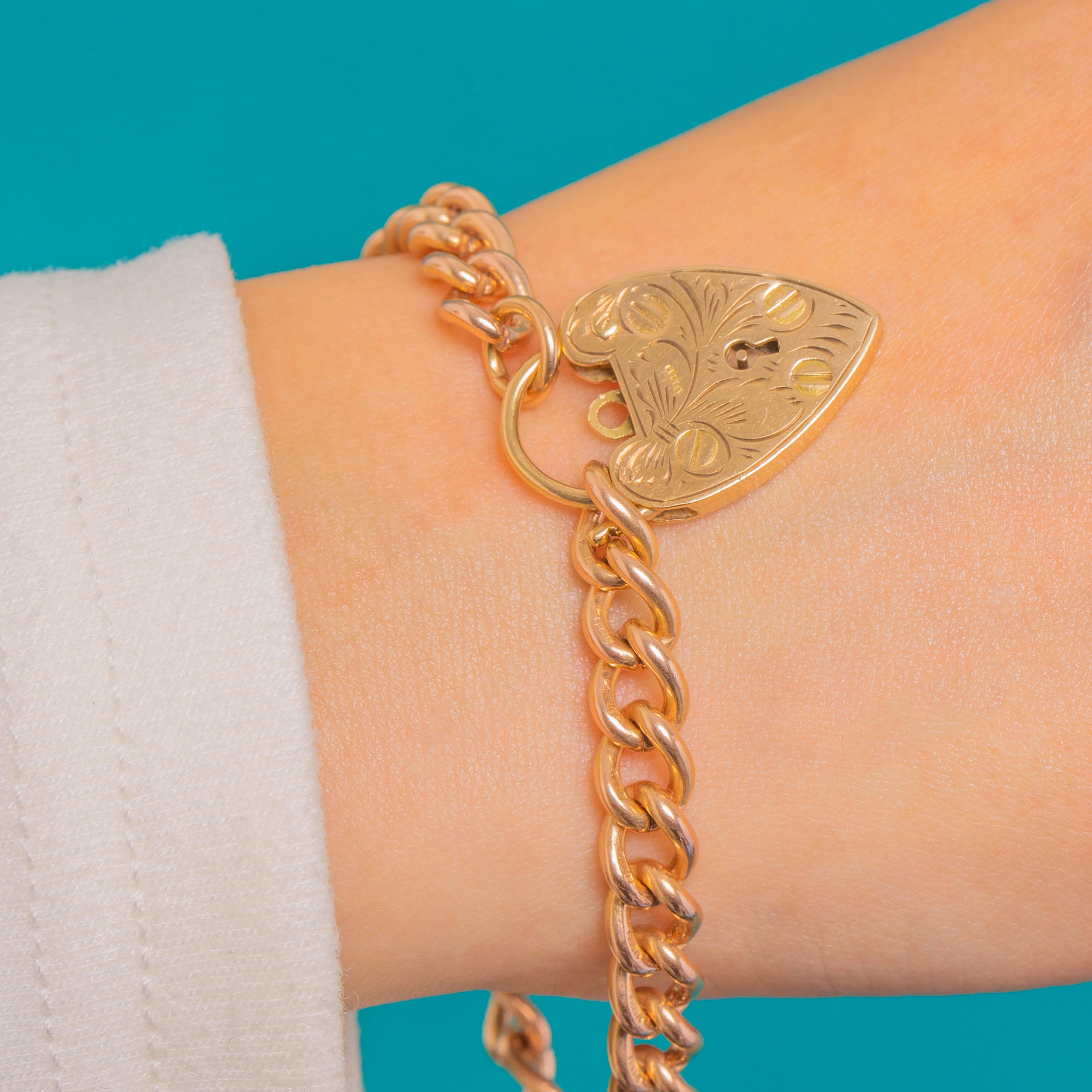 The heart padlock is removable and functions as the clasp, giving you the option to wear it on other chains or bracelets as you please. The uniform curb links drape smoothly on the wrist, while the crisp engravings and clear hallmarks on the padlock underscore its quality. A timeless, wearable treasure with true sentimental charm.