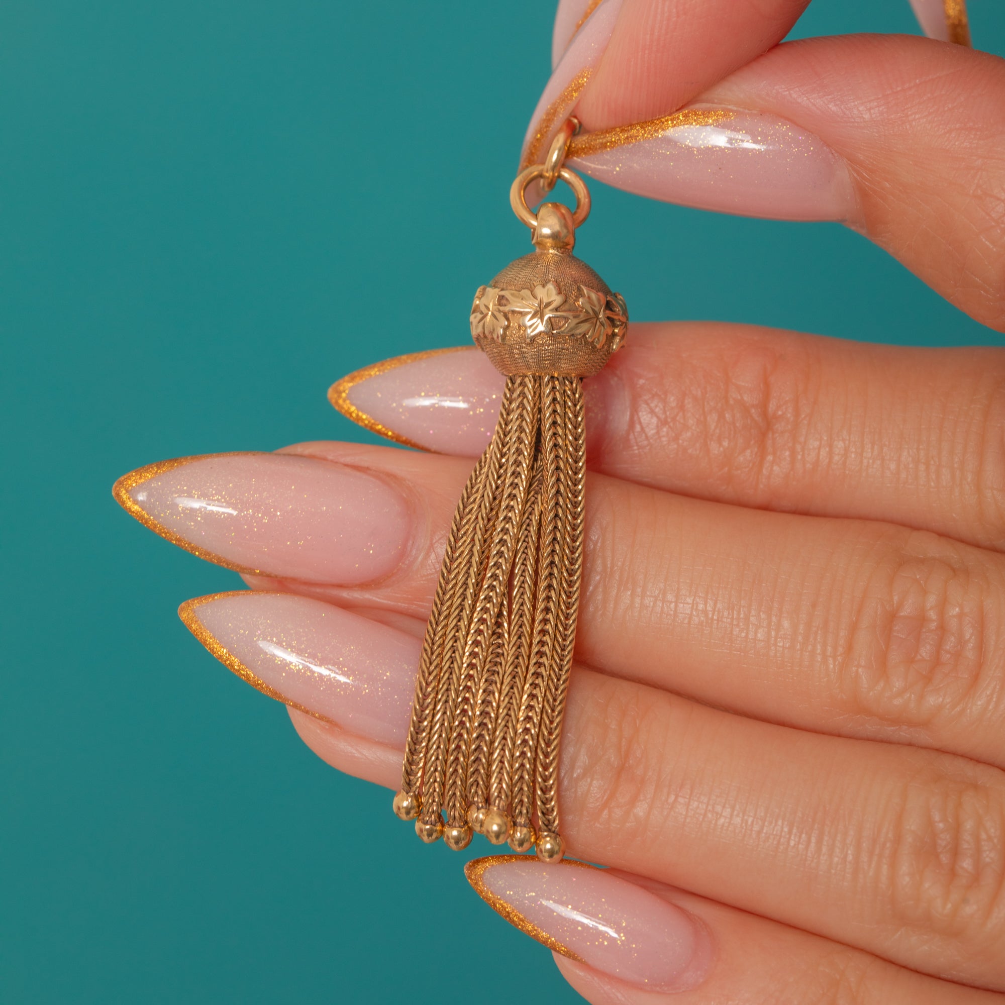 This wonderful Victorian tassel charm is richly detailed with fig and ivy leaf motifs, a lovely domed cap, and fully articulated fox-tail tassels that sway beautifully with every movement. Crafted in warm 9ct Gold, it has that perfect antique texture—crisp beading, deeply chased leaves and a soft aged glow that only true Victorian pieces develop over time.