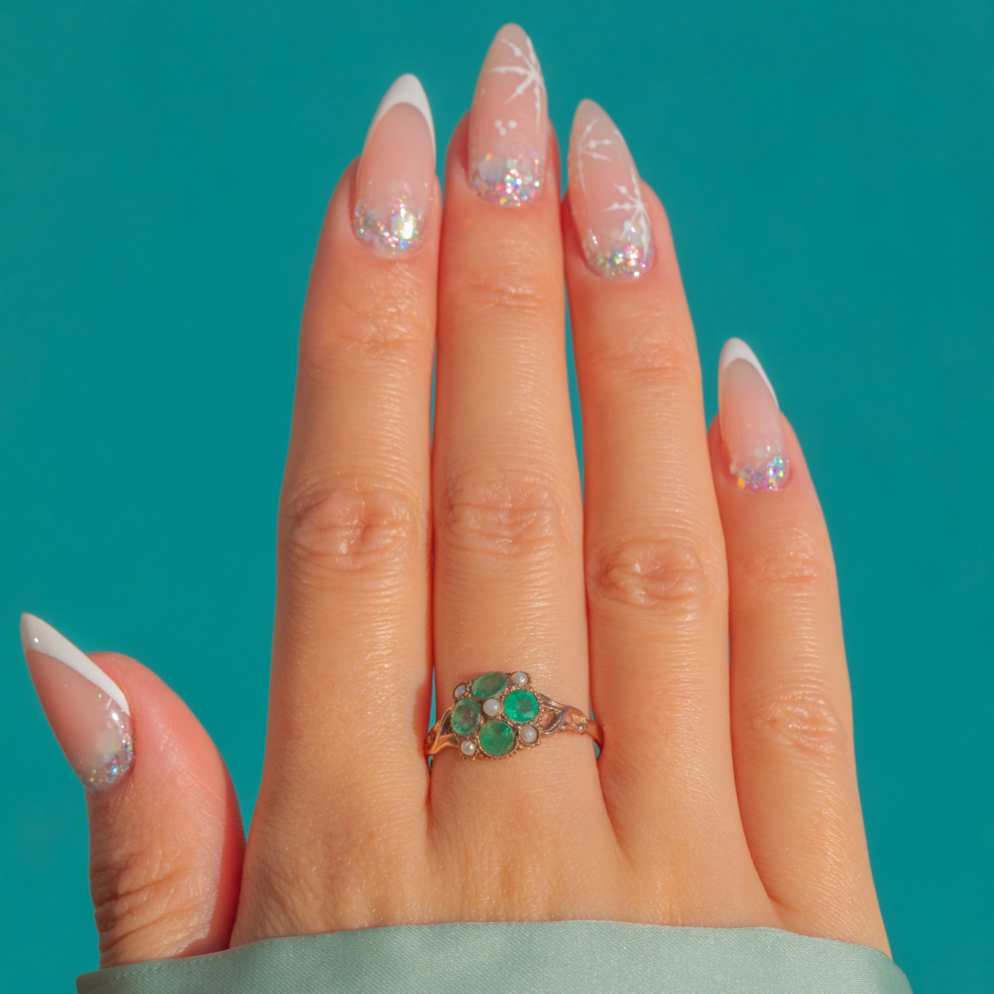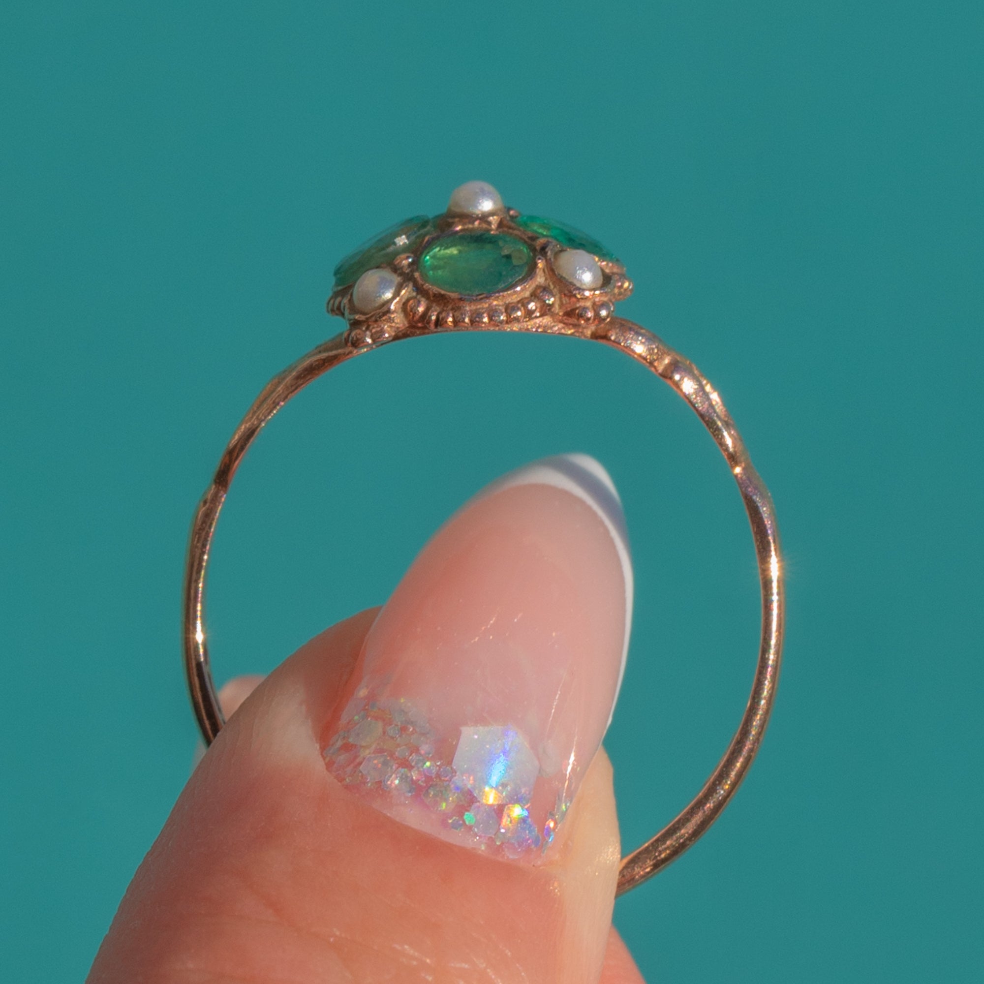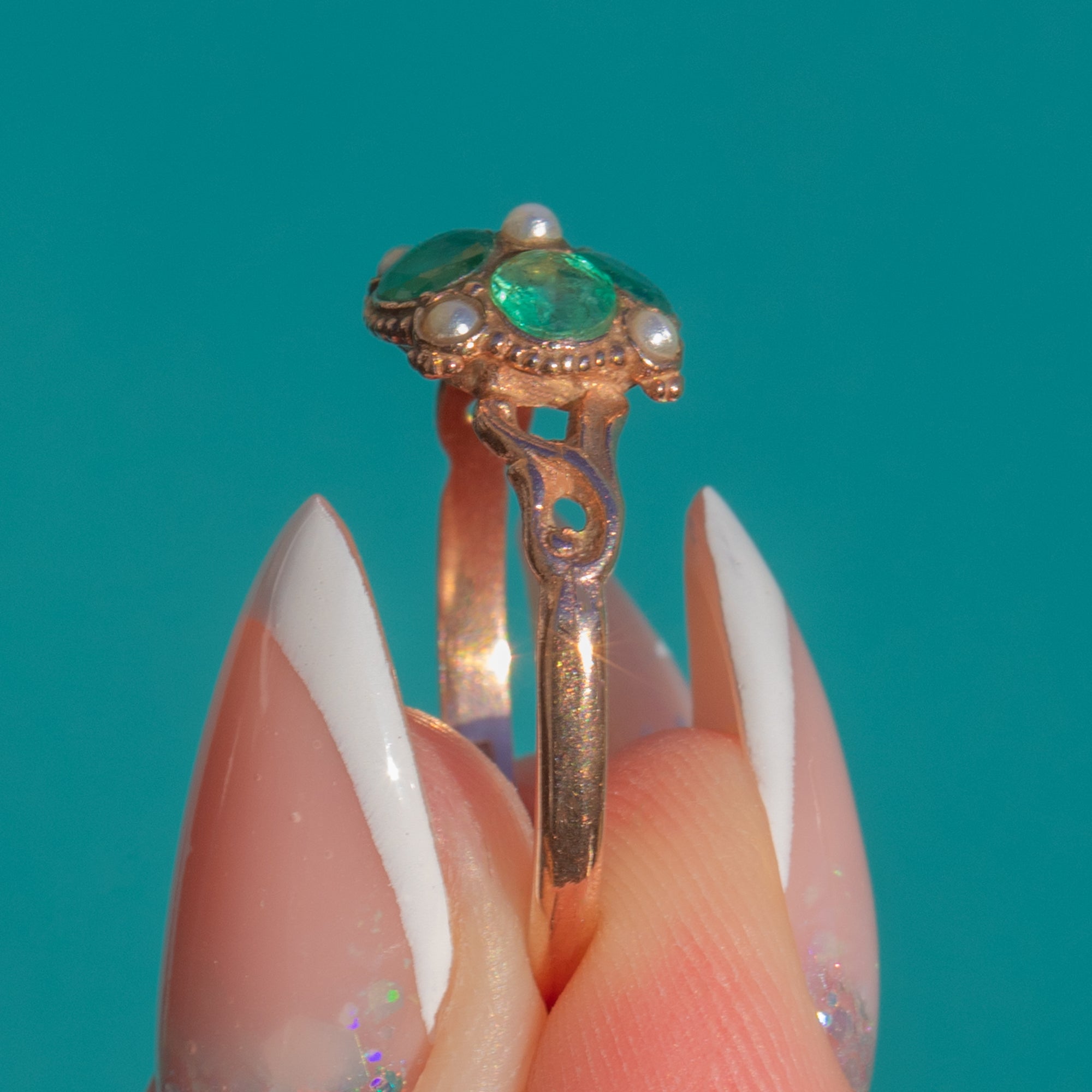 This charming Victorian Emerald and Pearl cluster ring is full of colour, character, and classic 19th-century elegance. Crafted in warm 9ct Gold, the rounded cluster is set with four vibrant green Emeralds accented by delicate Pearls, creating a soft and romantic antique glow.