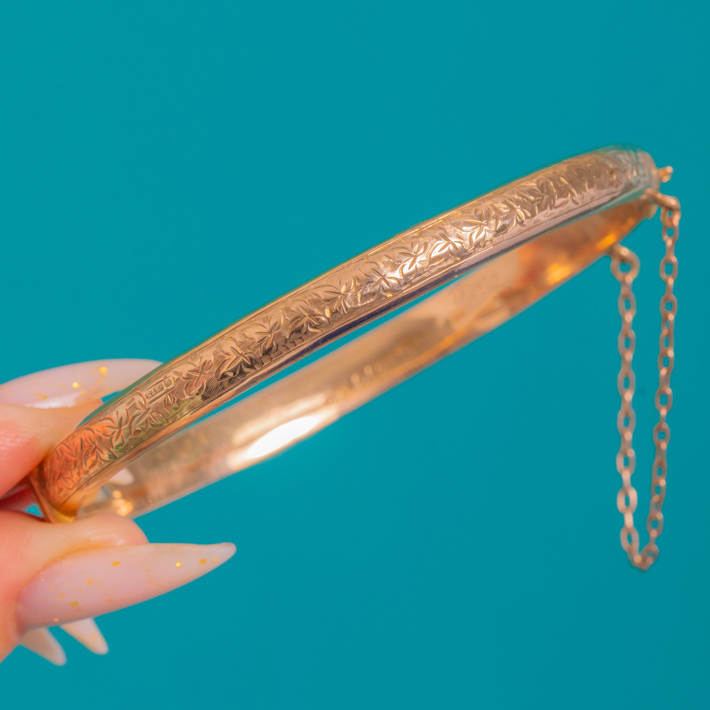 Delicately engraved and beautifully refined, this 9ct Gold hinged bangle dates to c.1912 and brims with charm. The outer face is bright-cut with trailing foliate scrolls, framed by fine polished borders that catch the light against its warm yellow-to-rosy glow. Its oval, D-section profile offers an elegant, timeless silhouette.