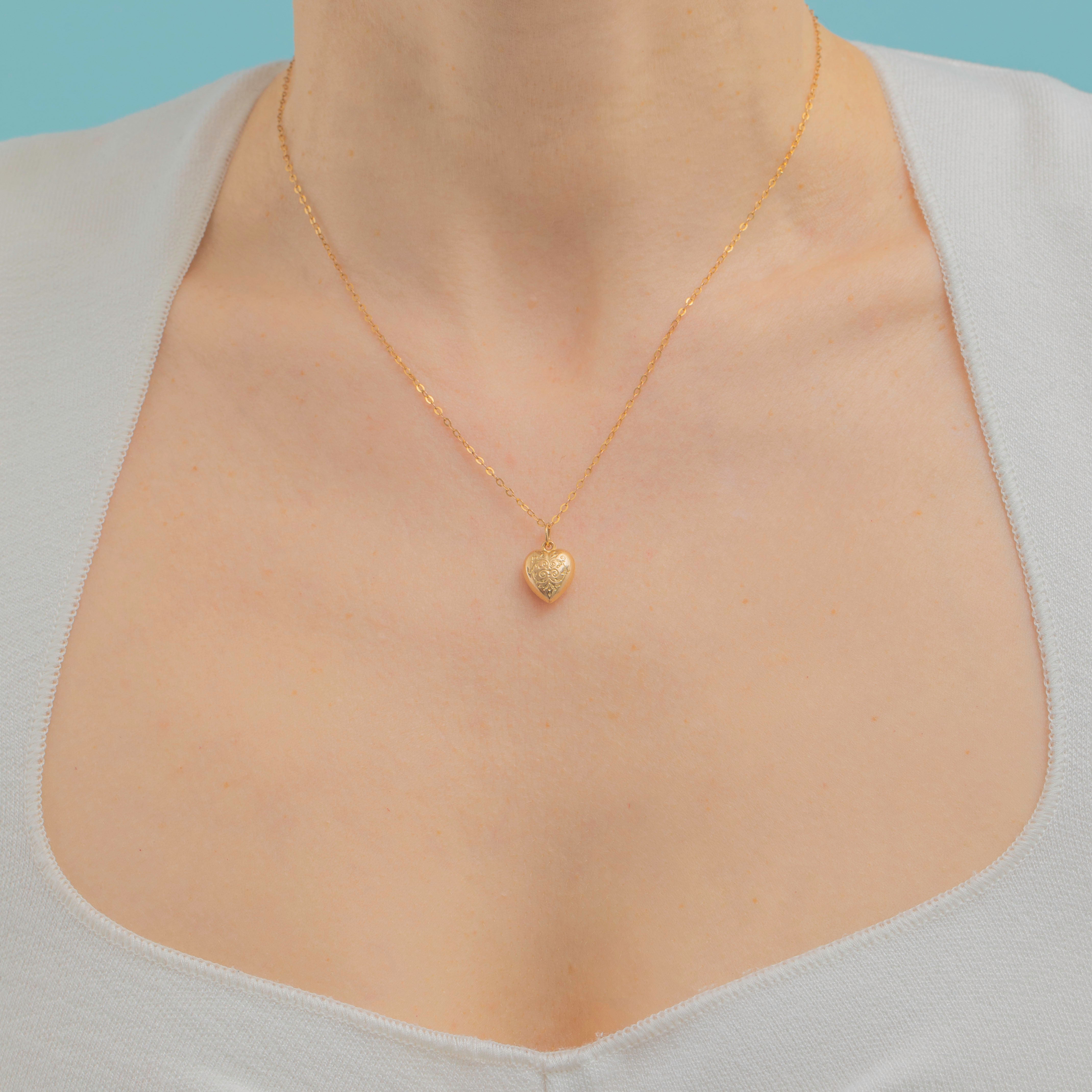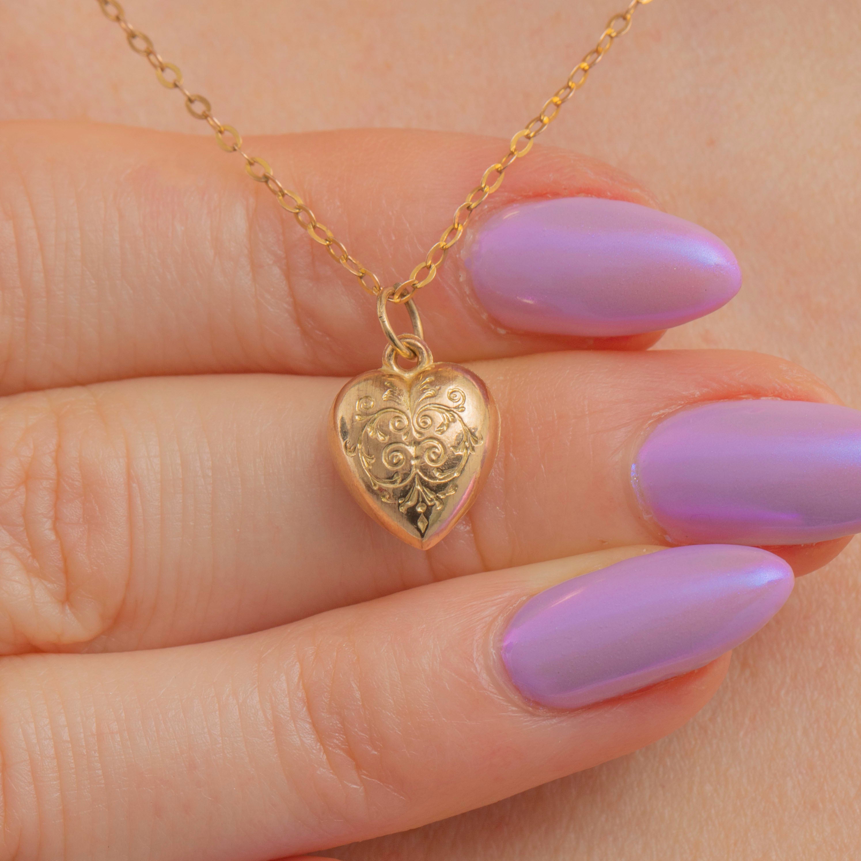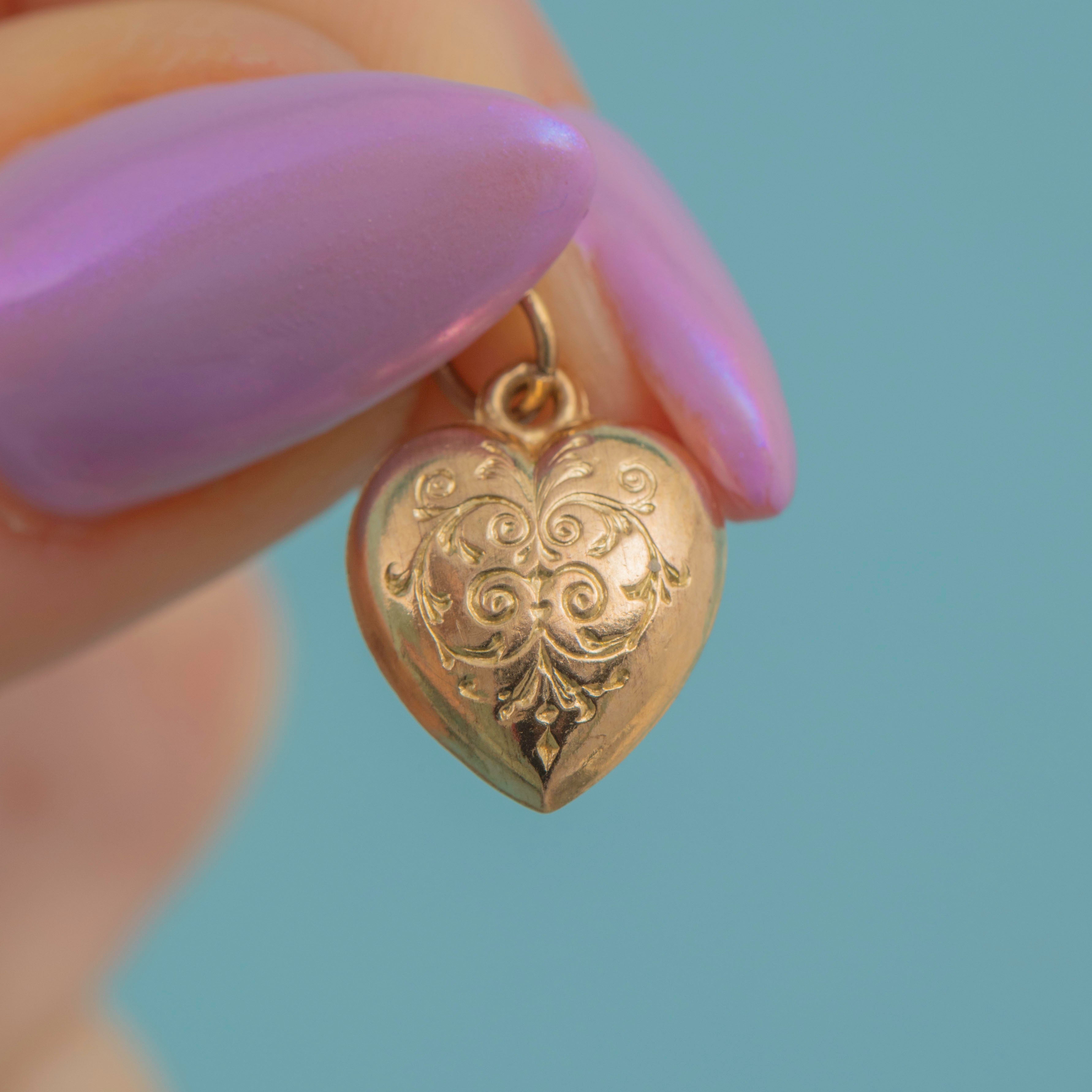 VERY GOOD. This antique engraved 9ct Gold heart charm is in very good condition. The heart is crafted from buttery 9ct Gold that radiates warmth from her puffy form. The engraved details are crisp and clear, despite being over 100 years old! Her gorgeous chain rests beautifully between your collarbones, while there some wear to the colour of the Gold next to the bolt ring, the rest of the chain is bright and saturated with minimal wear. Victorians are praised for their sentiment and symbolism within jewellery, and this heart charm is certainly no exception!