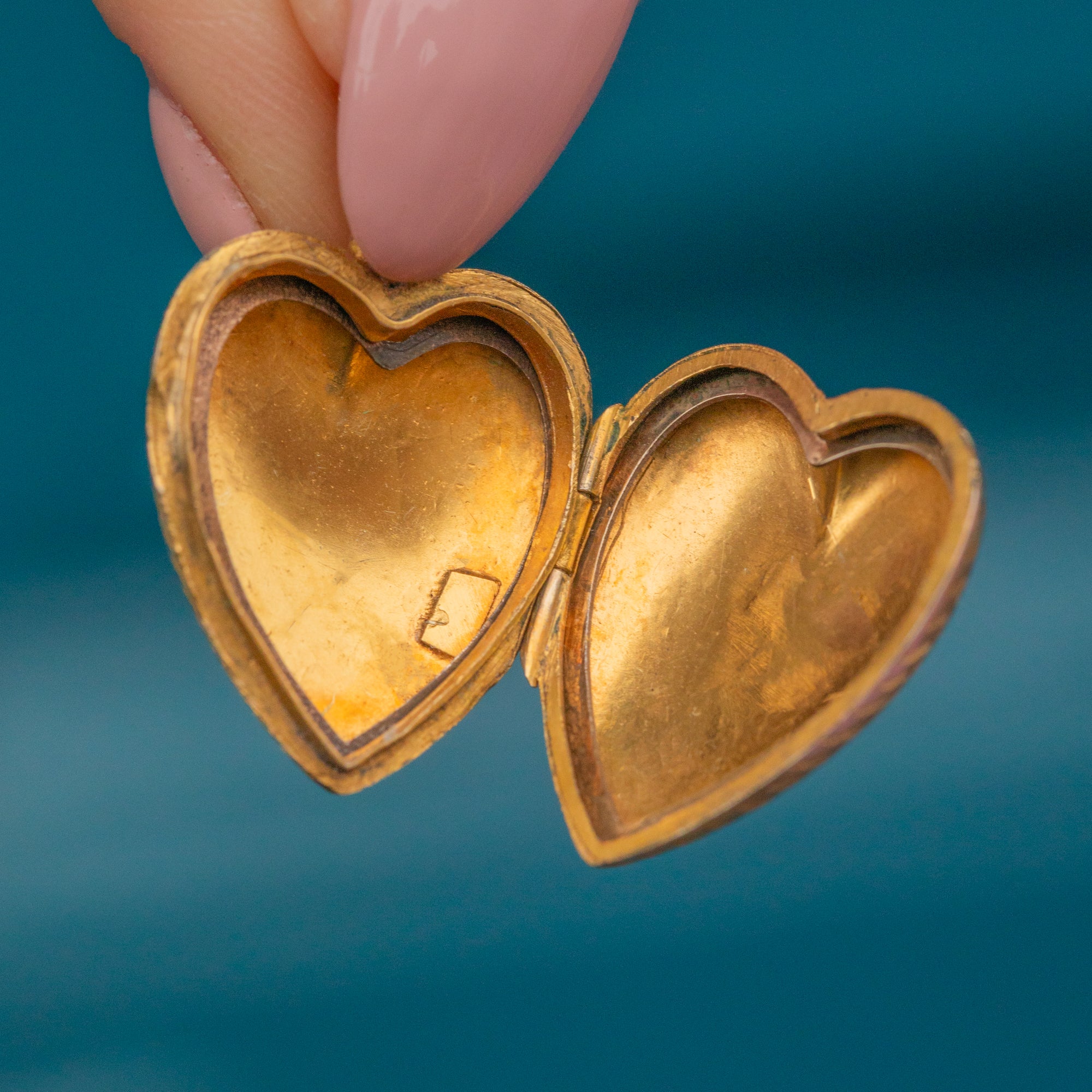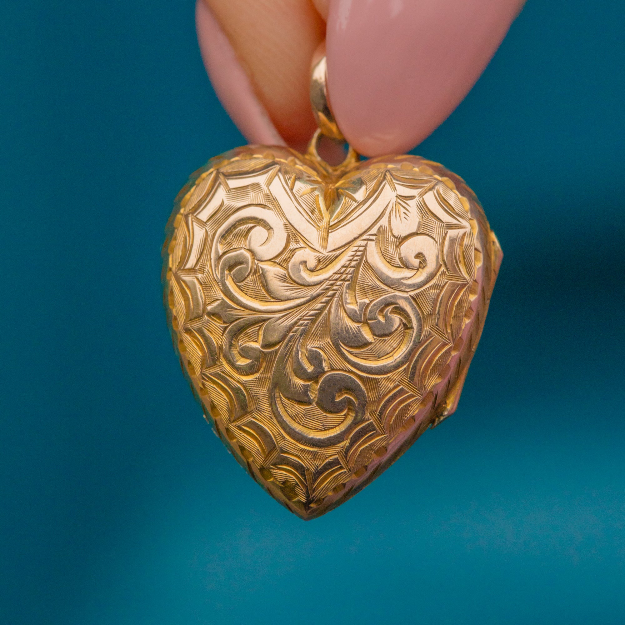 VERY GOOD. This antique 9ct Gold engraved heart locket is in very good condition. The engravings are crisp throughout, and the Gold has a lovely saturation. There is a scratch on the cartouche but this is barely noticeable. There is some wear to the border inside, but nothing that affects her overall splendour. With both frames present, you have room to place two photographs inside. This Gold locket is a true Victorian delight!
