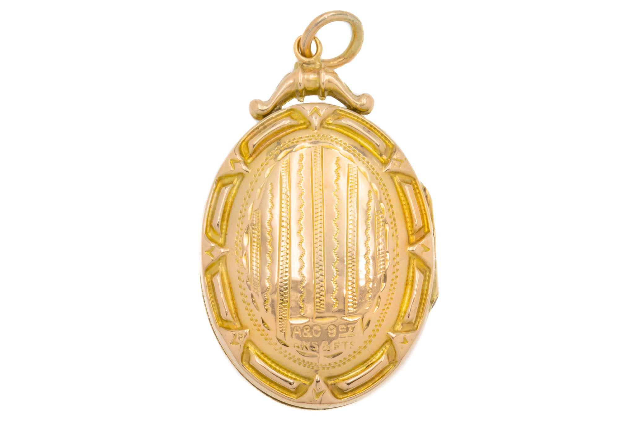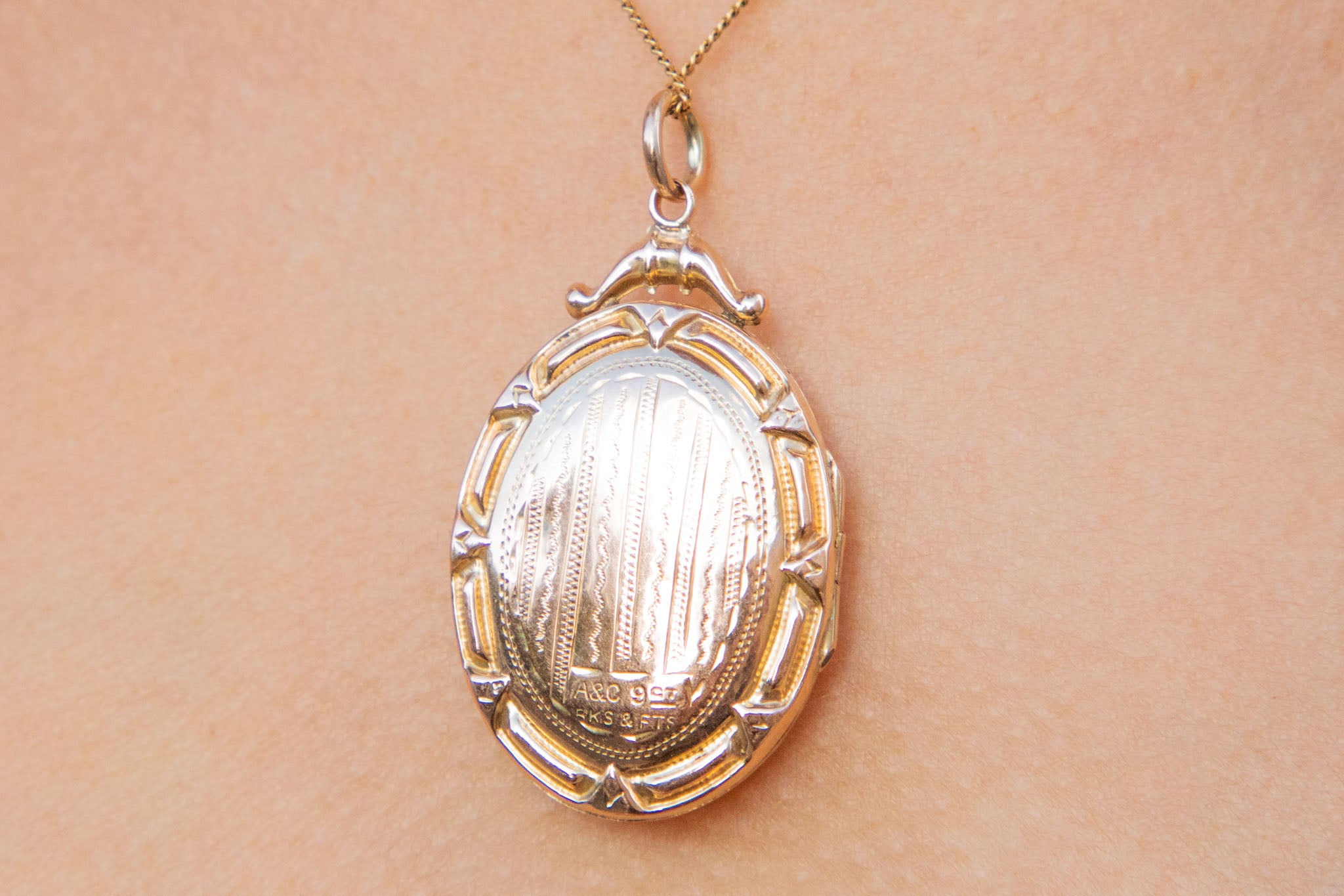 VERY GOOD. This 9ct Gold engraved oval locket is in lovely condition throughout. Her unique engravings are crisp and look magnificent against her saturated 9ct Gold. Her Gold is bright and she has retained a gorgeous shape, with her hinge mechanism in great working order. Inside, she contains both frames to keep photographs securely in place. Her doors close with a 'click' and although it looks as though there is a slight gap when they are together, they are securely shut. Having been well and truly loved over her lifetime, she is ready to be loved for many more!