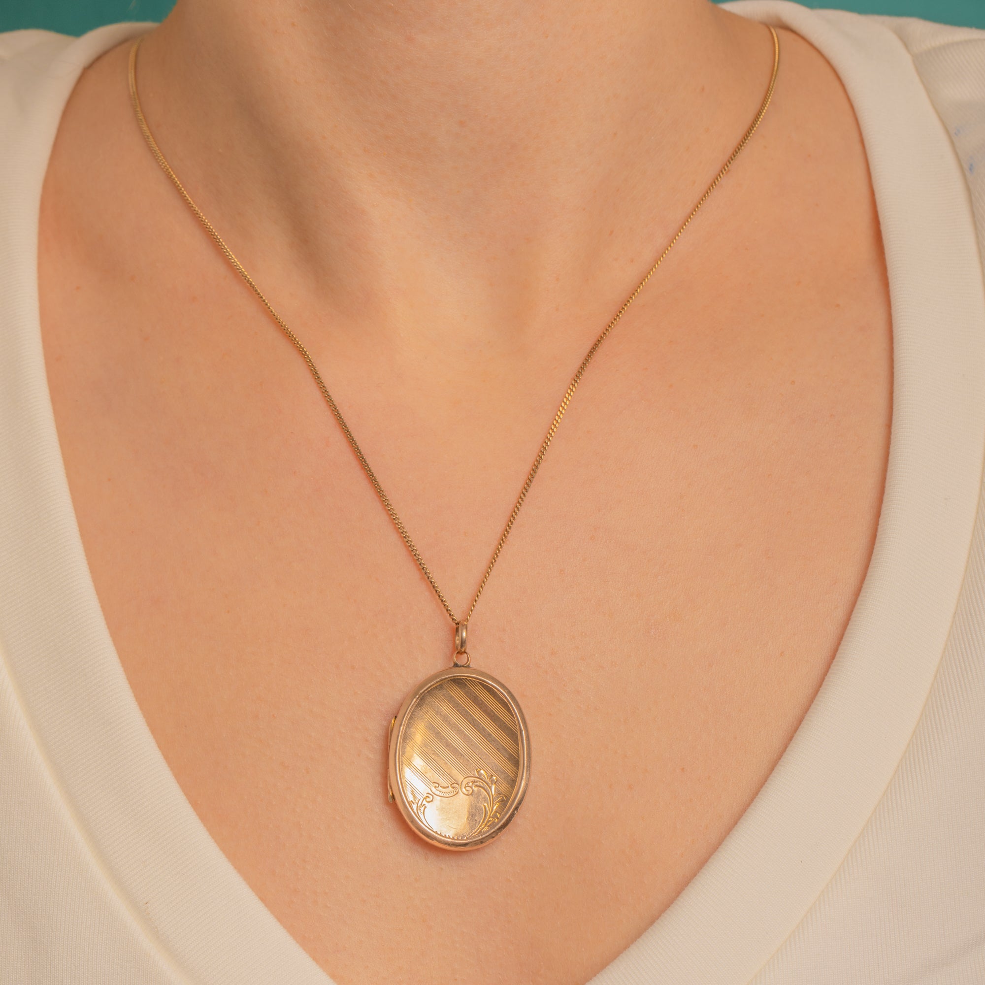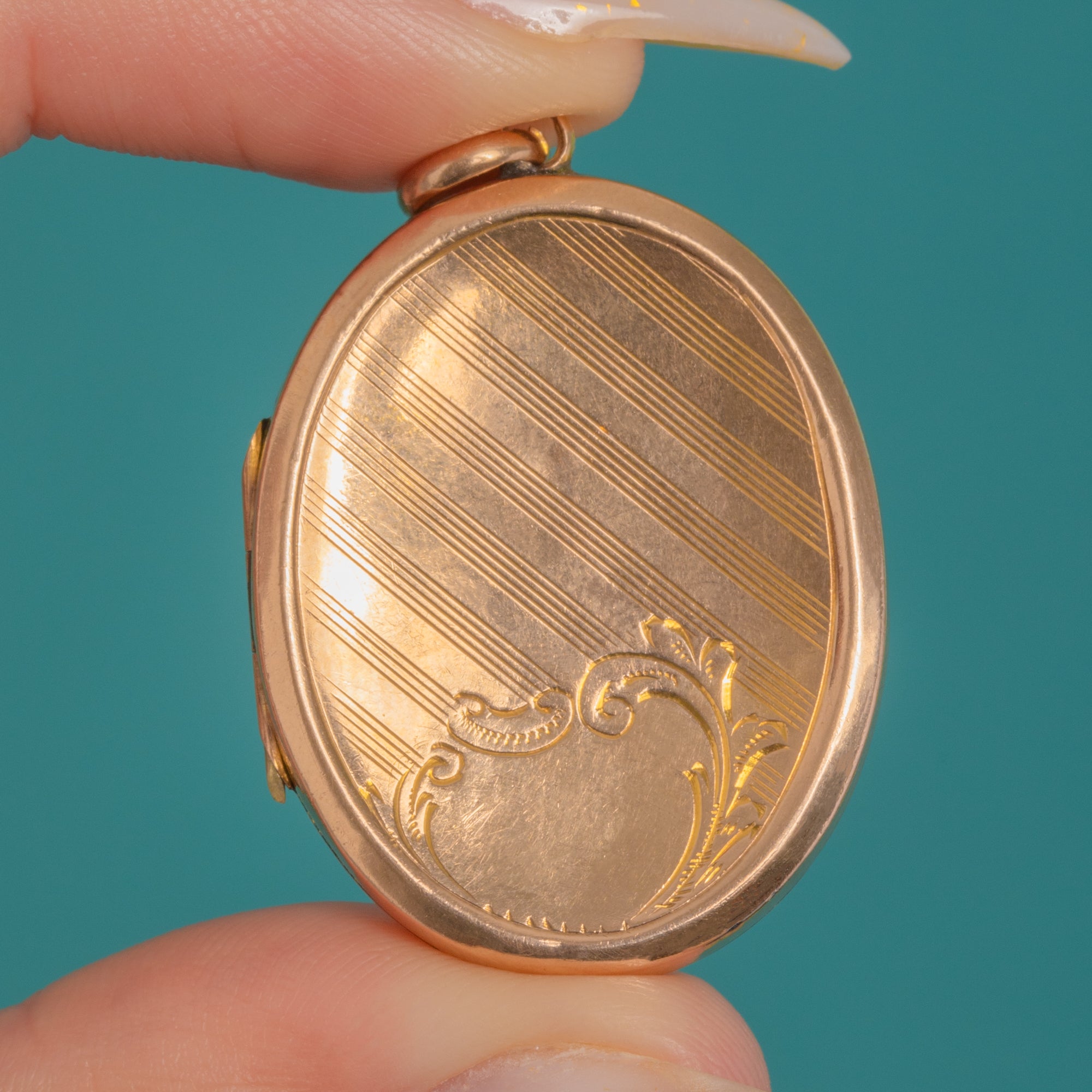 Refined and beautifully wearable, this Edwardian oval locket is crafted in 9ct Gold with a warm yellow-rosy glow. Both faces are adorned with crisp engine-turned diagonal stripes, anchored by a blank scroll cartouche ready for a personal engraving—classic, elegant and forever chic.