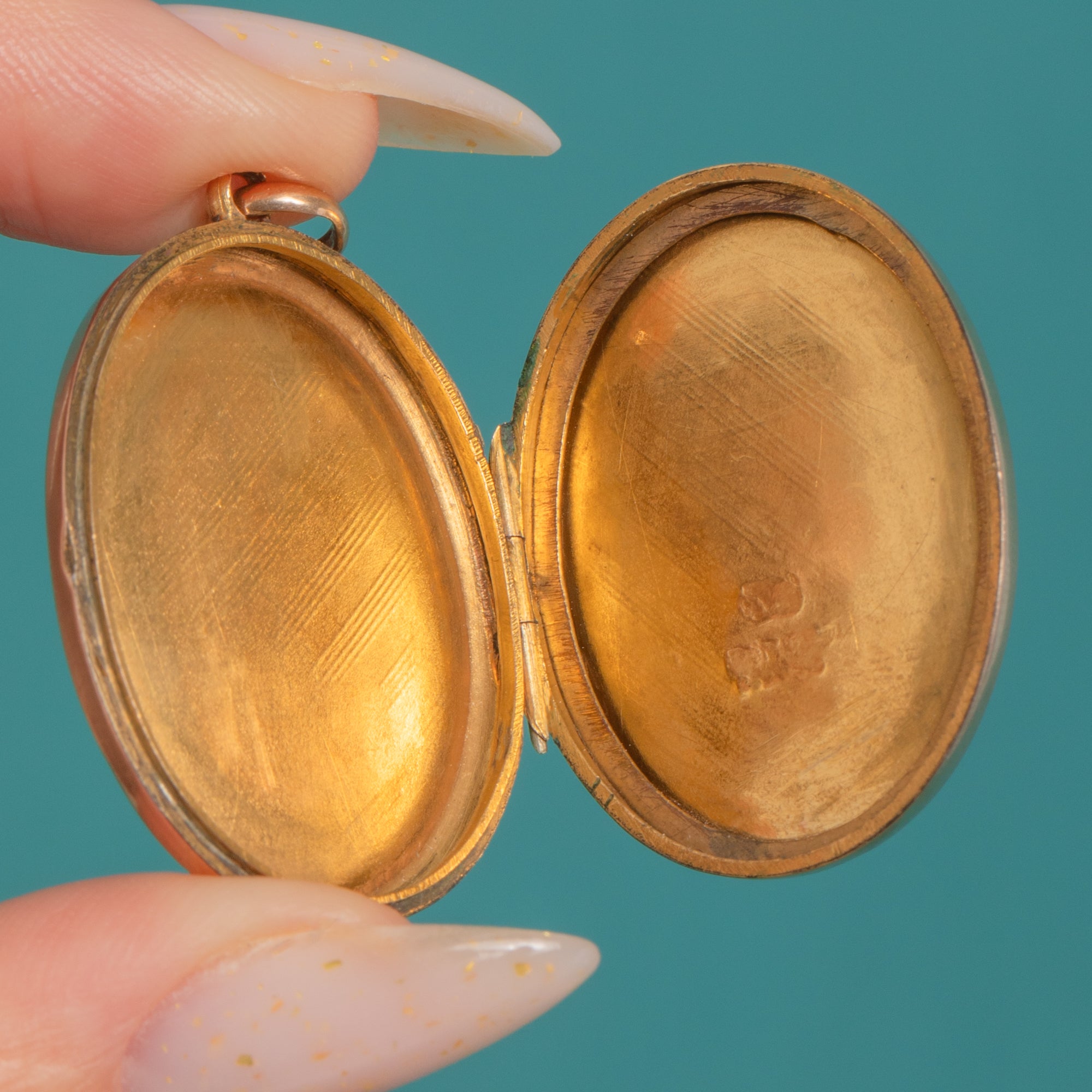 The locket opens to reveal two compartments with raised rims for cherished photographs or tiny mementos, and closes securely with a satisfying click. A fixed hasp and jump ring make it easy to style on your favourite chain, while its gentle patina adds depth and character to the timeless design.
