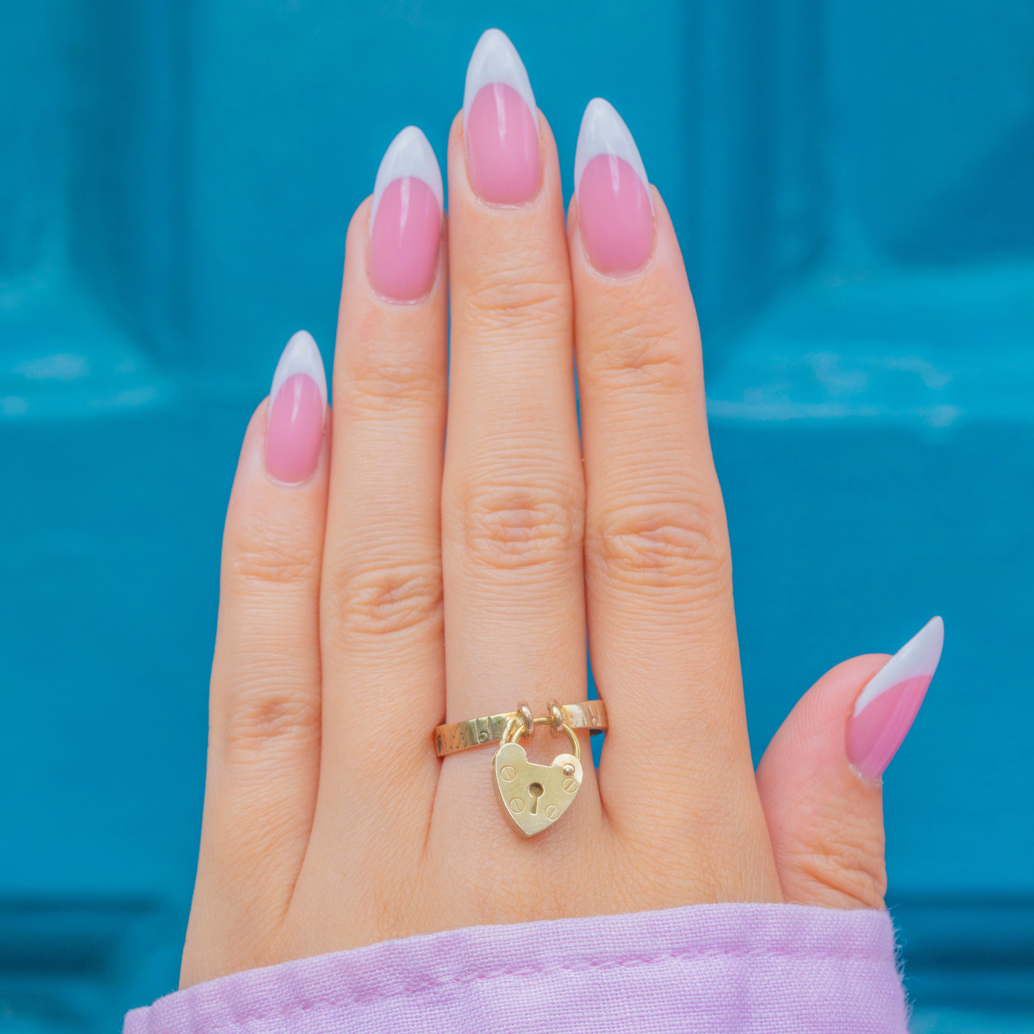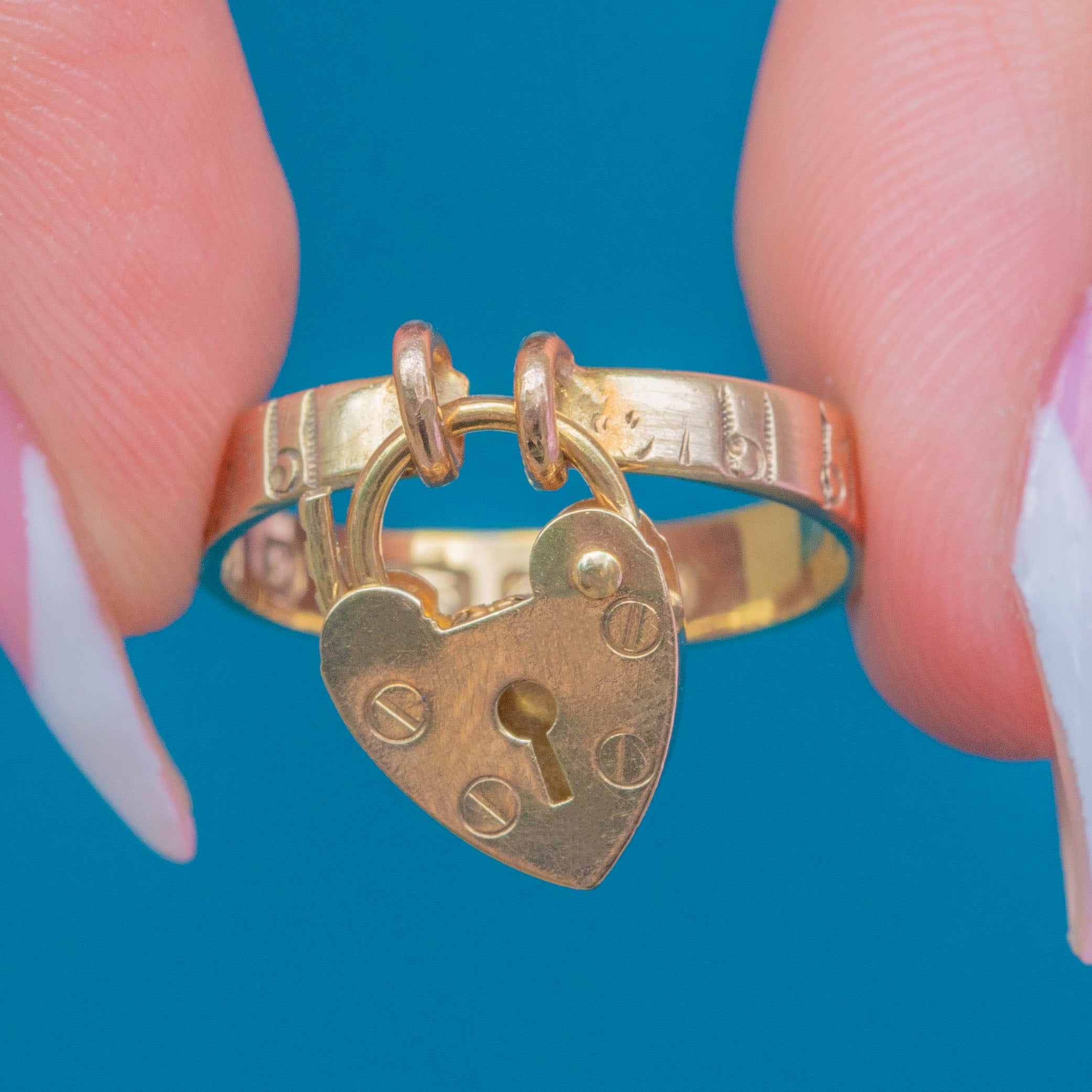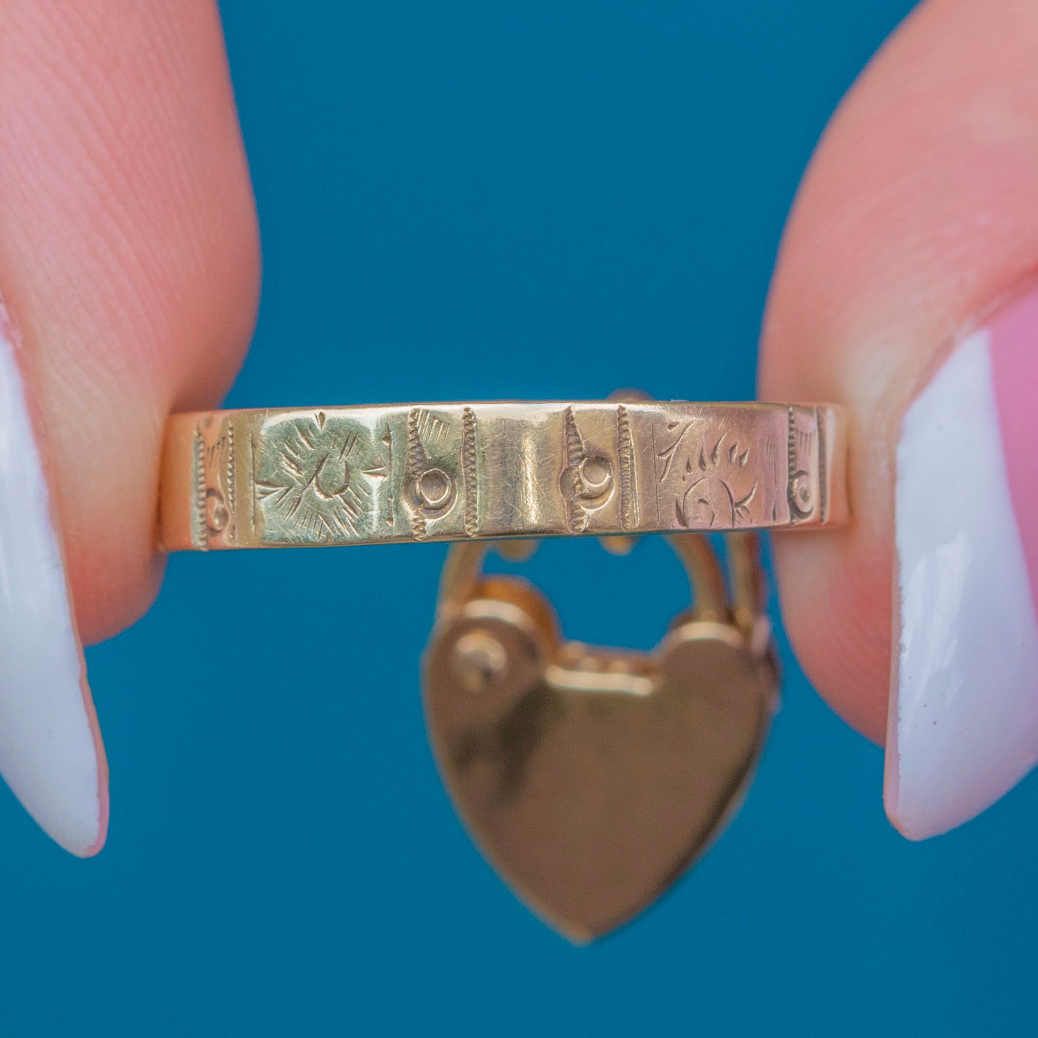 This adorable Post-Edwardian 9ct Gold engraved ring, complete with a heart padlock charm, is a timeless piece perfect for everyday wear! Meticulously crafted from saturated 9ct Gold, this ring features a charming heart padlock resting from her intricately engraved band.