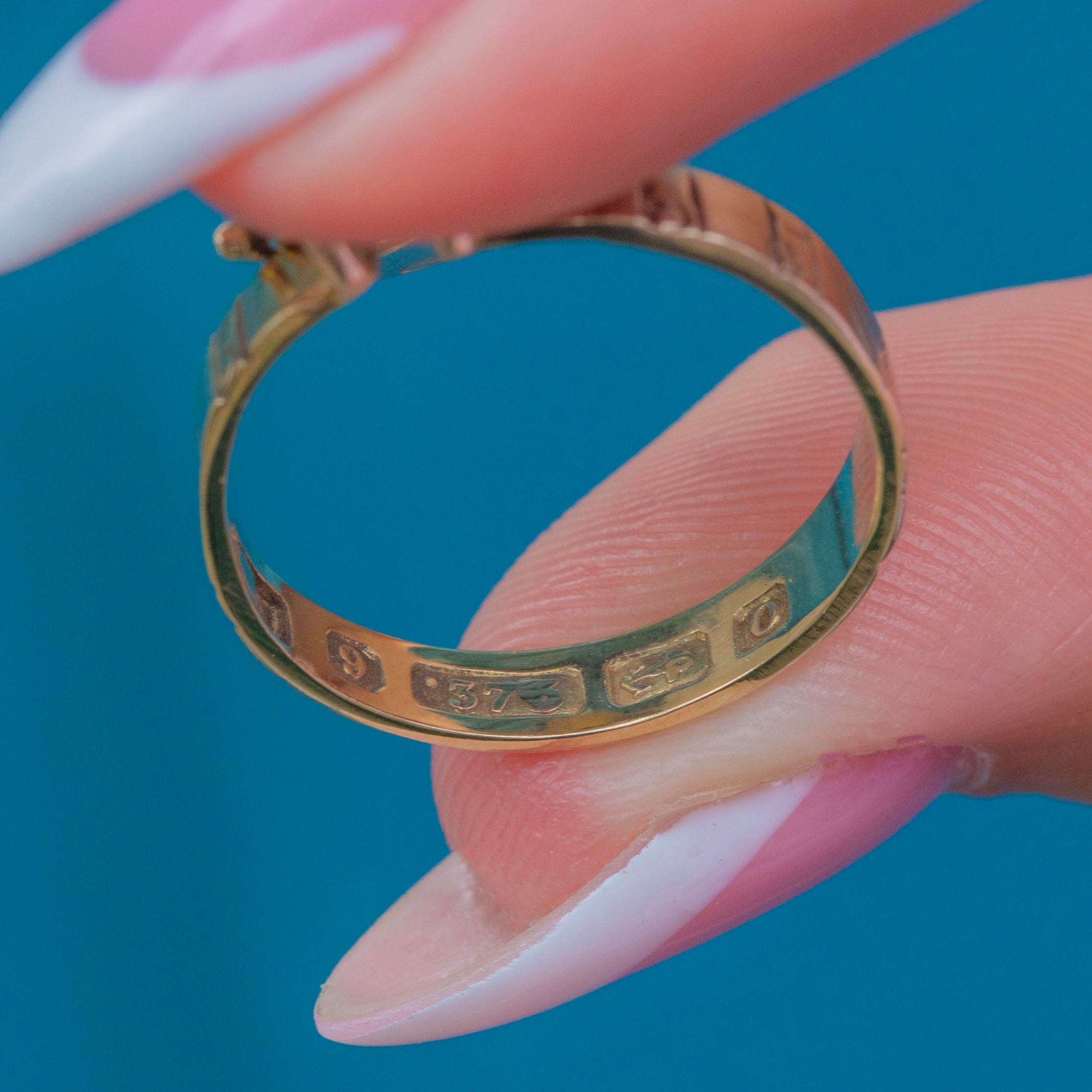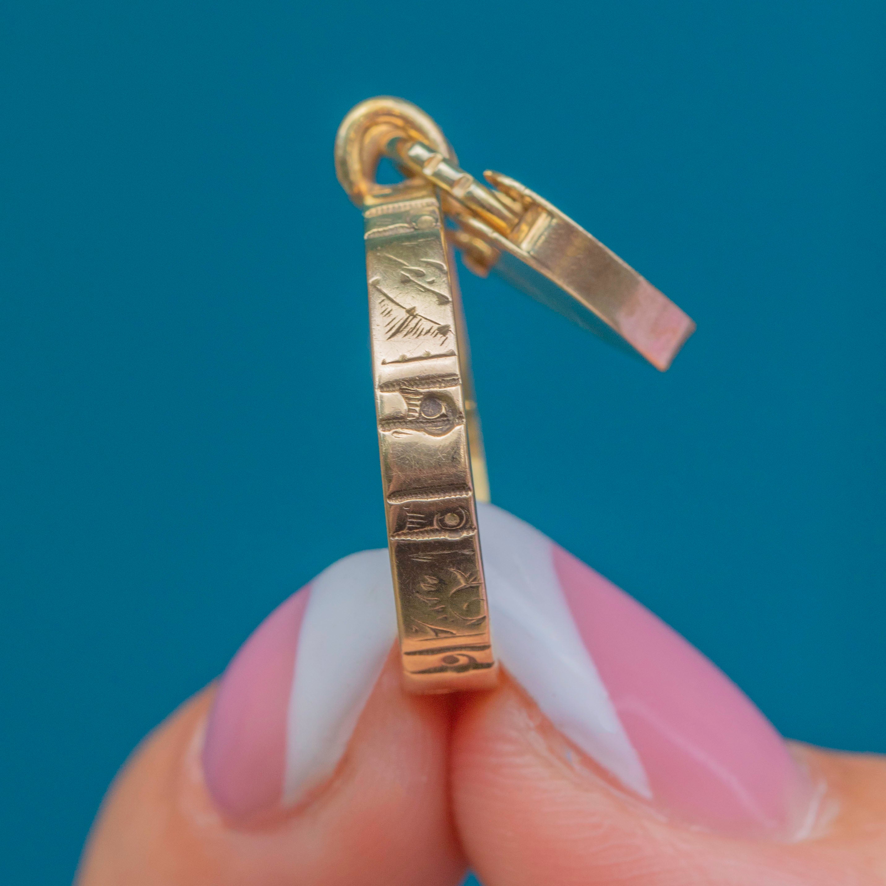 VERY GOOD-EXCELLENT: The Gold is bright and buttery and the band is robust, allowing you to wear this unique antique padlock ring with absolute confidence. There is some wear to the engravings commensurate with age. The ring comes complete with a full set of English hallmarks inside the band, allowing us to accurately date her to 1913!