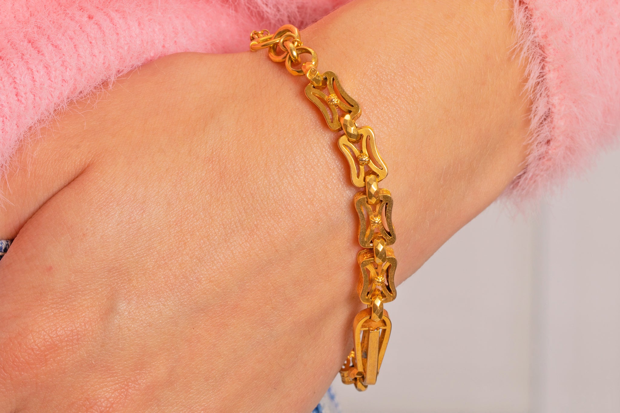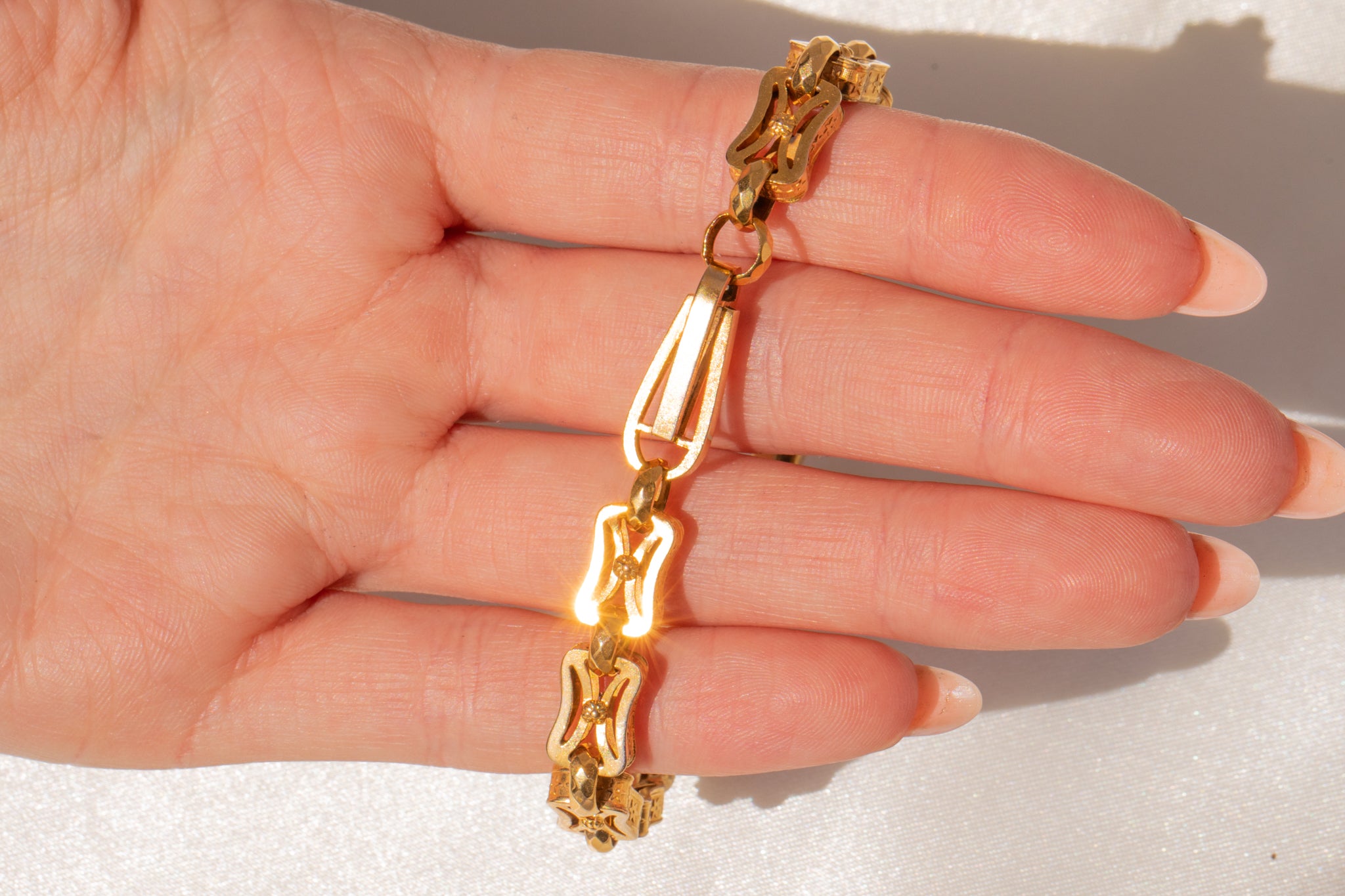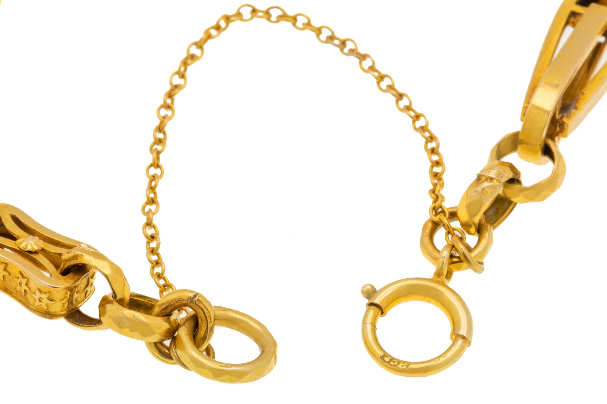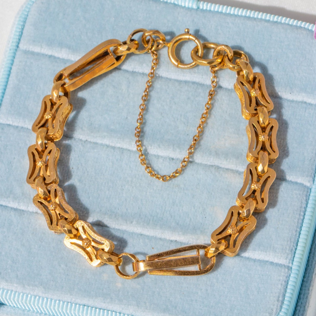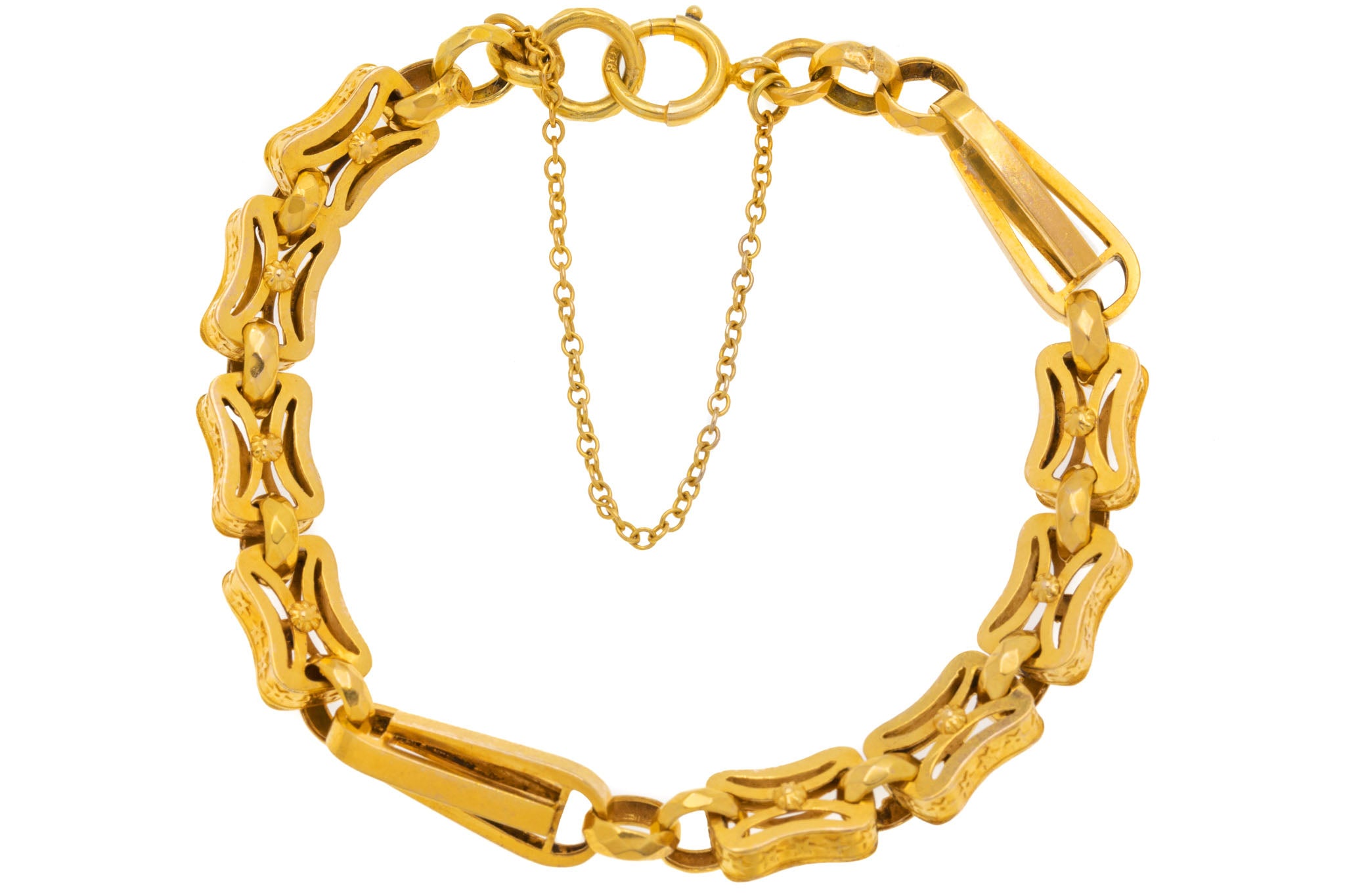 EXCELLENT. This antique 9ct Gold fancy bracelet is in excellent condition! Each link is securely connected and has a rich buttery tone running throughout her 7-inch length. The bolt ring is in perfect working order, and with the extra safety chain, she can be worn with confidence. Boasting undeniable antique charm, she can't be missed!