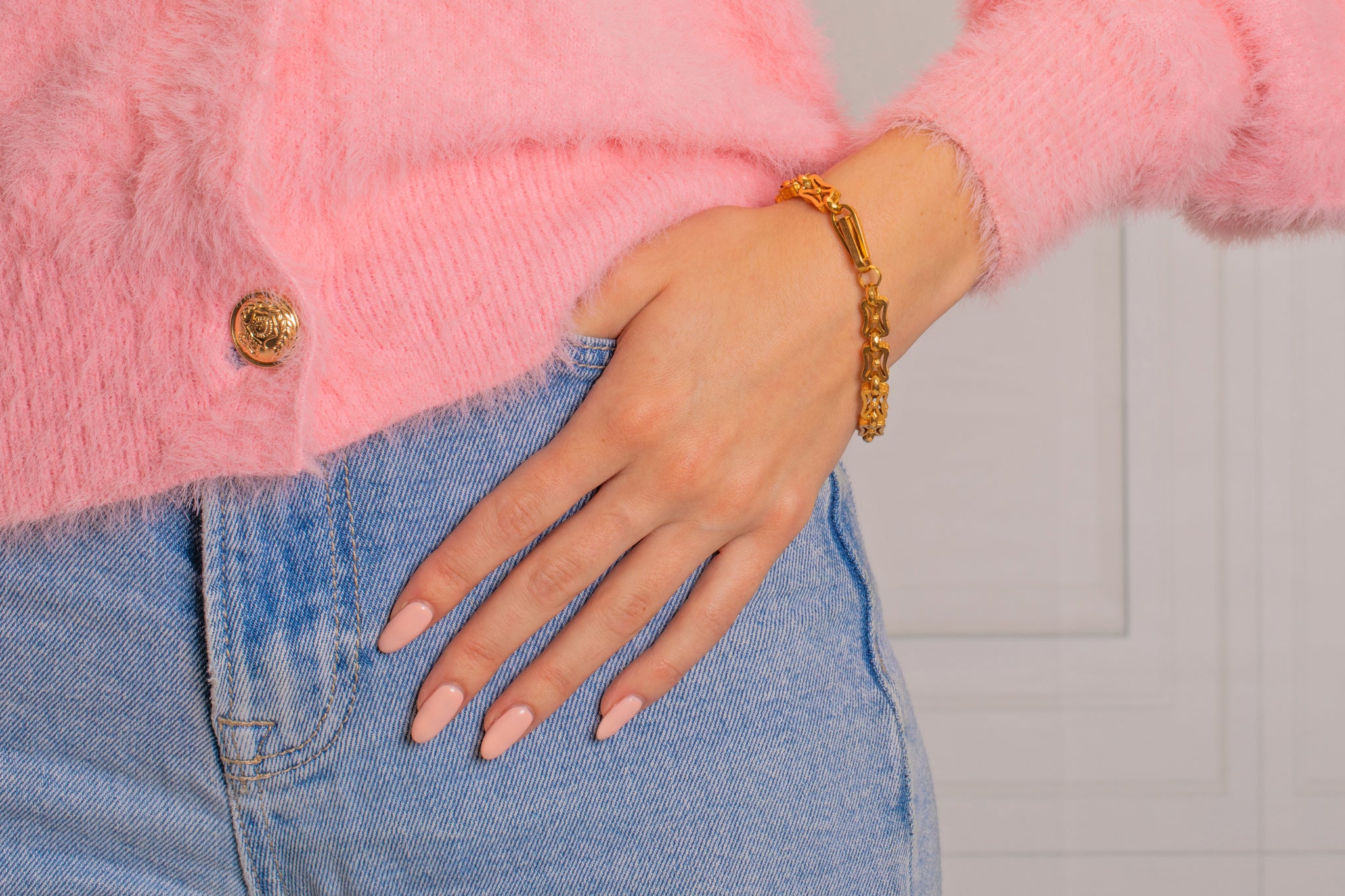 A statement piece of wrist candy, this Victorian Gold bracelet looks sublime as a stand-alone piece, and with her impressively sized antique bolt ring you can even add a charm for a personal touch!