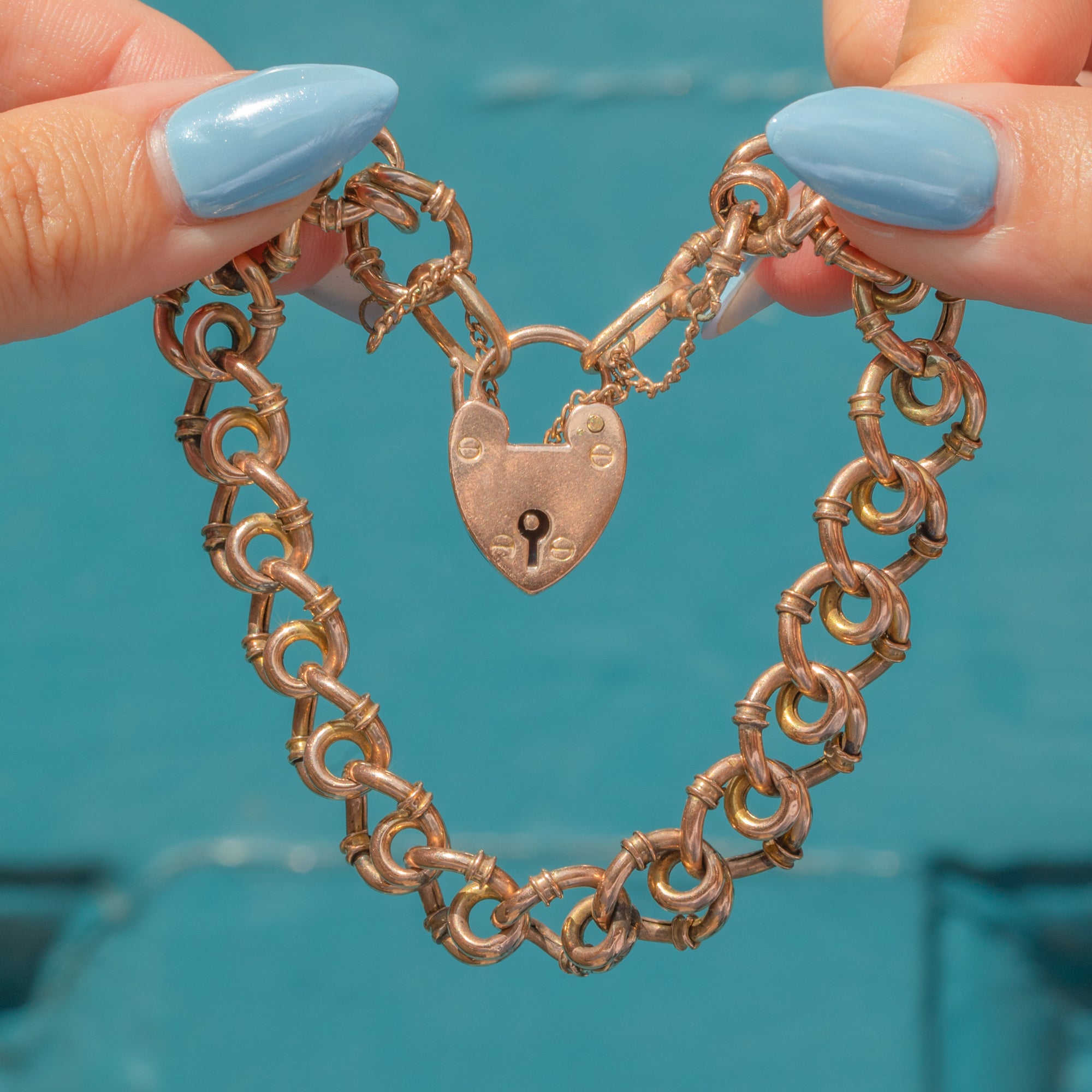 The bracelet closes with a solid Gold heart padlock, symbolic of love and an unbreakable bond, making this antique Gold bracelet the perfect token of love! Suited to daily wear, this fancy curb chain bracelet will add an ample splash of Gold to your attire.
