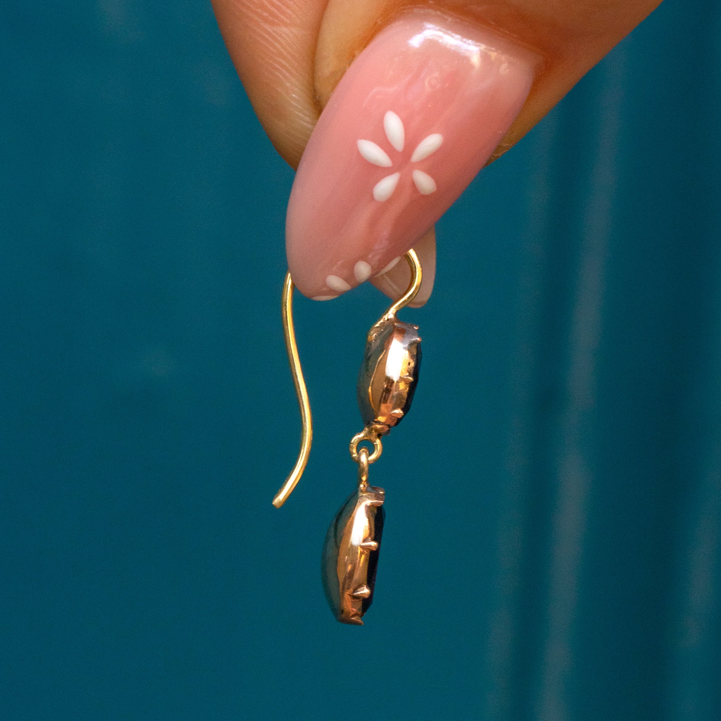 VERY GOOD. These Georgian 9ct Gold flat-cut Garnet earrings are in very good condition. These pretties have deliciously hued flat-cut Garnets, foiled to perfection. There are some notable chips to the bottom Garnet on one of the earrings, visible under close inspection. With slender and generously sized 15ct Gold hooks, you can wear these sumptuous Georgian earrings comfortably and confidently!