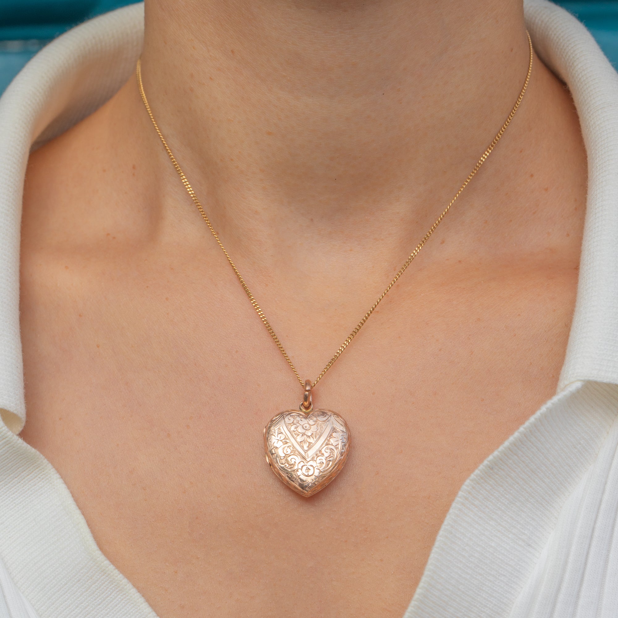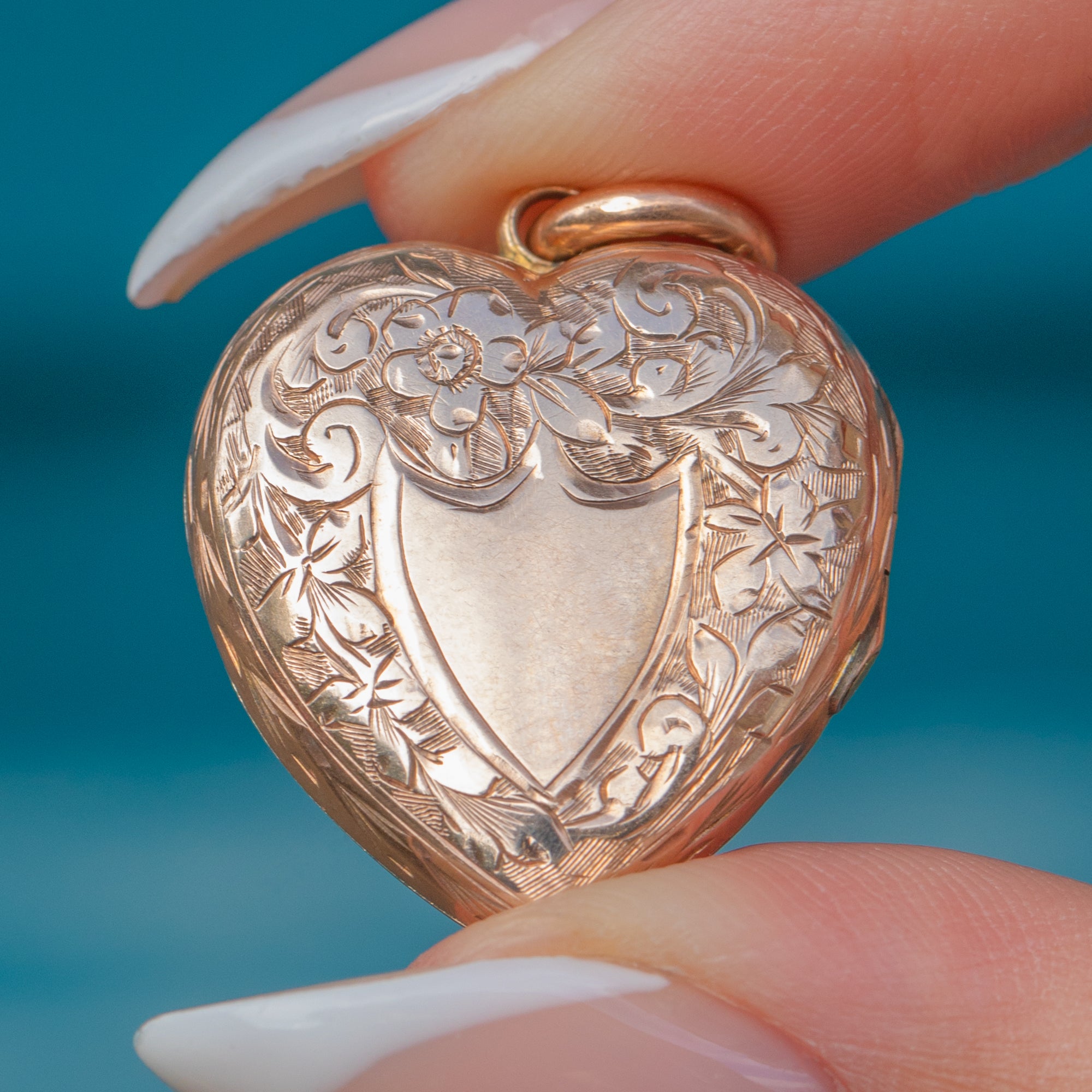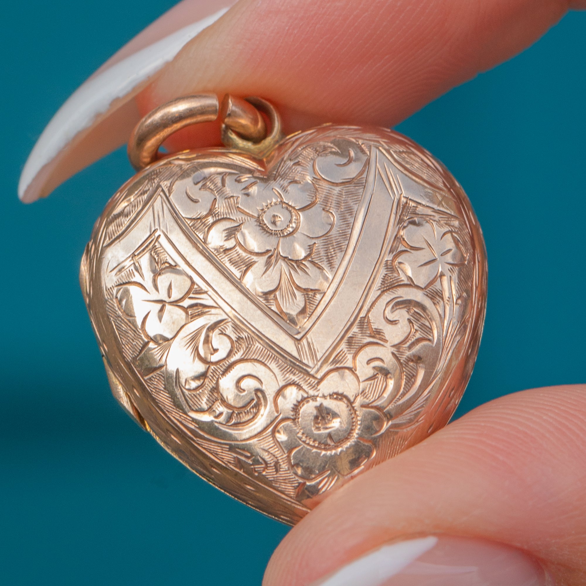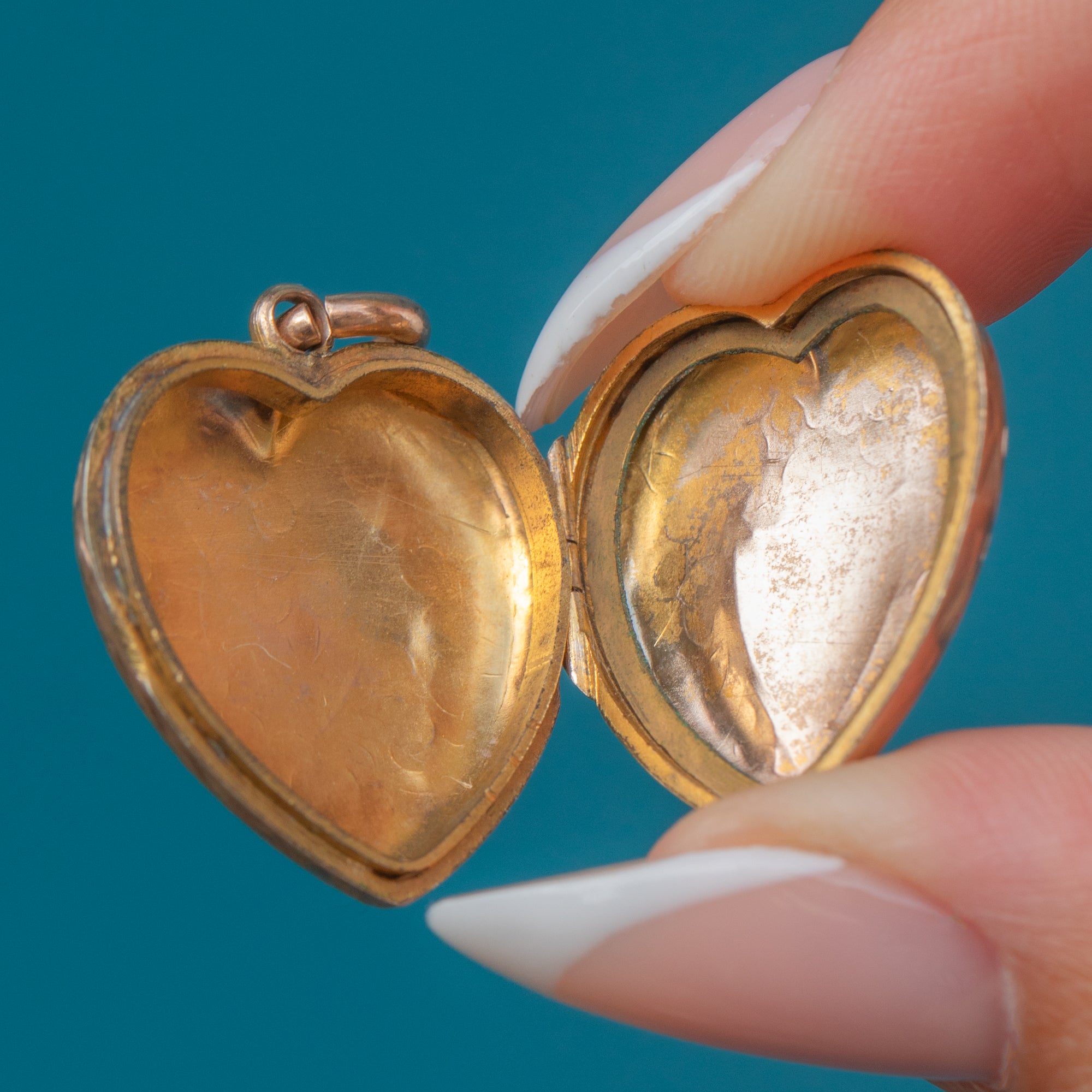 EXCELLENT. This Victorian 9ct Gold heart locket is in excellent antique condition. The engraving is crisp, the hinge is secure, and it closes with a satisfying click. Both internal frames remain intact.