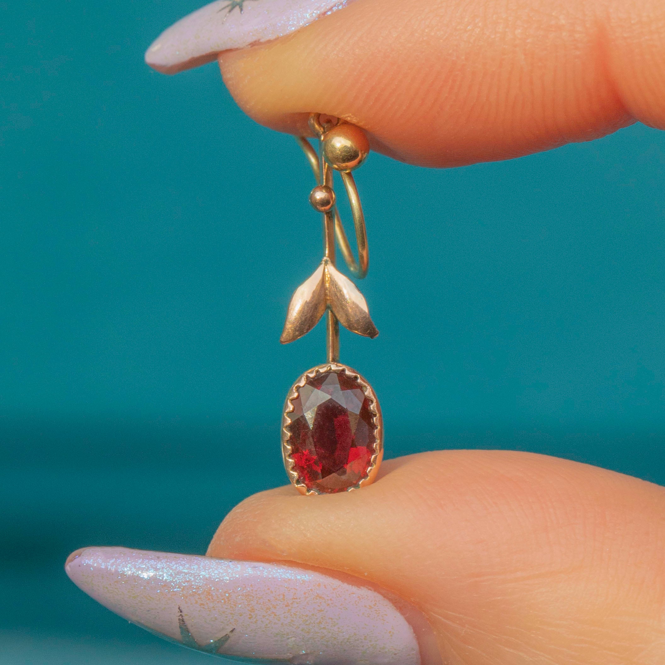 Crafted from buttery 9ct Gold, each Edwardian drop earring features a stunning Garnet, radiating gorgeous deep scarlet hues as they catch the light. Each earring is complete with leaf details adorning the Garnet, making them into dainty floral motifs.