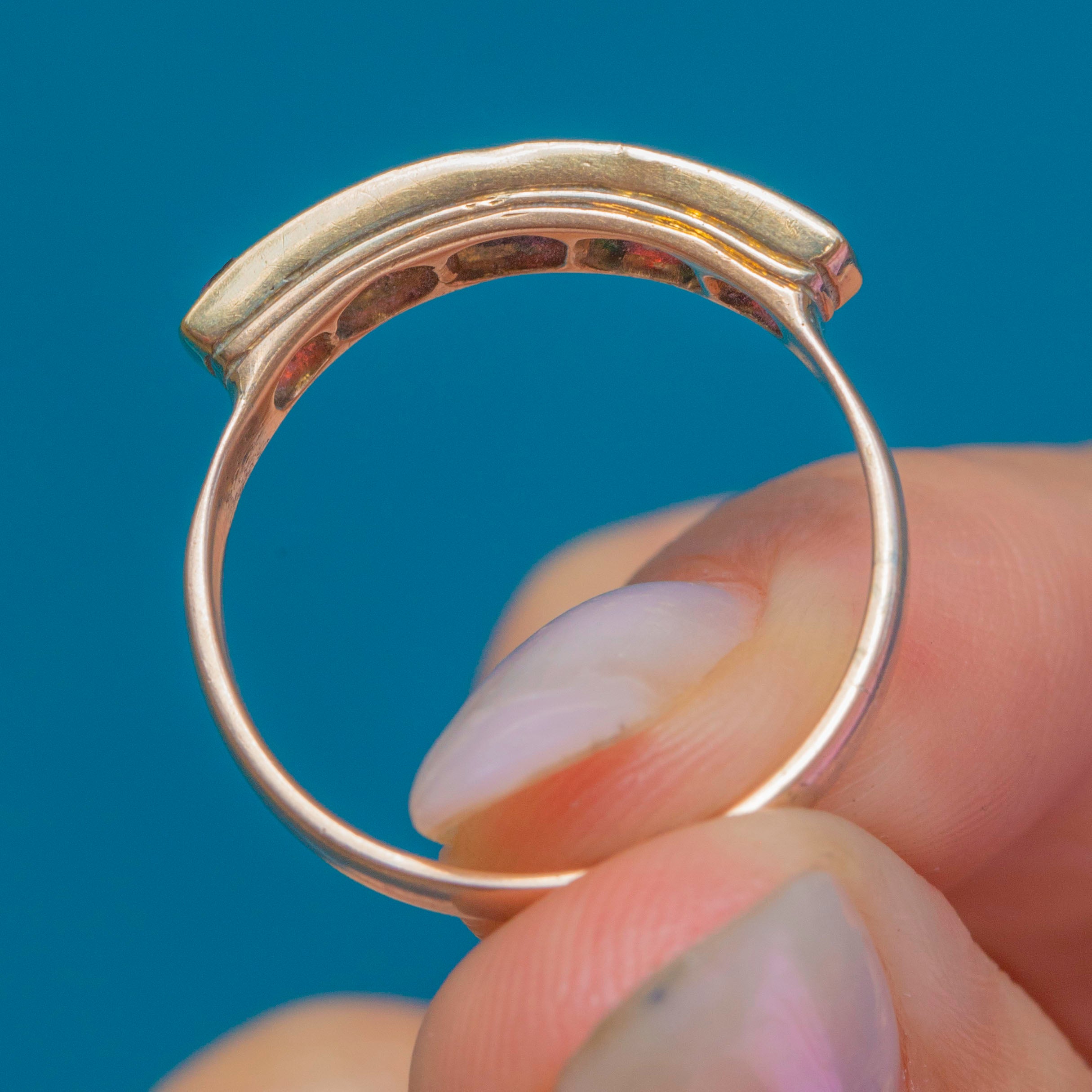 We love this Victorian five stone Garnet ring! Boasting 1.75 carats combined, the Garnets project a seductive crimson hue, set in a 9ct Gold panel that spreads the width of the finger, providing wonderful coverage.