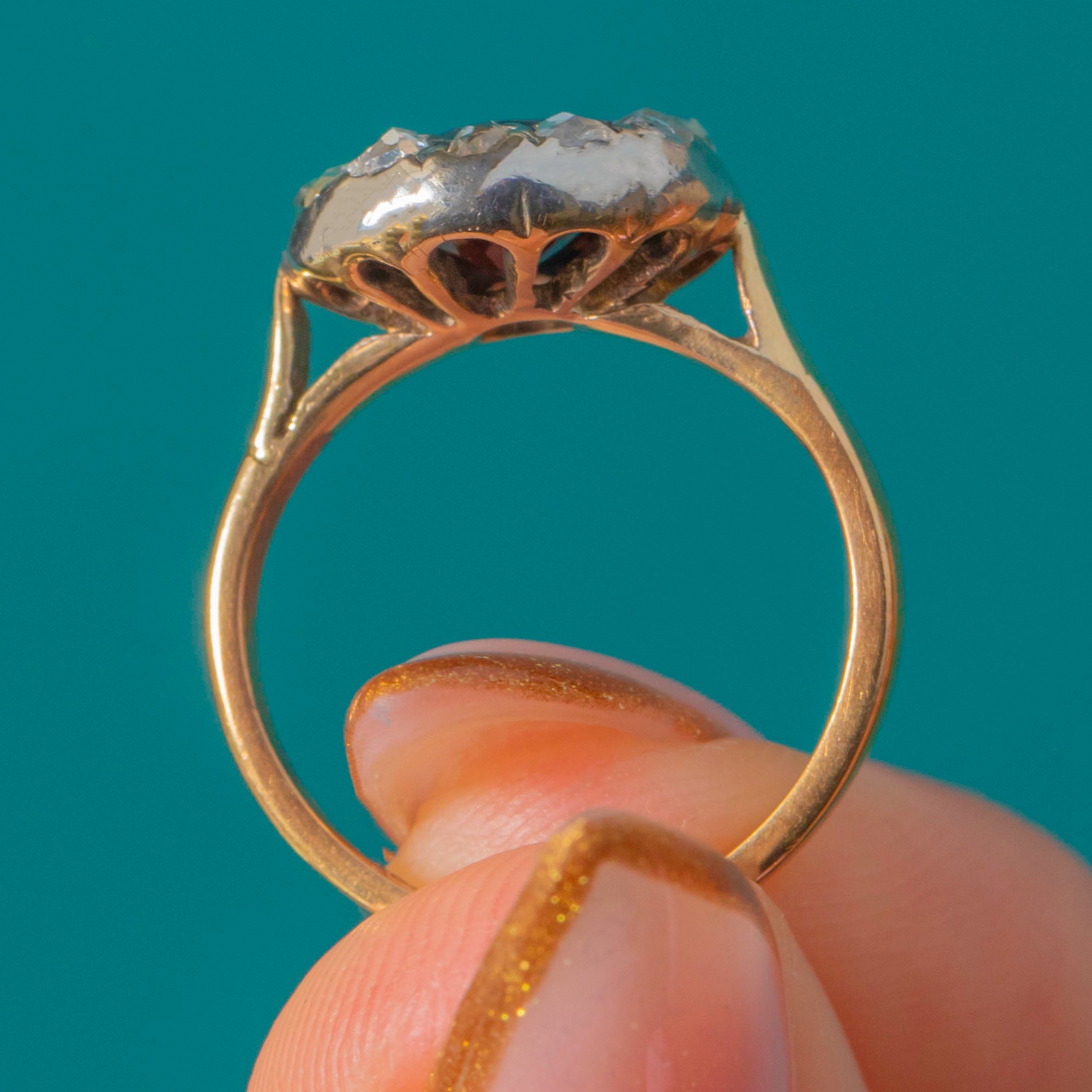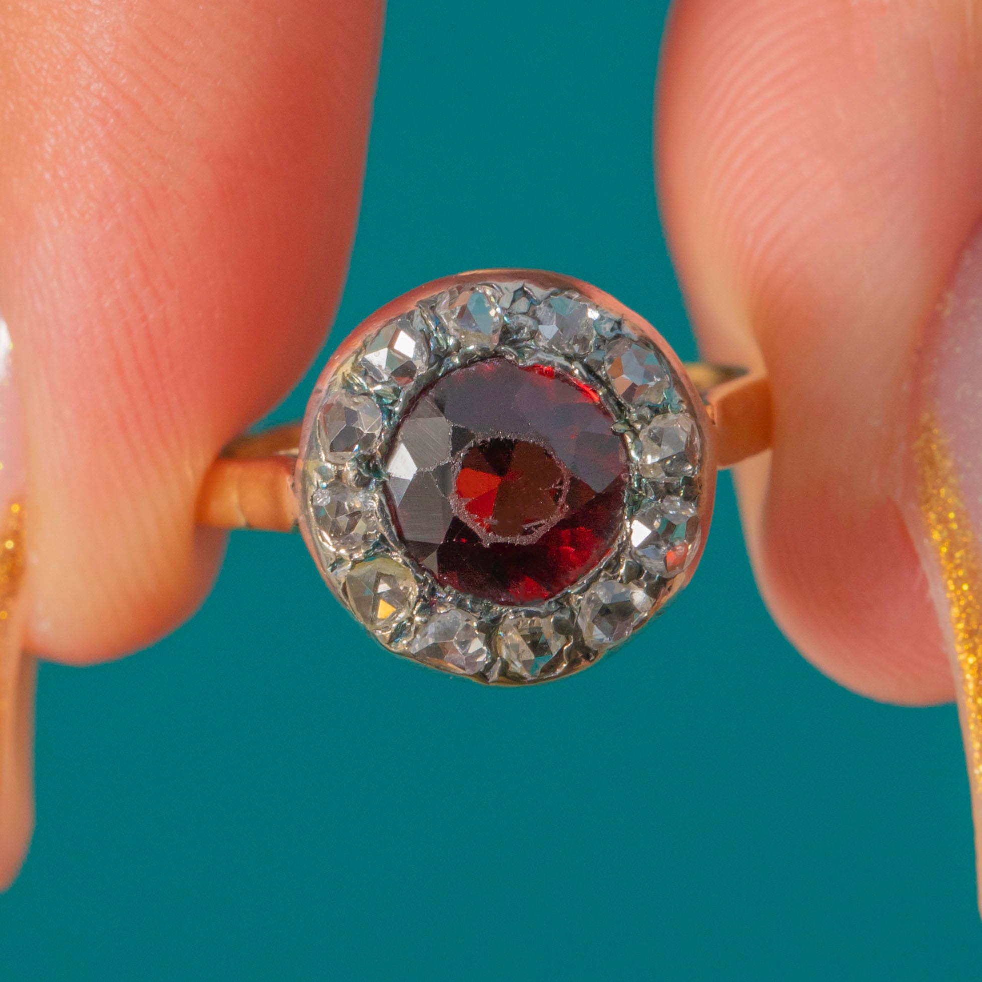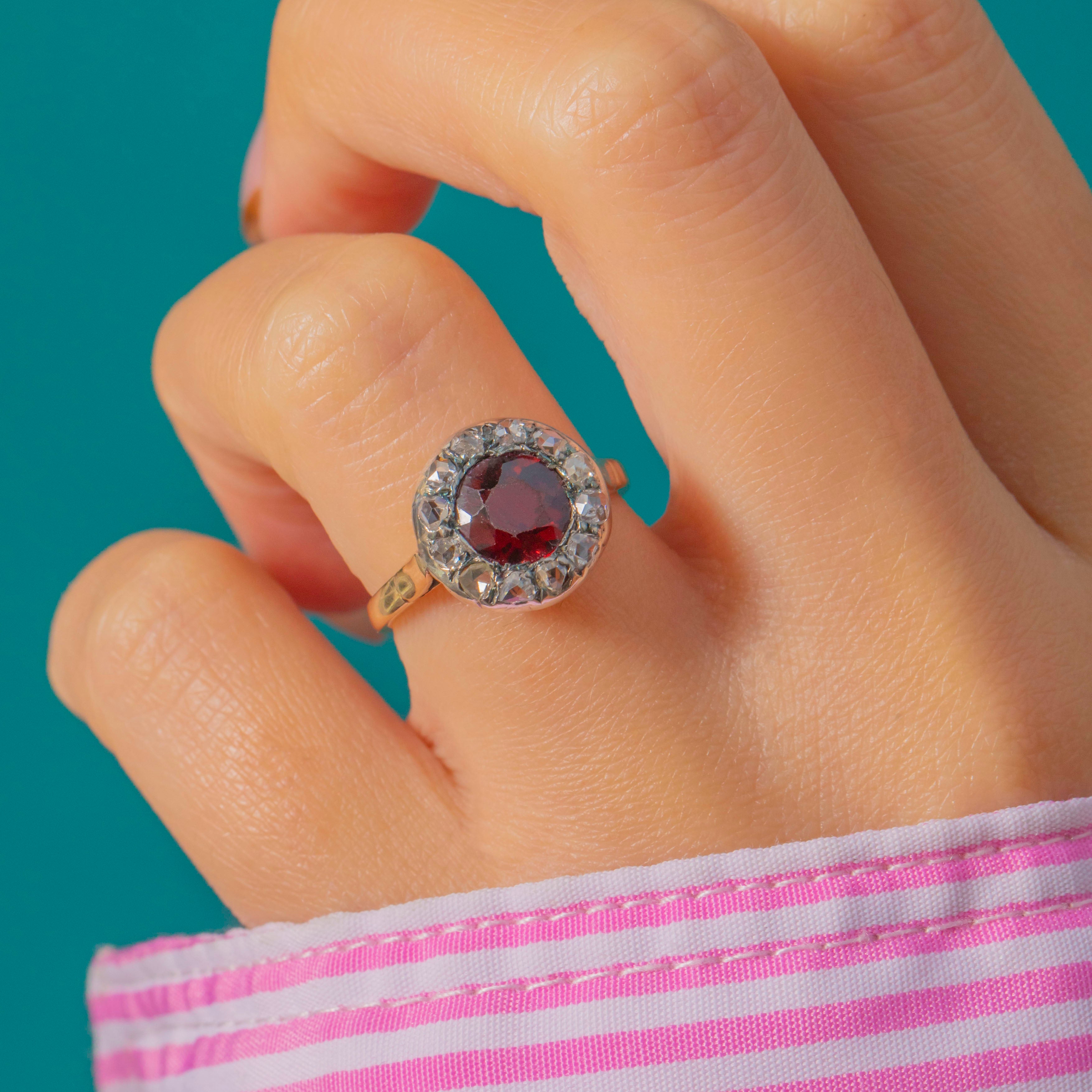 The centre Garnet is approximately 0.70ct, its deep hue intensified by the handmade antique setting. Around it, twelve petite rose-cuts (approx. 0.25ct combined) twinkle with that distinctive old-world sparkle. We love the pretty floral, openwork gallery—an elegant finishing touch that looks as beautiful from the side as it does from the top.
