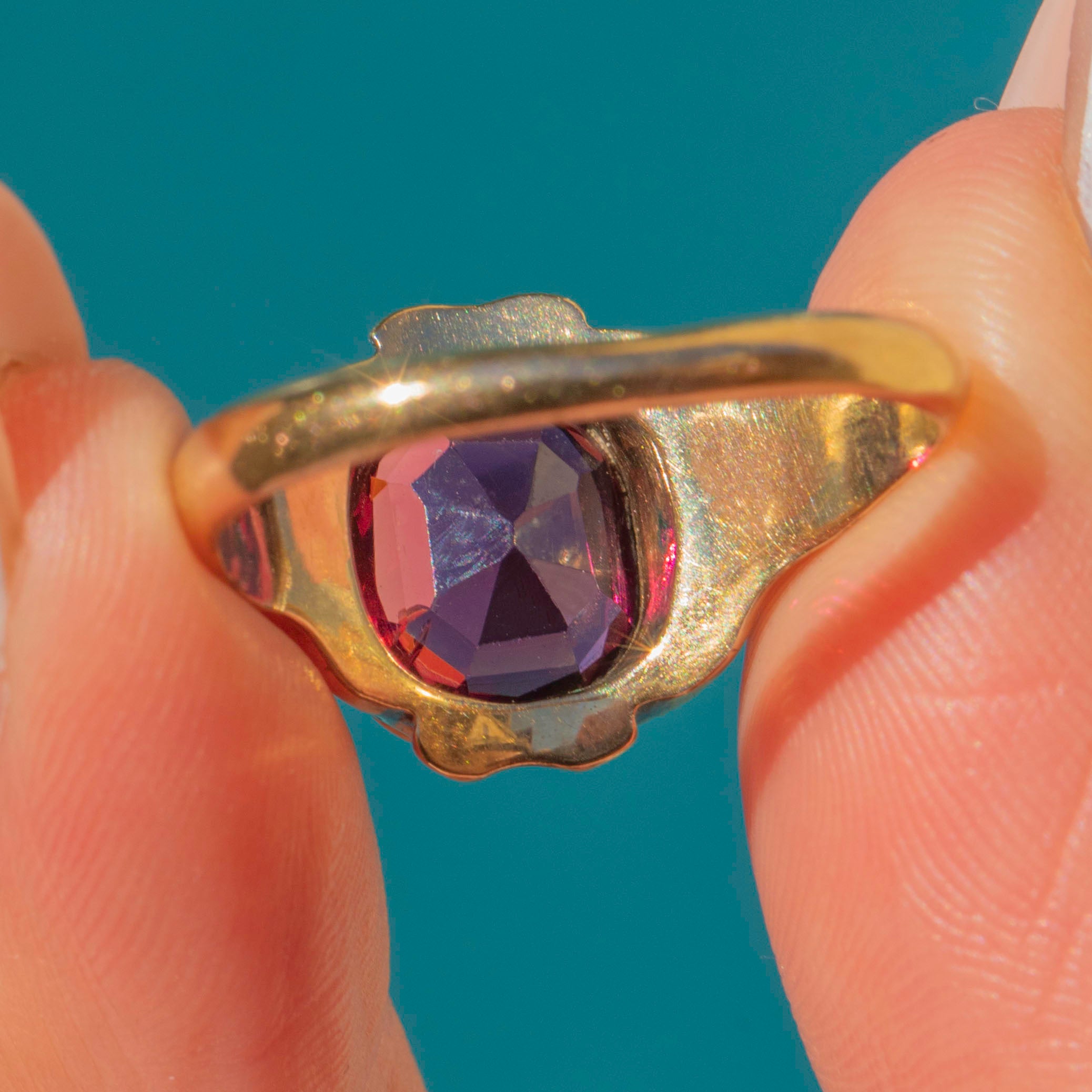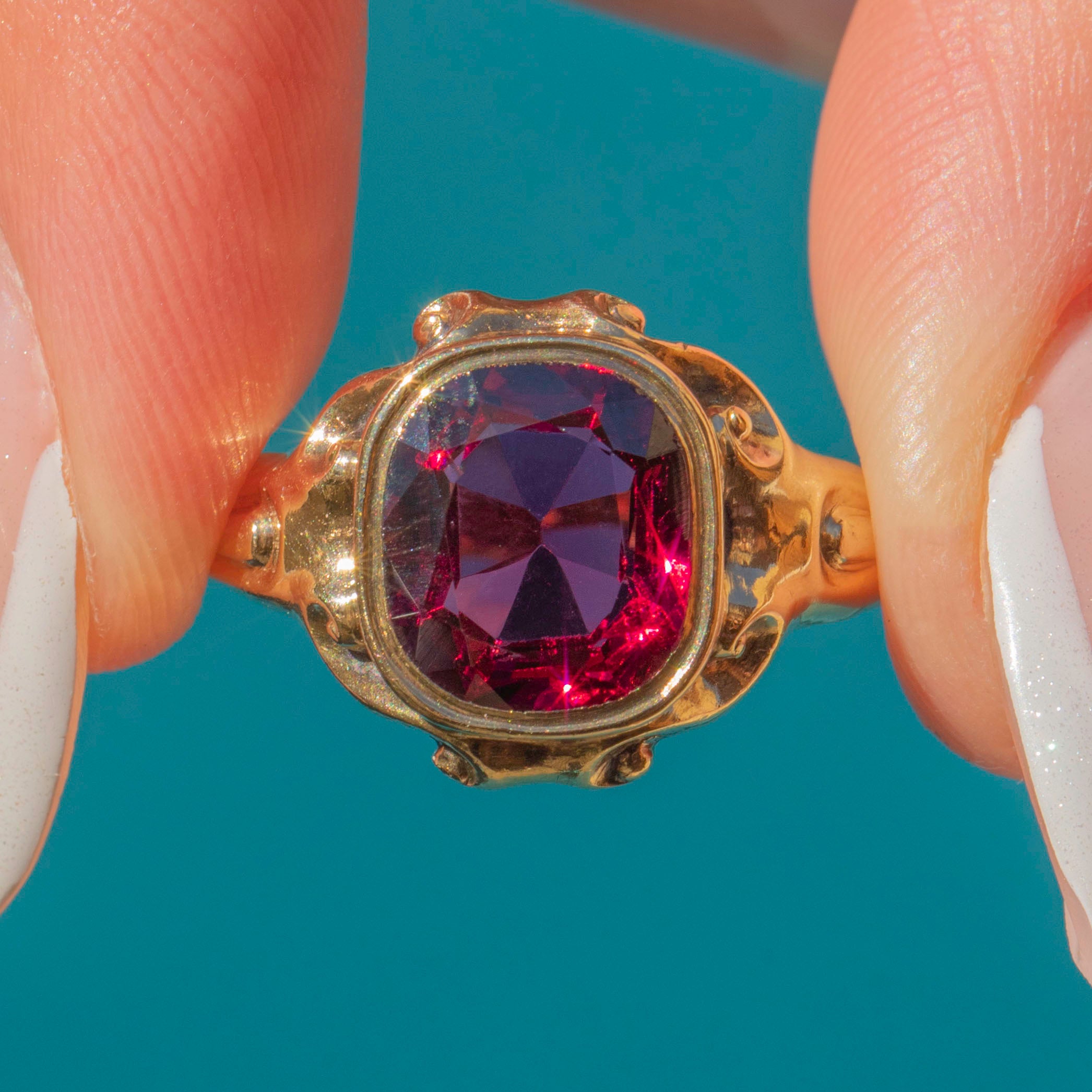 Encapsulating the essence of Victorian glamour, this antique 9ct Gold Garnet signet ring is sublime! Offering a fabulously faceted 1.30ct Garnet, flaunting deep sangria sparkles, nestled within a chunky 9ct Gold bezel setting to create a stand-out design.